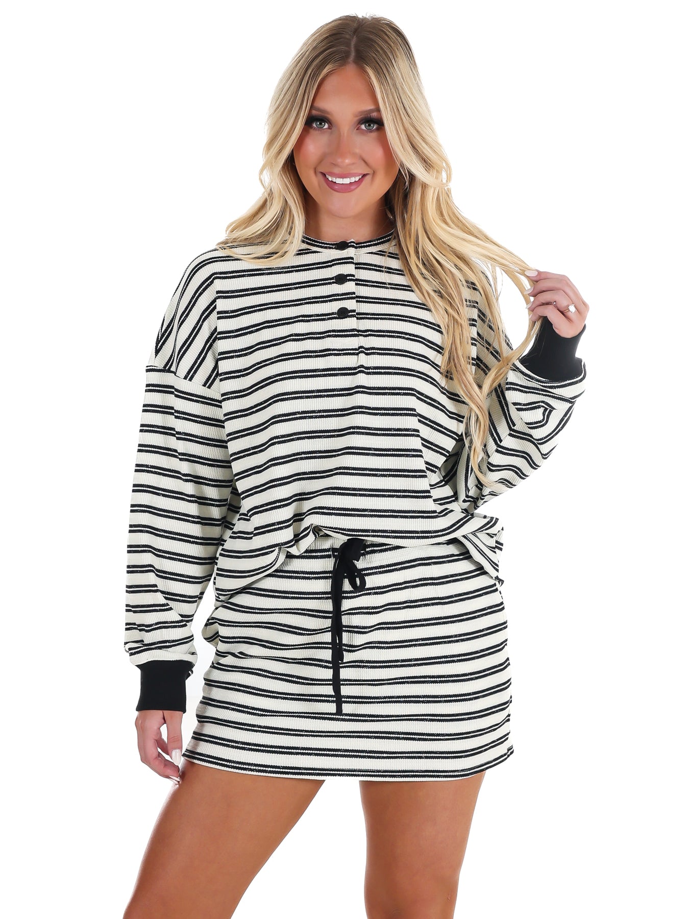 Get ready to turn heads in this fun stripe two-piece set that's basically two outfits in one. The cozy round-neck pullover pairs perfectly with the flirty mid-rise mini skort for a look that's equal parts playful and put-together. Wear them together for coordinated vibes or split them up to remix your wardrobe—either way, you're winning the style game.