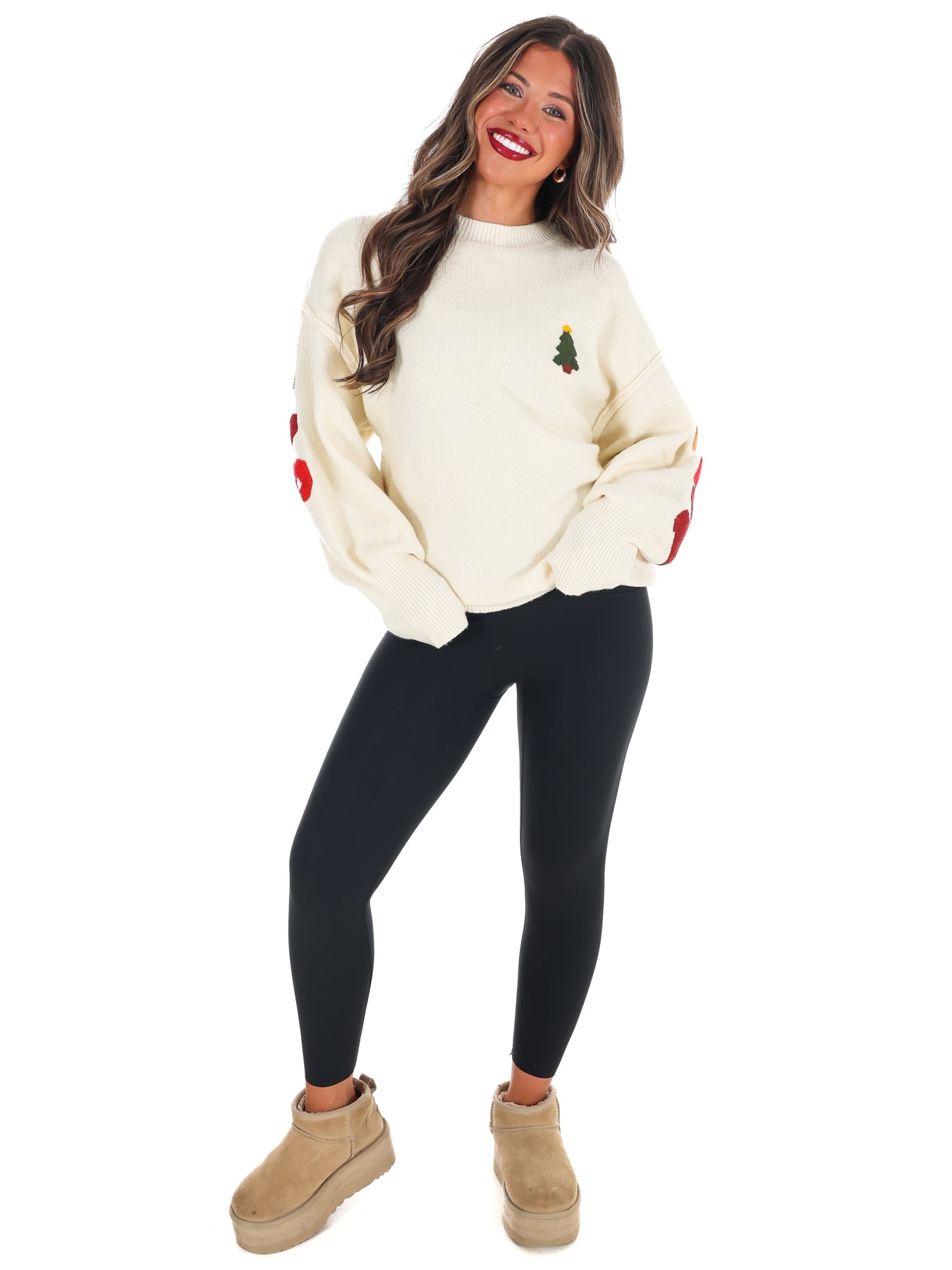 Get into the holiday spirit with this festive crewneck knit sweater that's bursting with Christmas charm. Colorful chenille letters spelling "Merry Christmas" grace the back, while a cheerful Christmas tree adorns the front. Crafted from soft, comfortable knit fabric, it's the perfect piece for spreading joy at holiday parties, family gatherings, or casual seasonal celebrations. The playful design and vibrant details make it an instant conversation starter that captures the magic of the season in style.