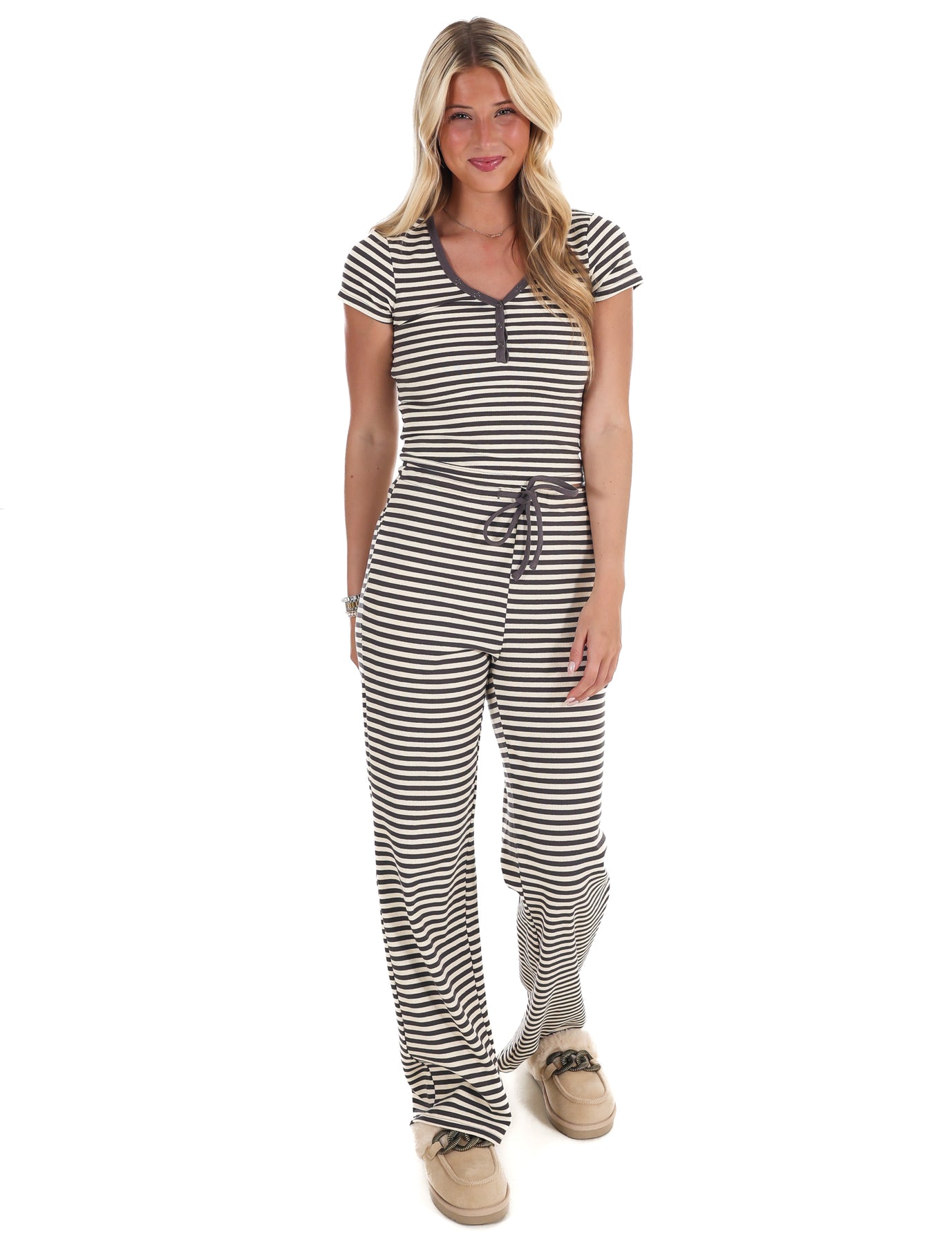 Meet your new favorite lazy-day essential! These Sweet Intentions lounge pants combine playful stripes with a cozy ribbed texture that feels like a warm hug. The drawstring waist gives you total control over the fit, so you can adjust it to your comfort level. Perfect for everything from binge-watching marathons to quick coffee runs, these pants prove that comfort and style can absolutely be best friends.