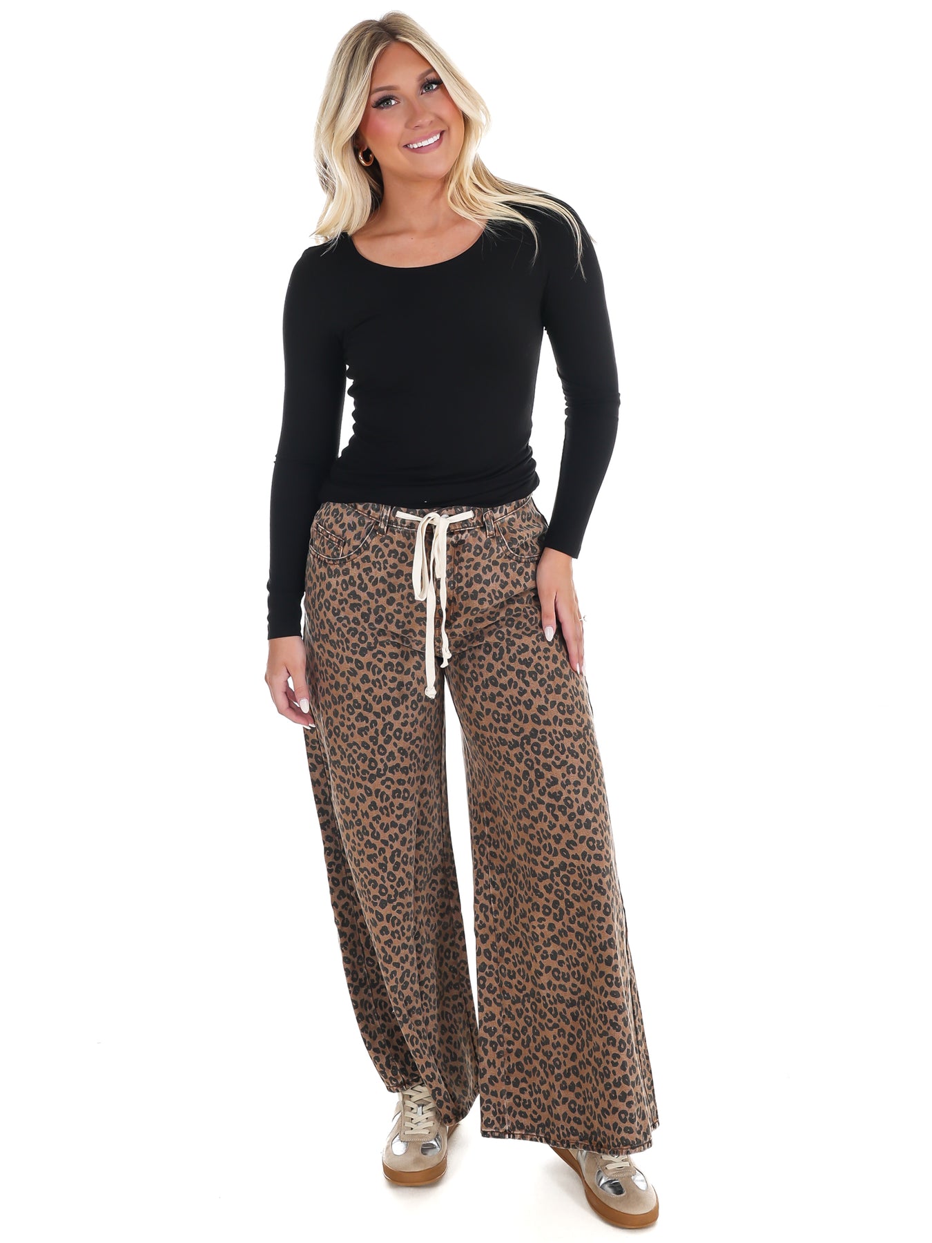 Strut your stuff in these bold leopard wide leg pants, designed to pair perfectly with the Take A Chance Leopard Jacket for a head-turning coordinated look. Adjustable drawstrings let you customize the fit while the relaxed silhouette keeps you comfortable all day long. Mix, match, or wear as a complete set—either way, you're ready to make a statement. Leopard print that roars with confidence and style.