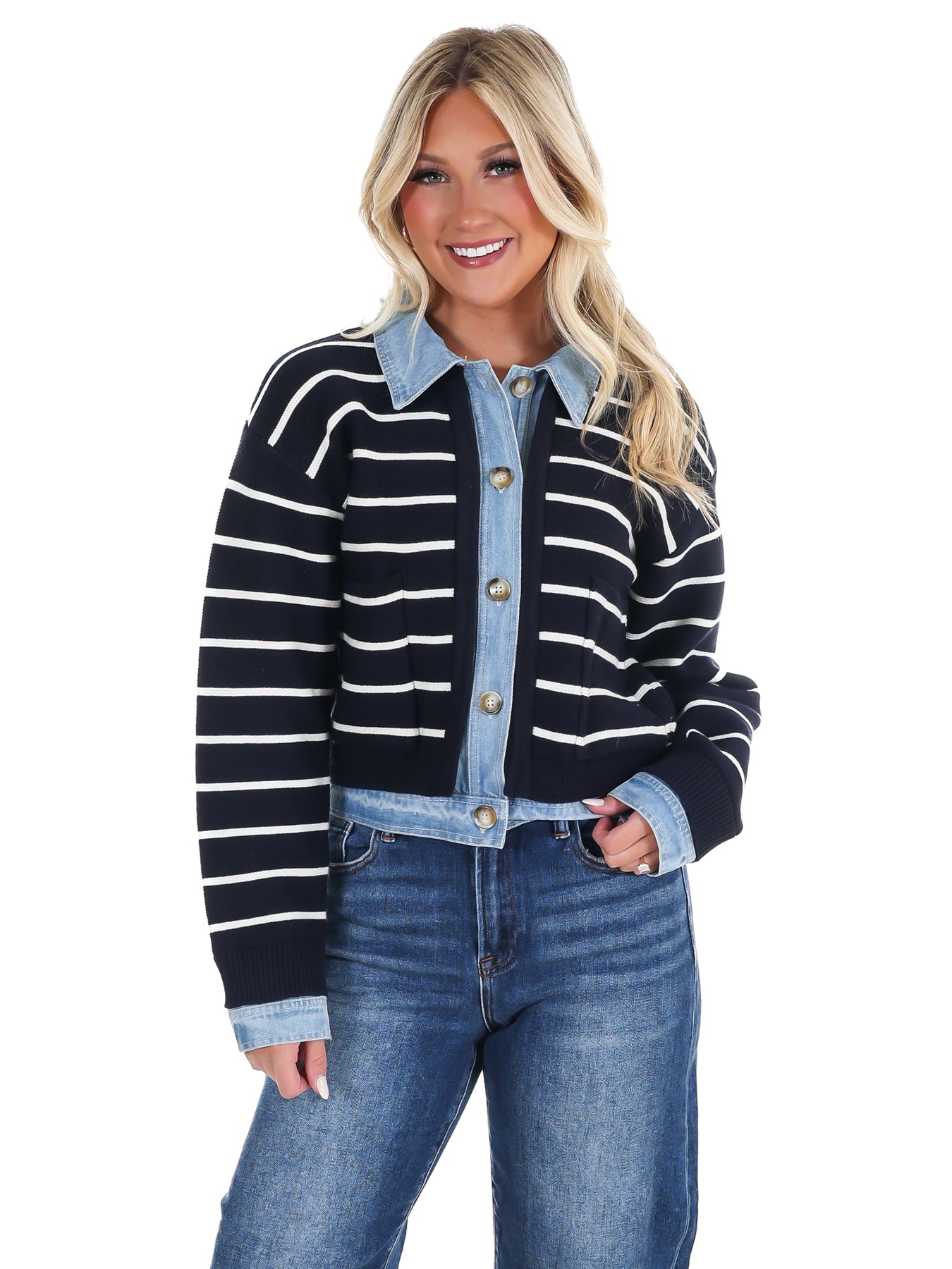Introducing the Soho Stripe Denim Cardigan—where cozy meets cool! This playful layering piece blends soft knit stripes with classic denim accents for a look that's effortlessly chic. Button down the front for easy styling, and rock those long sleeves whether you're heading to brunch or a casual night out. Mix textures, mix vibes, mix it all together. Your wardrobe just got way more fun!