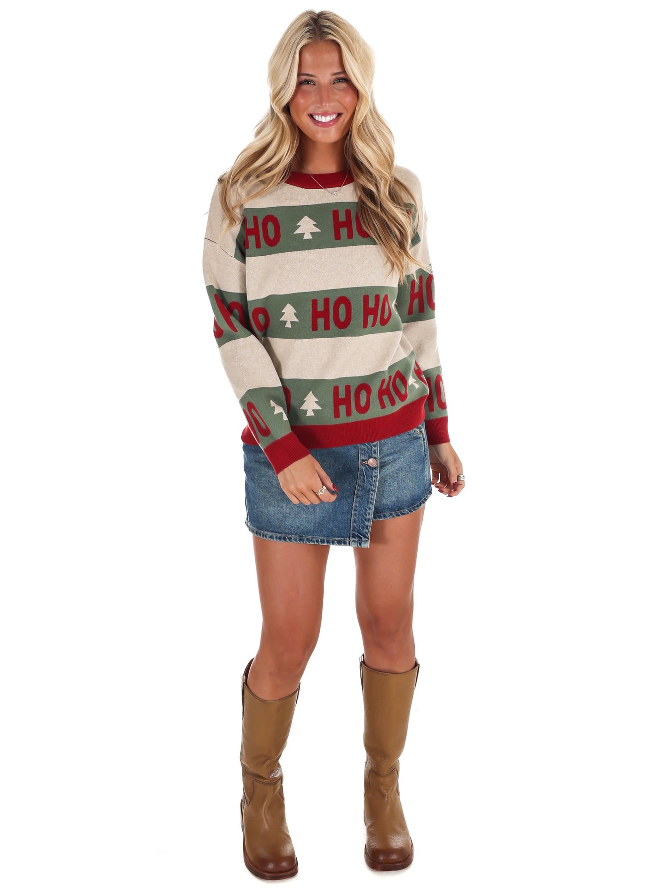 Embrace the festive spirit with this charming pullover sweater top, featuring a delightful color block stripe design adorned with a cheerful "HoHoHo" pattern. Perfect for spreading holiday cheer, this cozy piece combines comfort with seasonal style. The playful design makes it an ideal choice for celebrations, casual gatherings, or simply adding warmth and joy to your everyday wardrobe. Whether you're decorating, celebrating, or just enjoying the season, this sweater is here to support your festive moments in style.