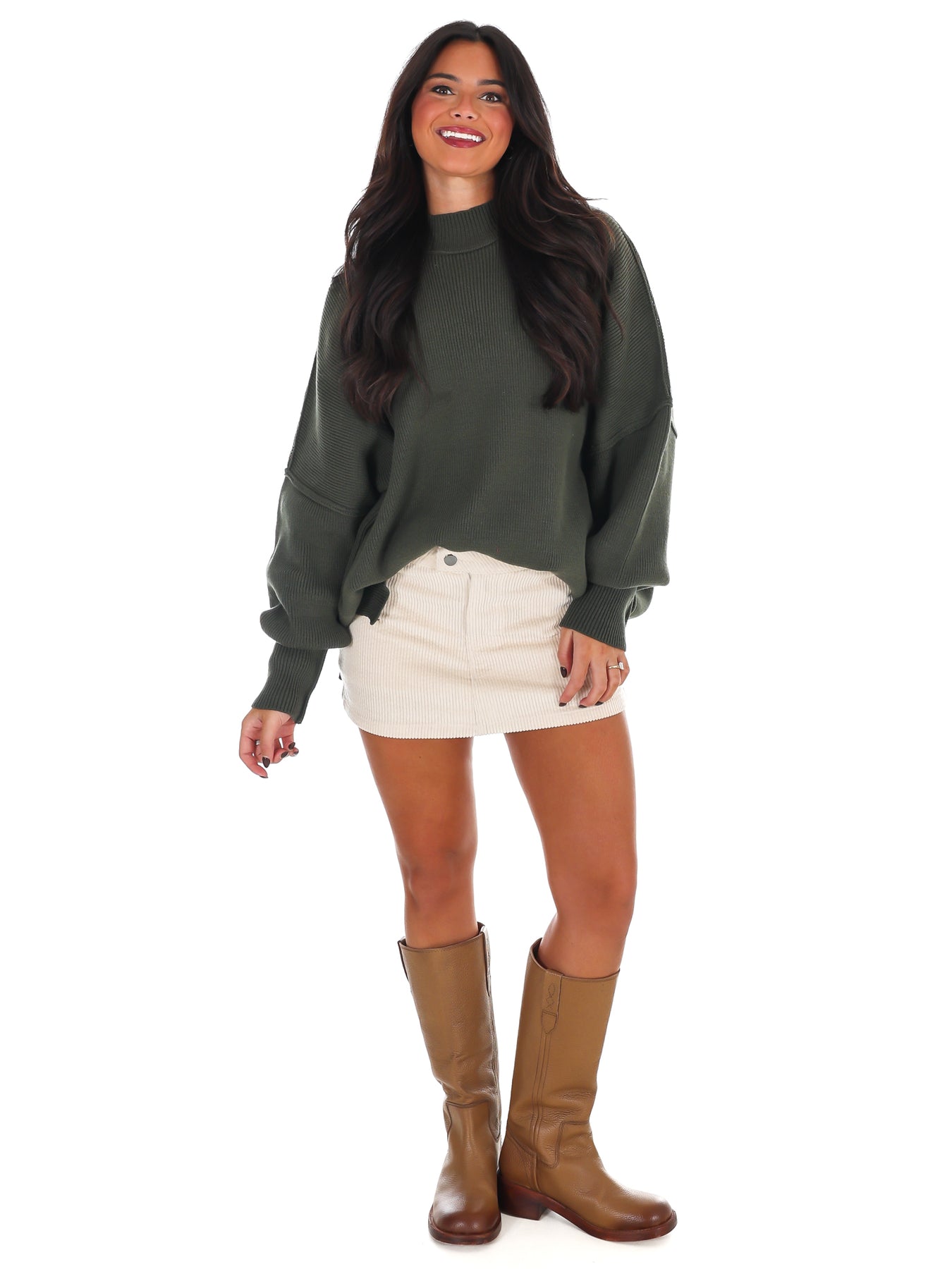 This oversized ribbed sweater is the perfect layer for cozy winter days! With a mock neckline, drop shoulder and side slits, you'll look effortlessly chic and be super comfy. Chilly days? No problem.