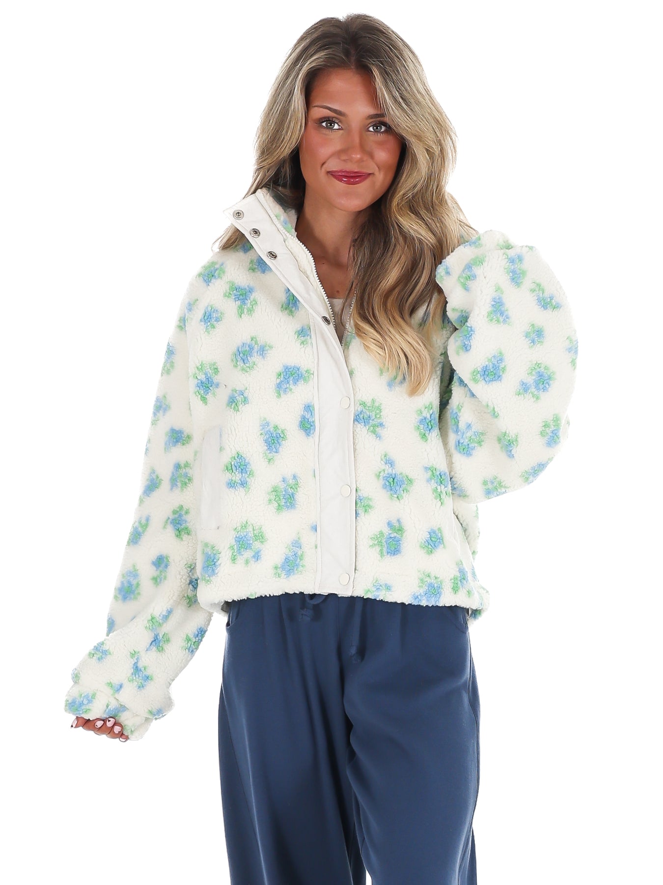 Snuggle up in style with this playful floral sherpa jacket—your new favorite layering piece! The ultra-soft sherpa lining and relaxed silhouette make it perfect for throwing on over a turtleneck or pairing with your go-to denim. Whether you're heading out for a casual day or enjoying a crisp evening breeze, this charming jacket brings warmth and whimsy to every moment. The cheerful floral print transforms simple outfits into something special, proving that comfort and style are the ultimate power couple.