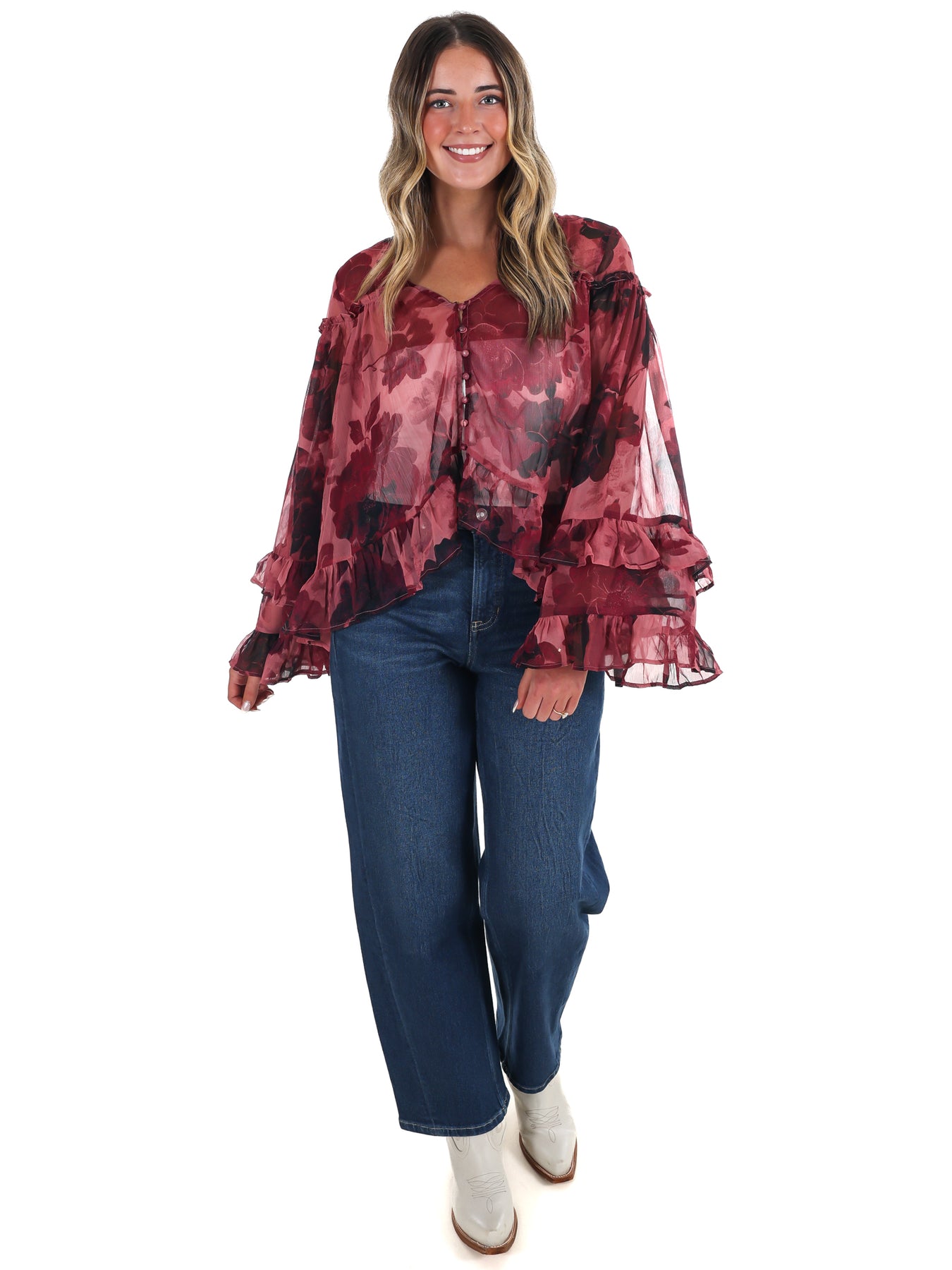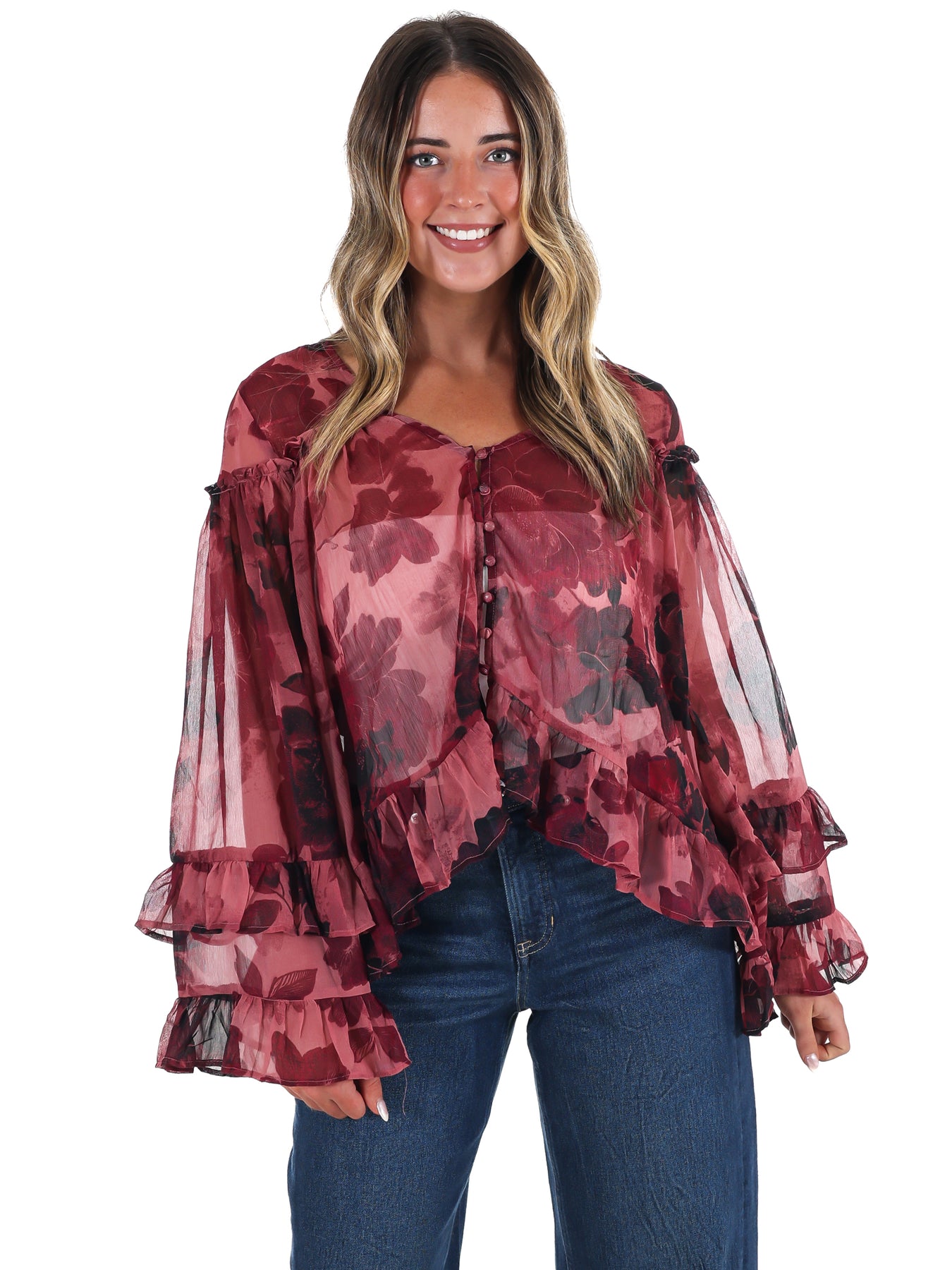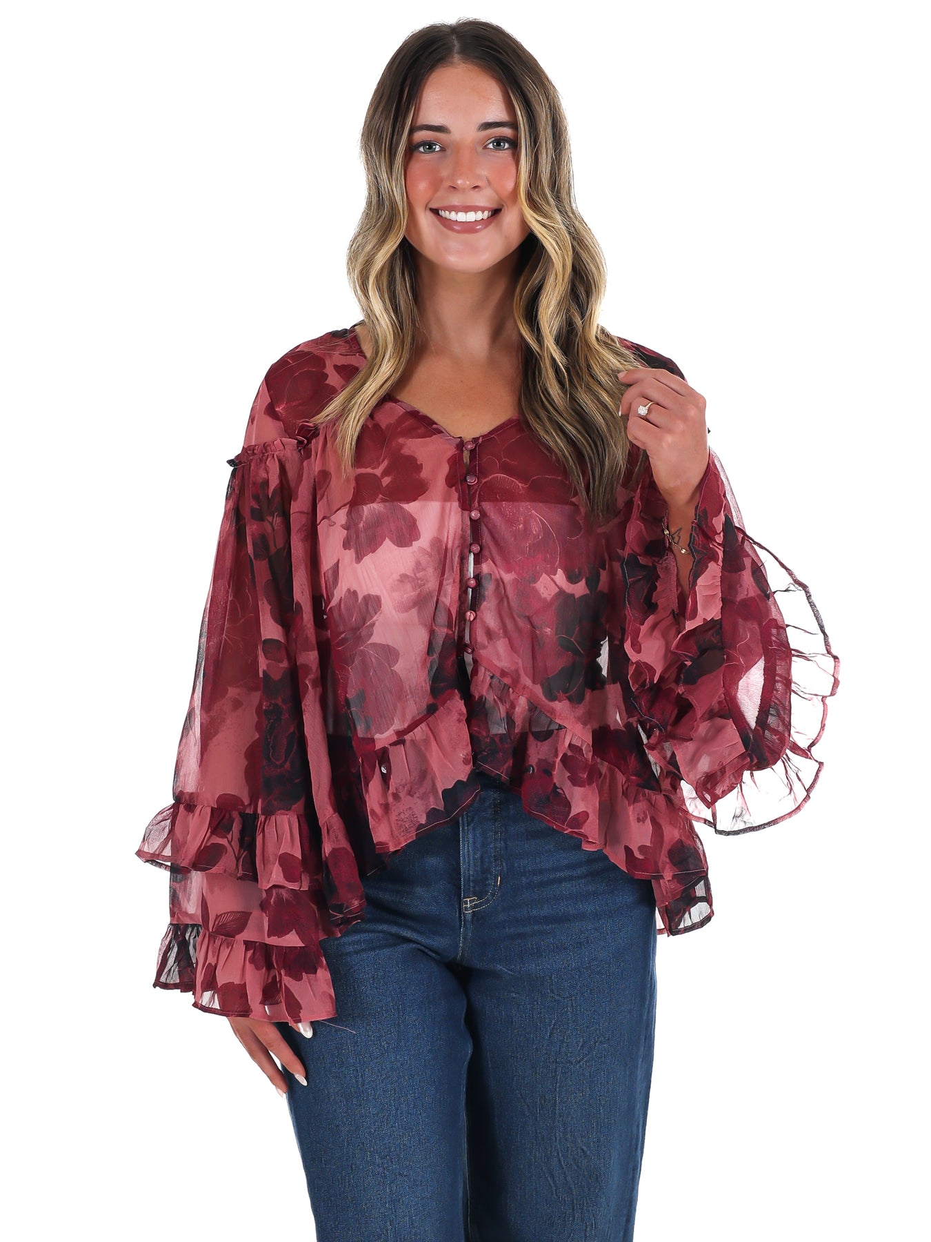This Free People Day Dreaming Blouse offers a soft, flowy fit that embraces a romantic vibe with vintage floral patterns and delicate ruffles. Its pullover design features a flattering V-neck and long blouson sleeves, combining comfort with timeless style—perfect for adding an elegant, feminine touch to your everyday wardrobe.