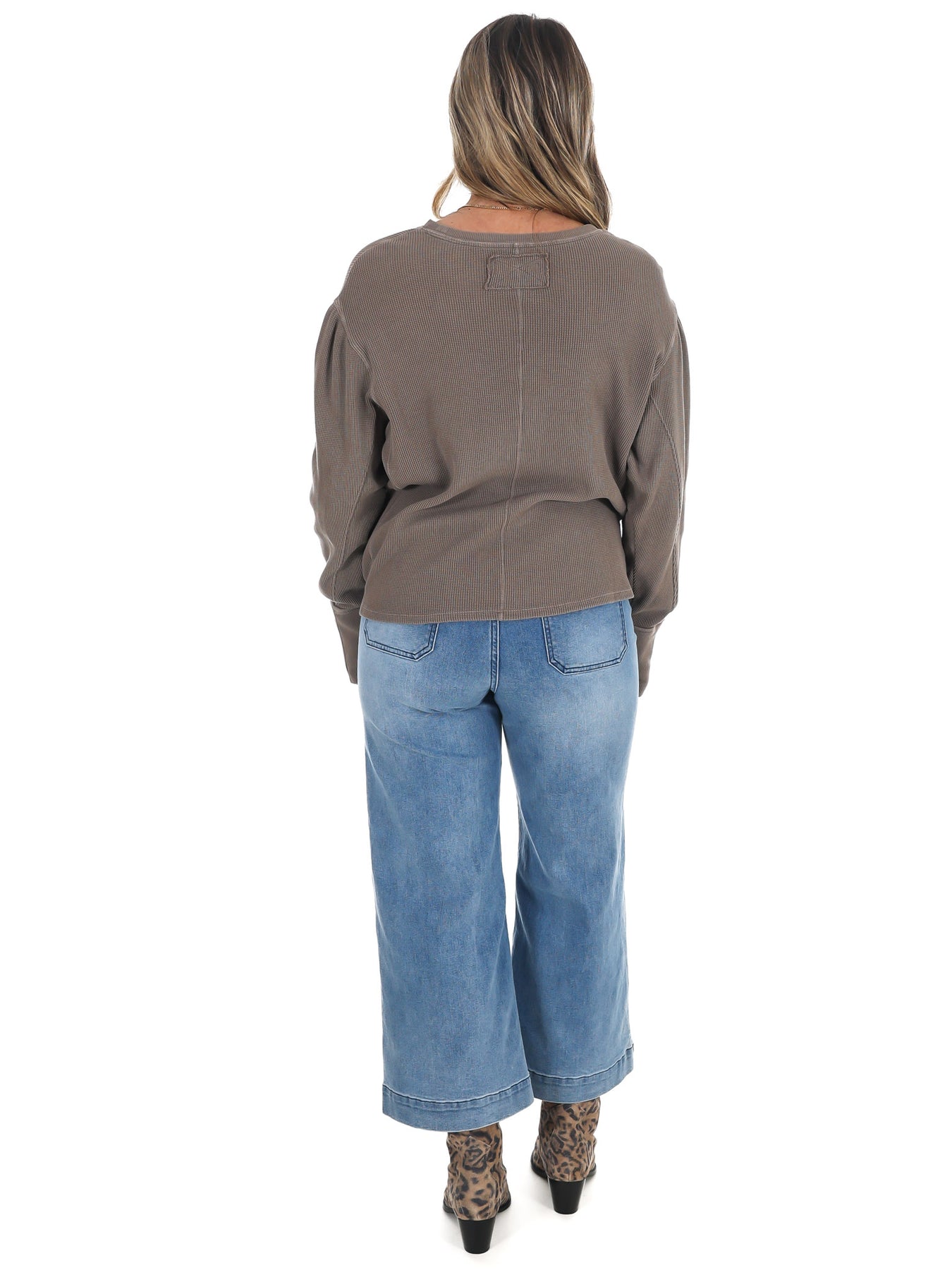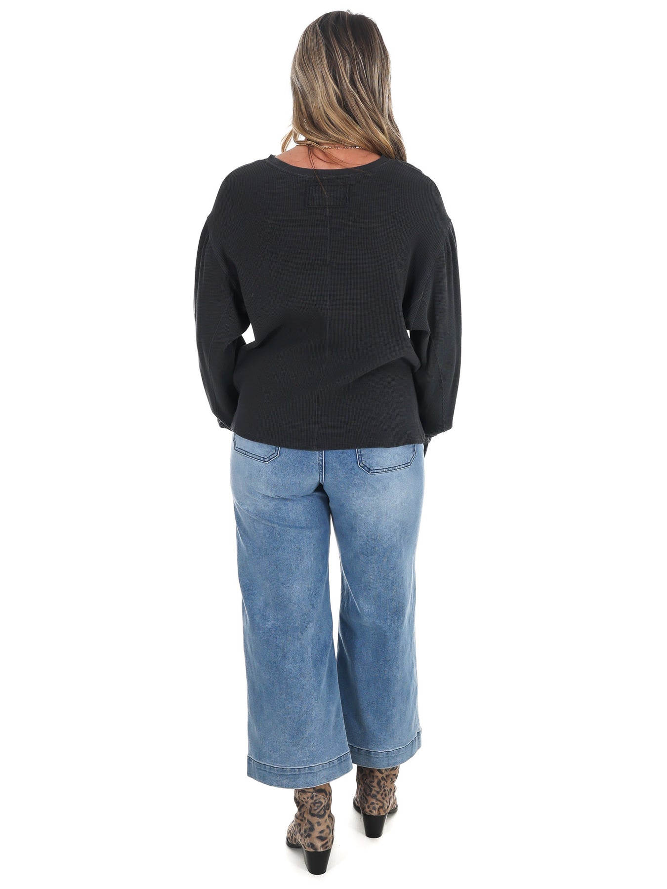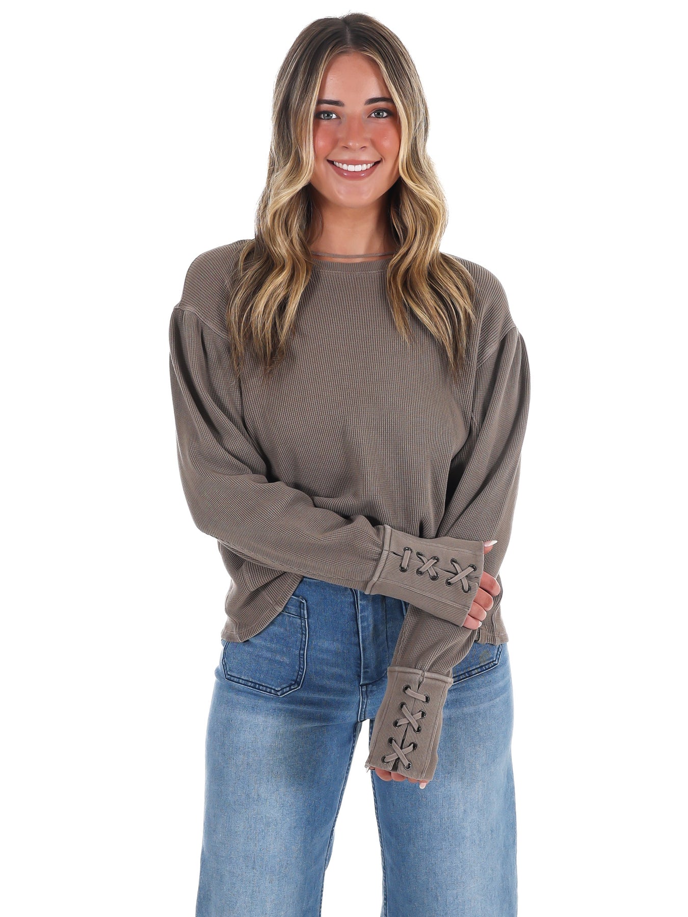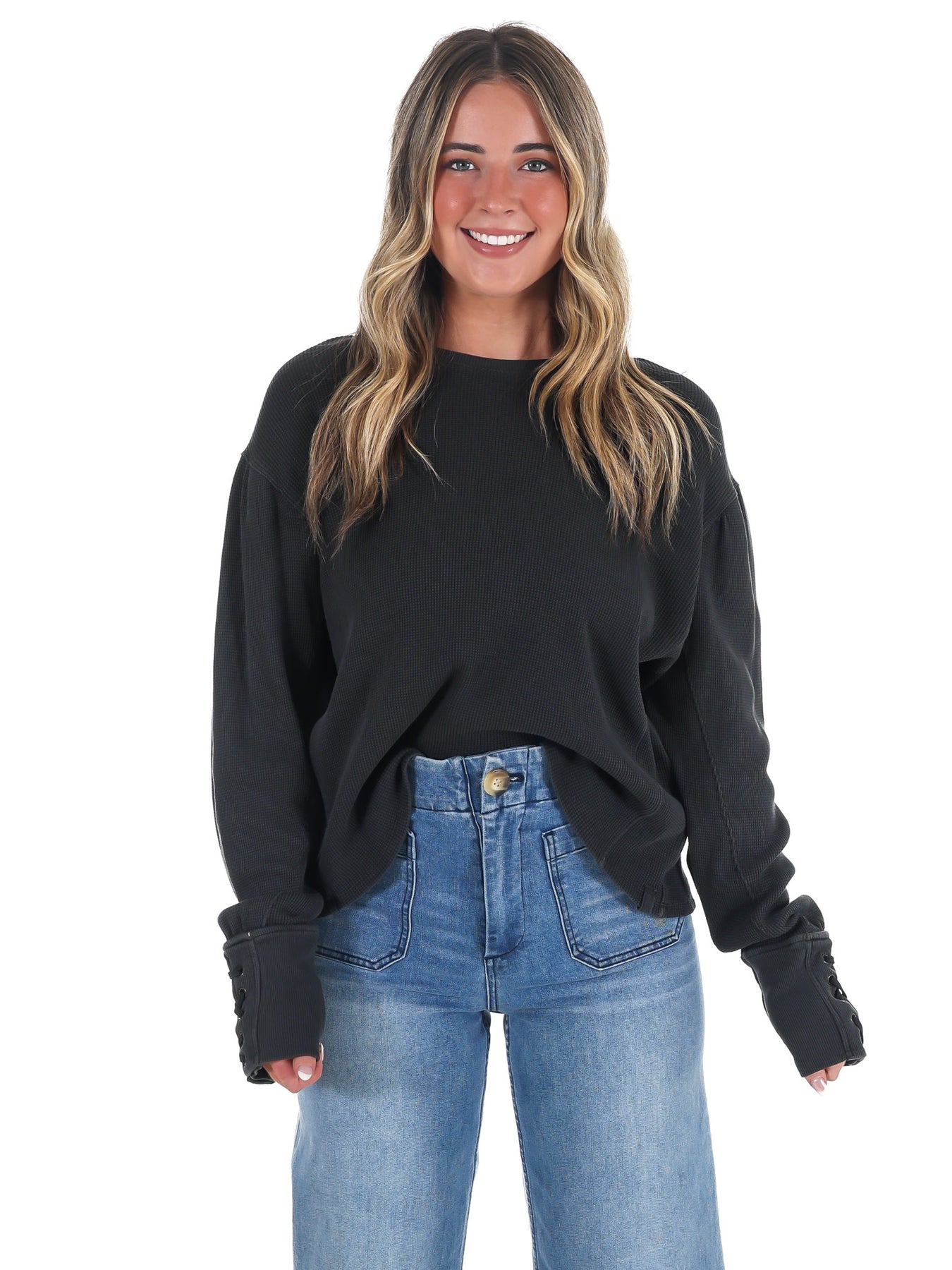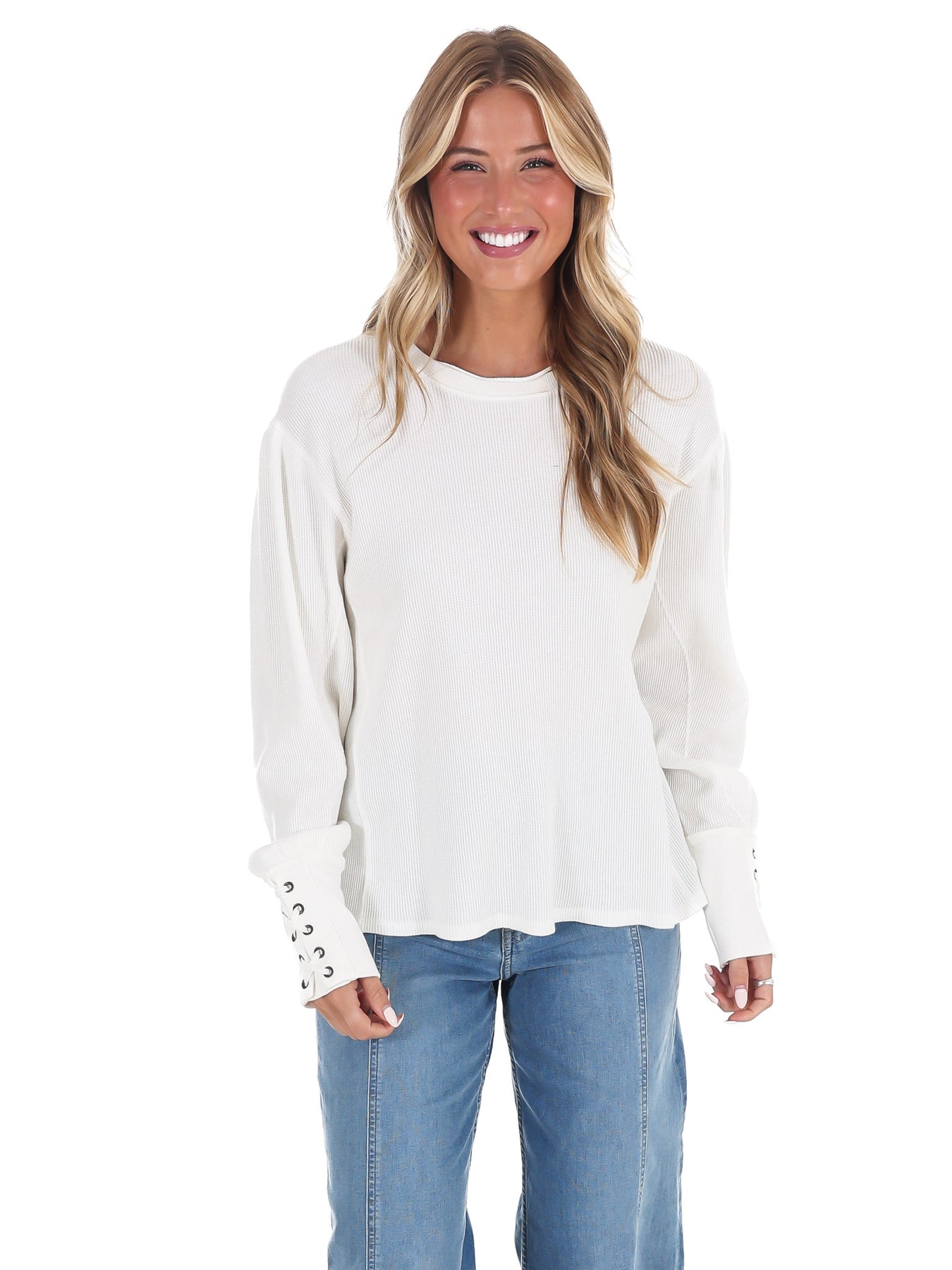 Lace-up details adorn the cuffs of this laidback long sleeve from We The Free, featured in a classic thermal fabrication with voluminous sleeves for added dimension.