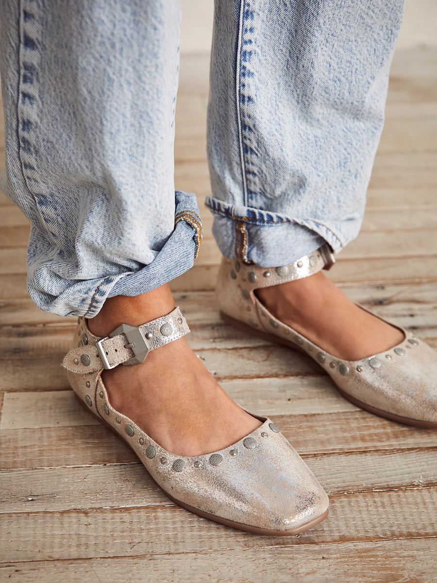 Slip into these so chic flats featured in a buttery soft leather with an adjustable ankle strap, stunning studded details, and a classic round toe.