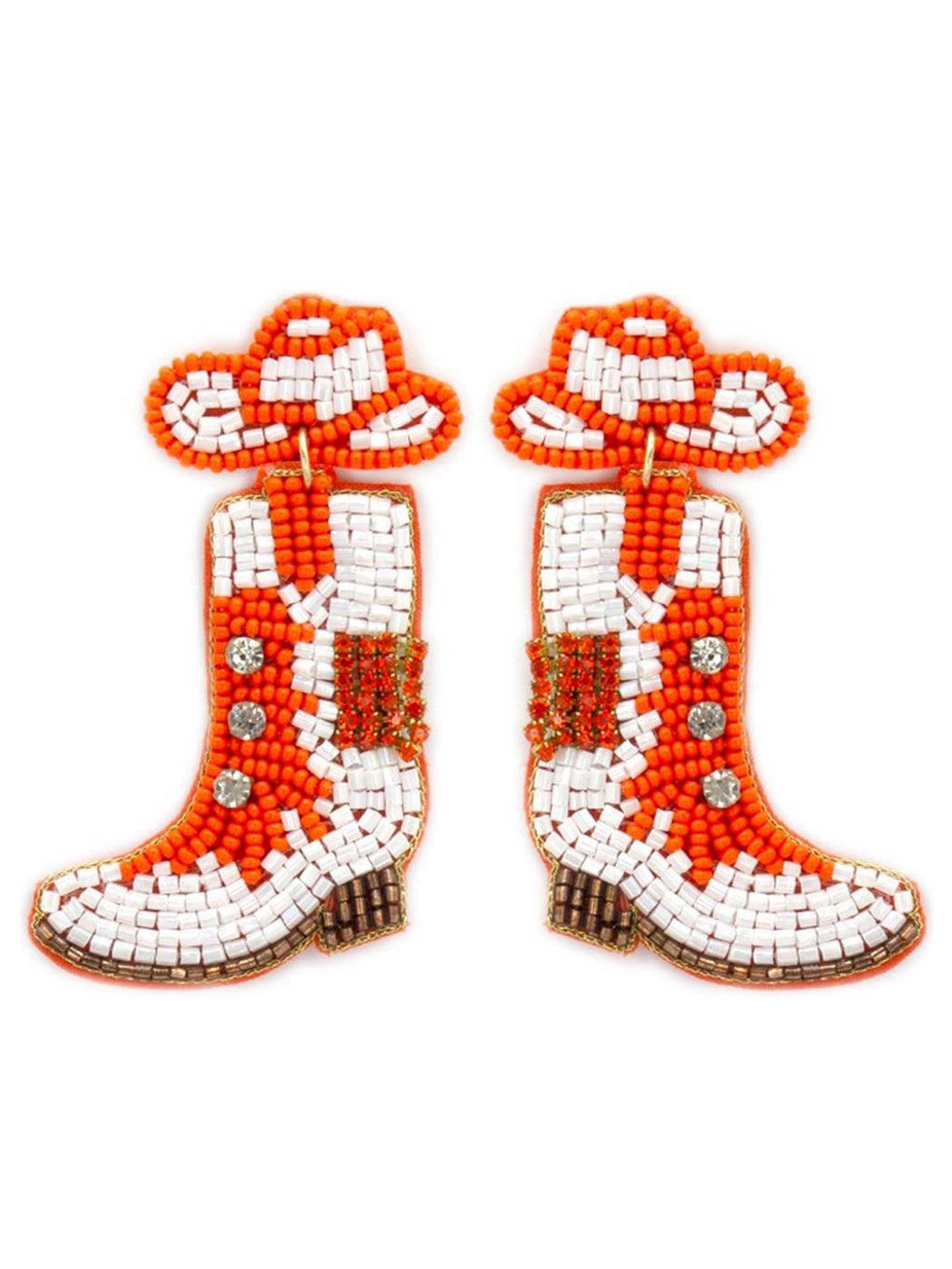 Show your Tennessee football pride with these fun and fashionable Cowgirl Hat & Boots Dangle Earrings. Crafted from seed bead, these chic earrings are sure to make a statement. Support your favorite team in style!