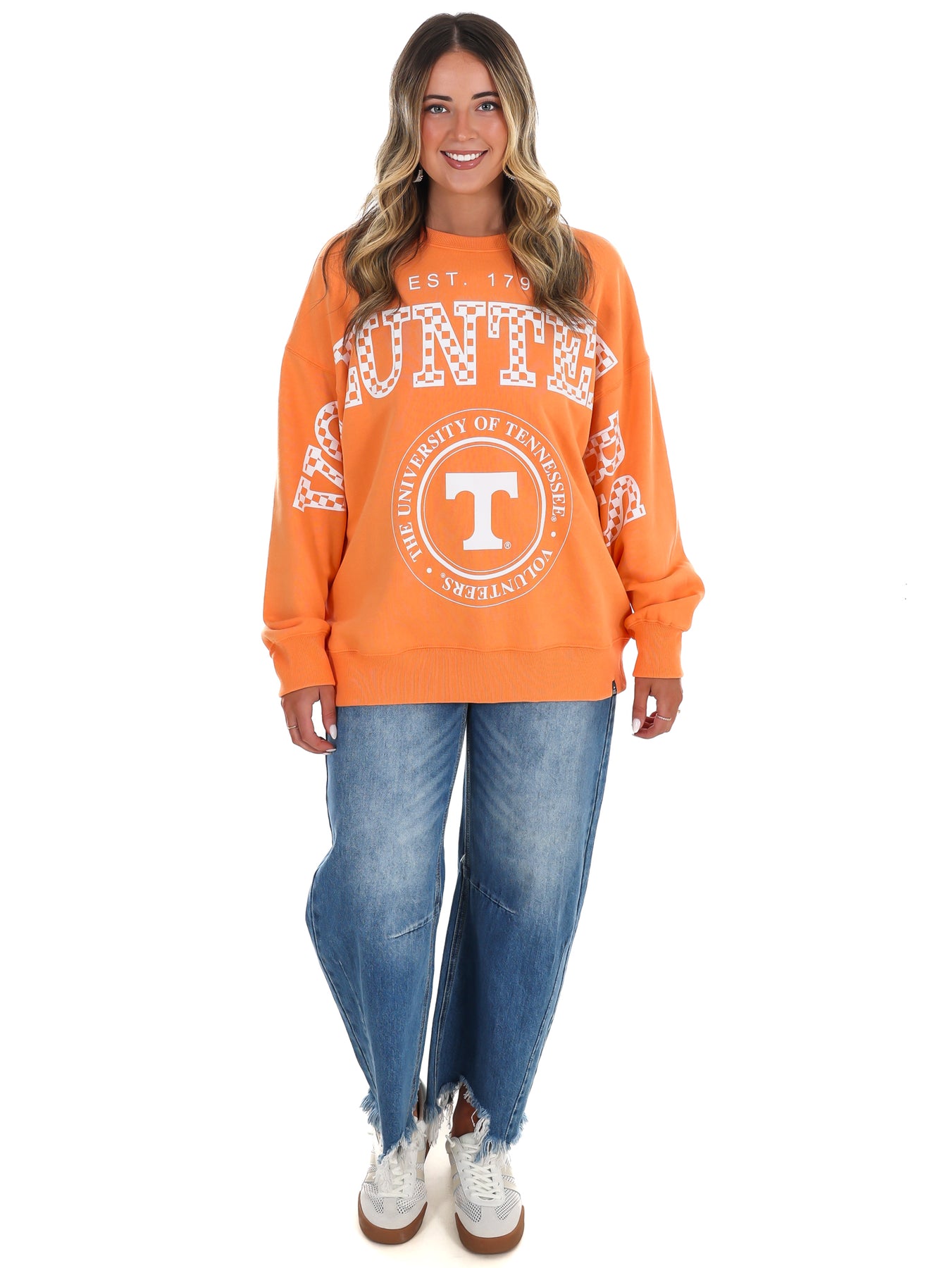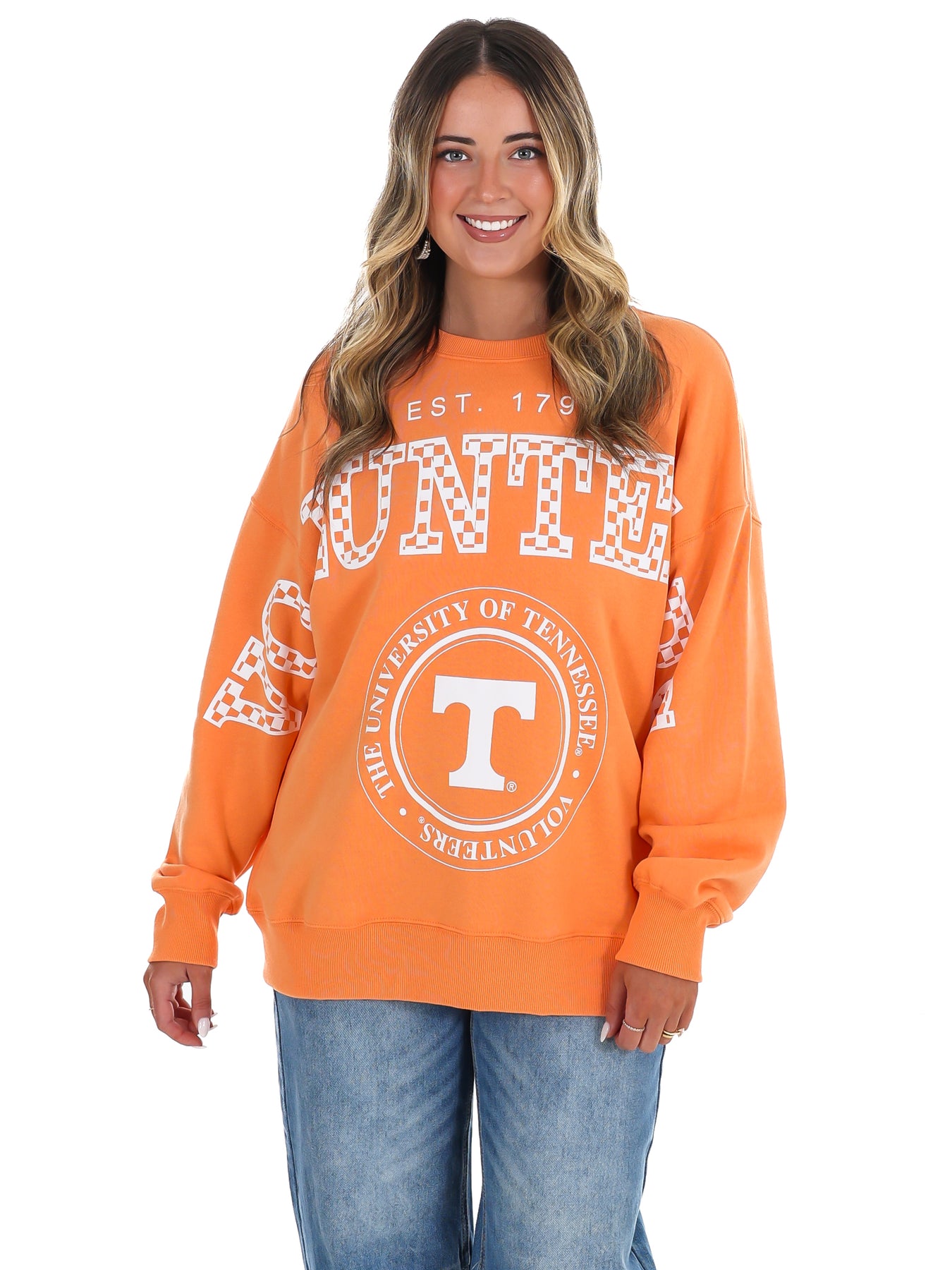 Rep your Vols pride loud and proud in this oversized University of Tennessee crewneck, featuring bold block lettering with classic checkerboard detailing and a soft, vintage-inspired wash.