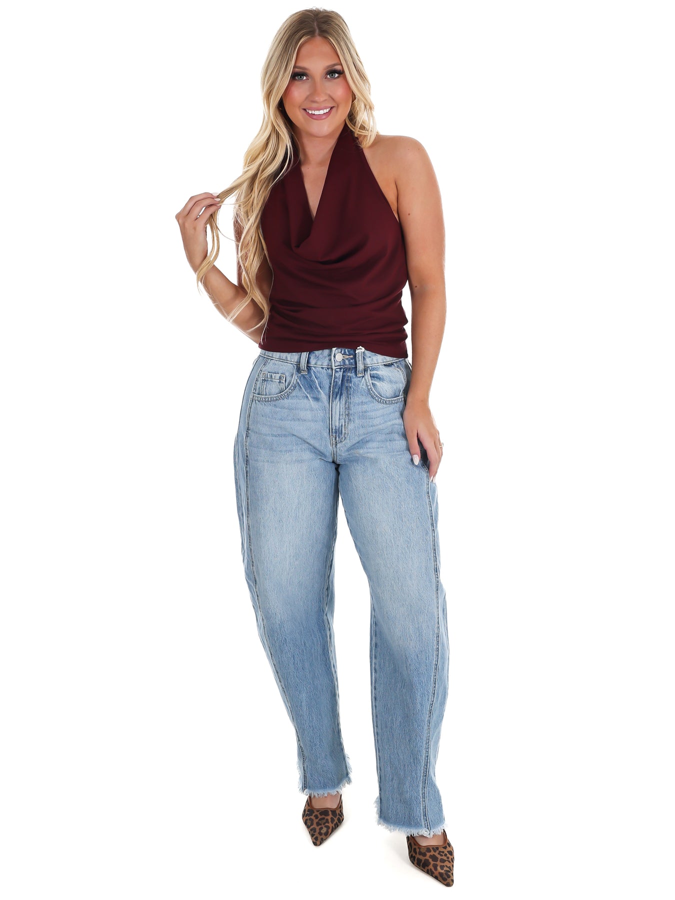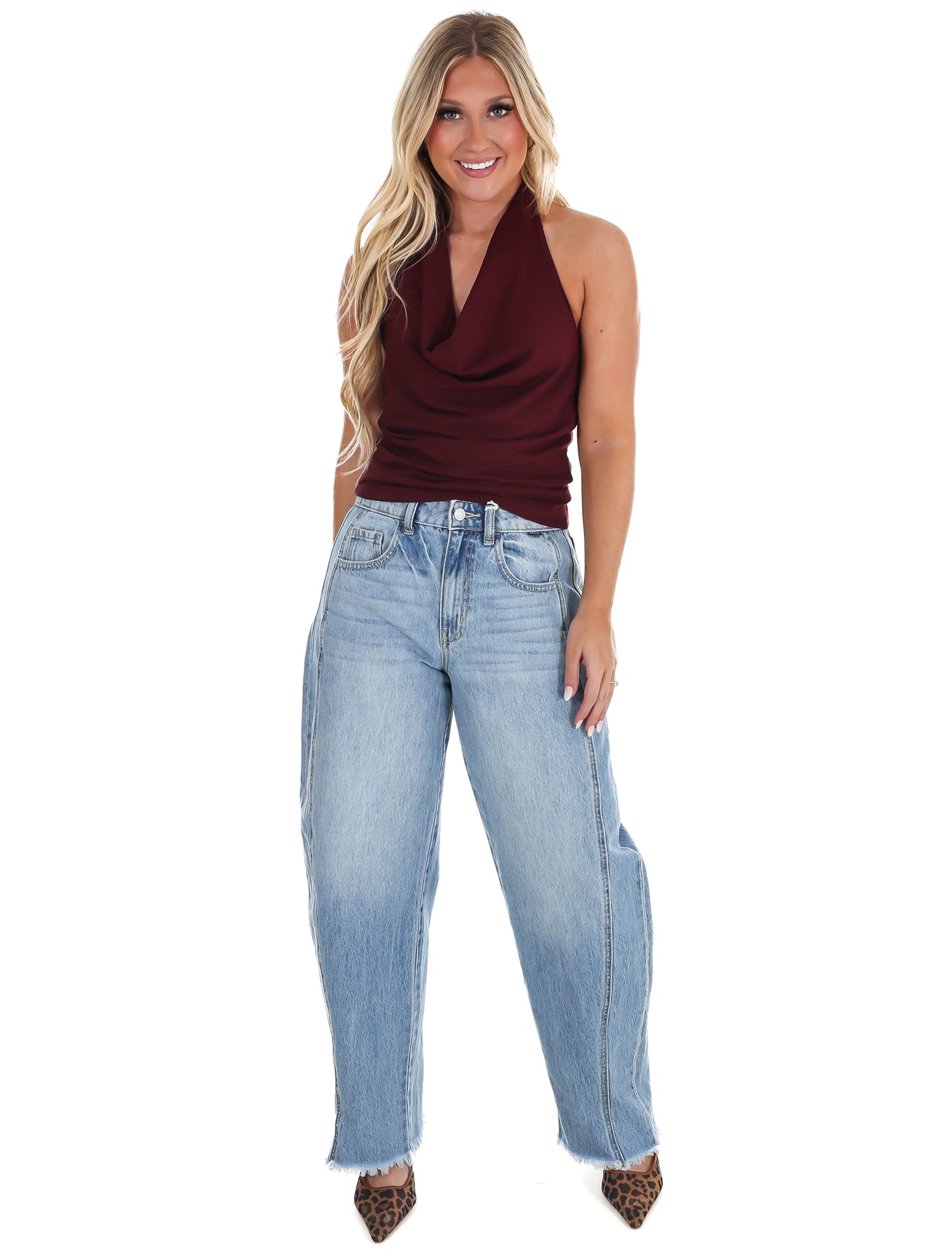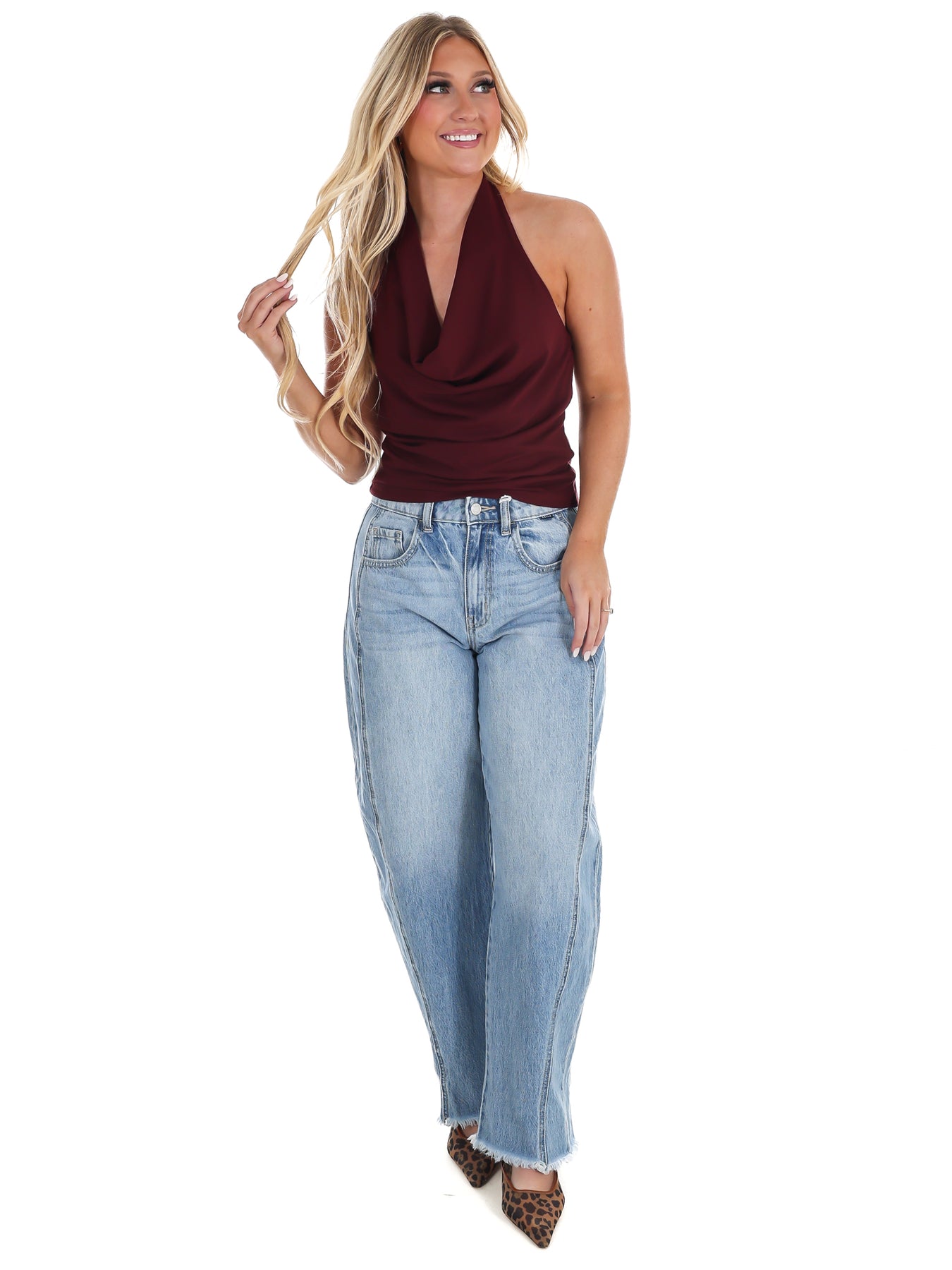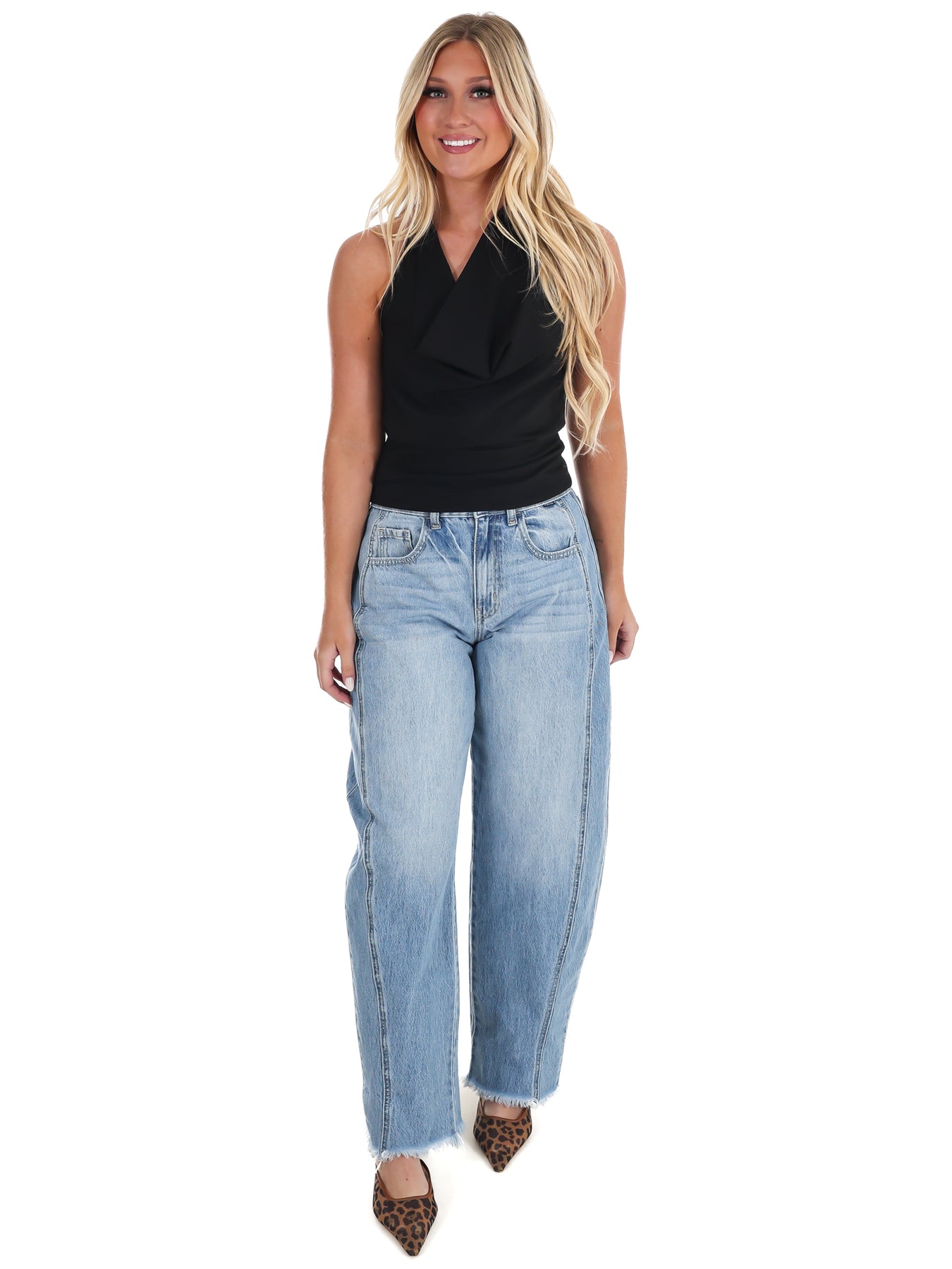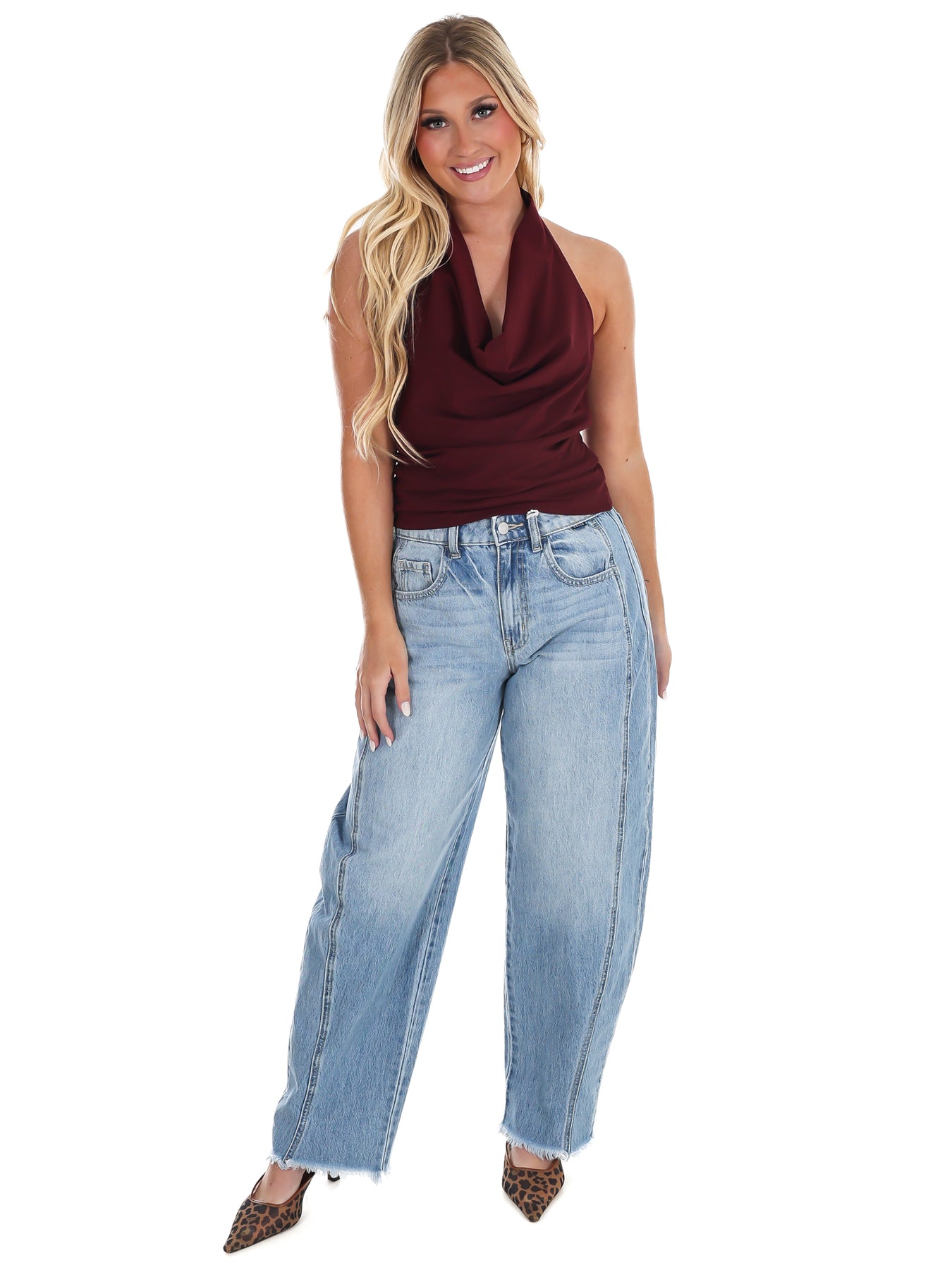Get ready to turn heads at your next event in this stunning halter top! The dramatic cowl neckline drapes elegantly while strategic ruching creates a flattering silhouette that hugs you in all the right places. Perfect for parties, nights out, or whenever you want to feel confident and fabulous. The halter design offers secure support with a touch of sophistication, making this piece an instant wardrobe essential for anyone who loves to make an entrance.