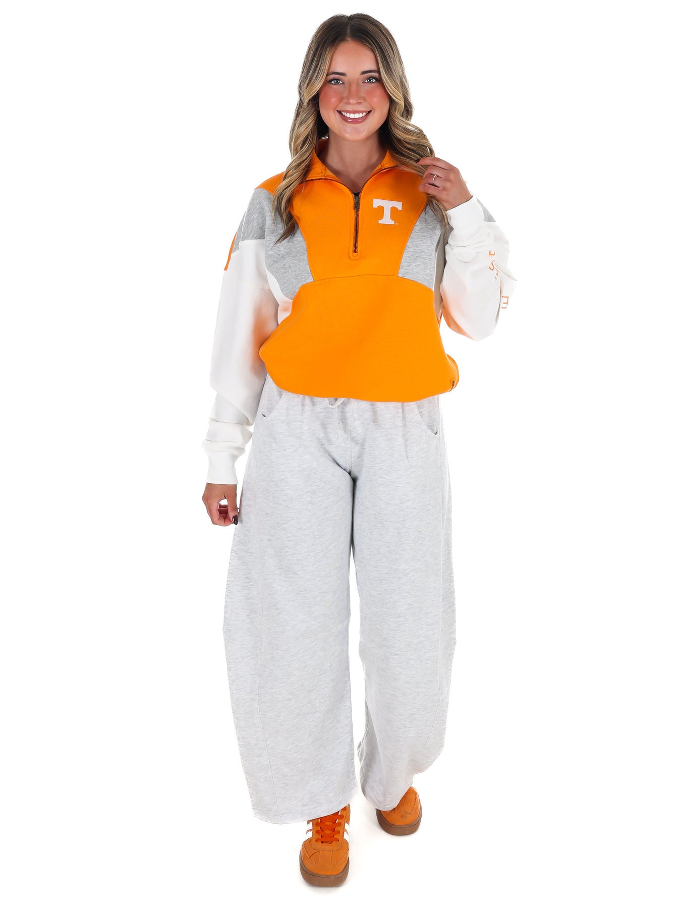 Rock your Tennessee pride with this vibrant contrast half zip pullover! Featuring the iconic power T against orange, heather grey and crisp white colorblocking, this piece brings serious school spirit with a modern twist. The half zip design offers easy layering for game days or casual wear, while the playful color combo keeps things fresh and fun. Perfect for fans who want to show their Volunteer spirit in style.