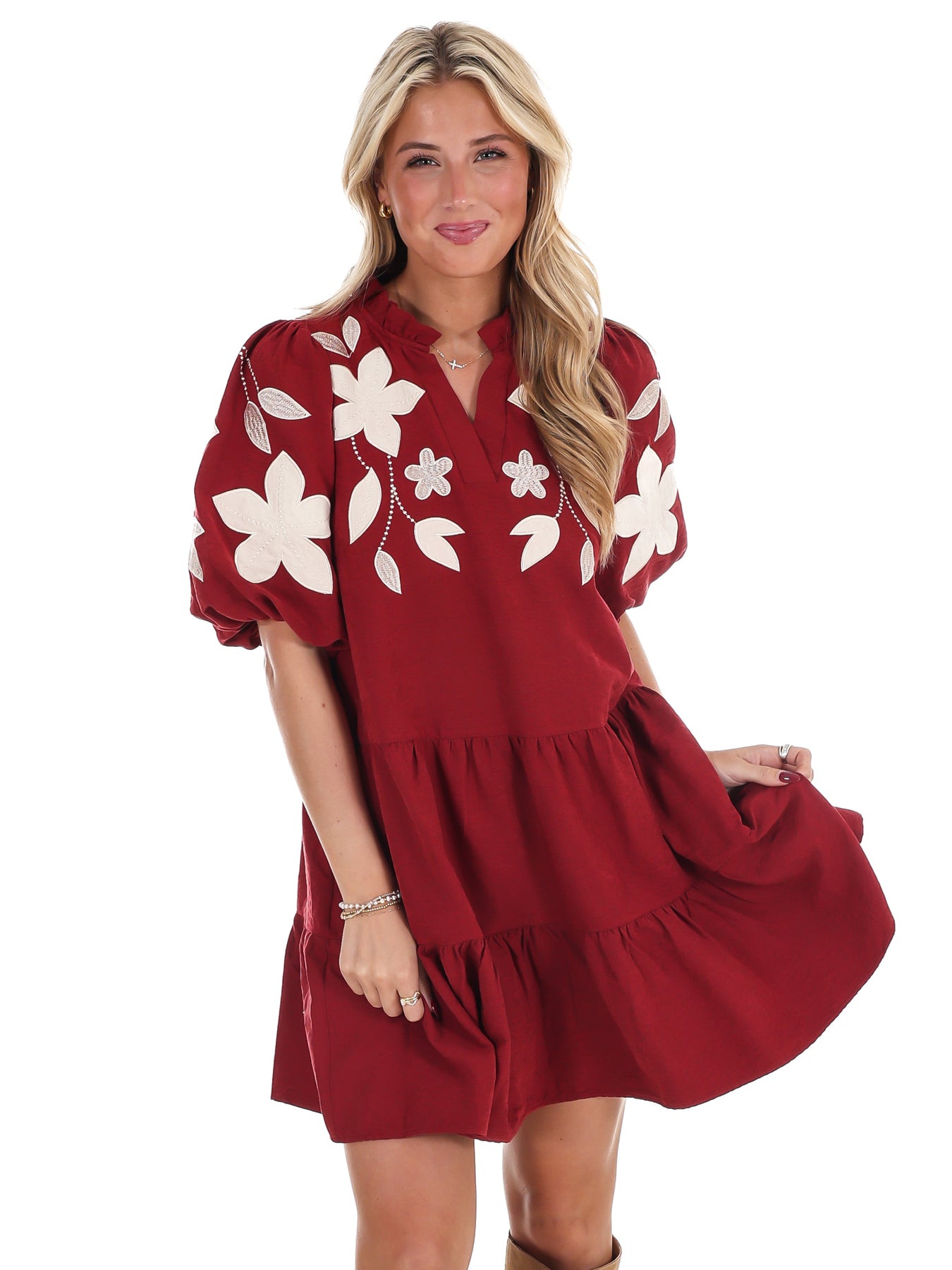 Make an unforgettable impression in the Long Story Short Embroidered Mini Dress, where intricate design meets wearable elegance. Striking oversized floral applique embroidery takes center stage, transforming this tiered silhouette into a conversation starter. The split neckline offers a modern edge while voluminous puff sleeves add vintage-inspired romance. Layered tiers create beautiful movement and dimension, flattering your figure from every angle. Whether you're heading to a special occasion or elevating your weekend wardrobe, this dress delivers the perfect balance of sophistication and playful style that keeps you looking fresh and fashion-forward.
