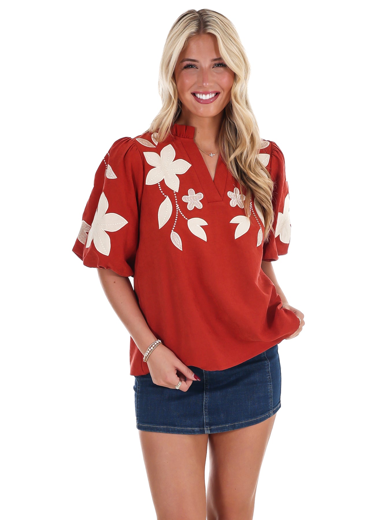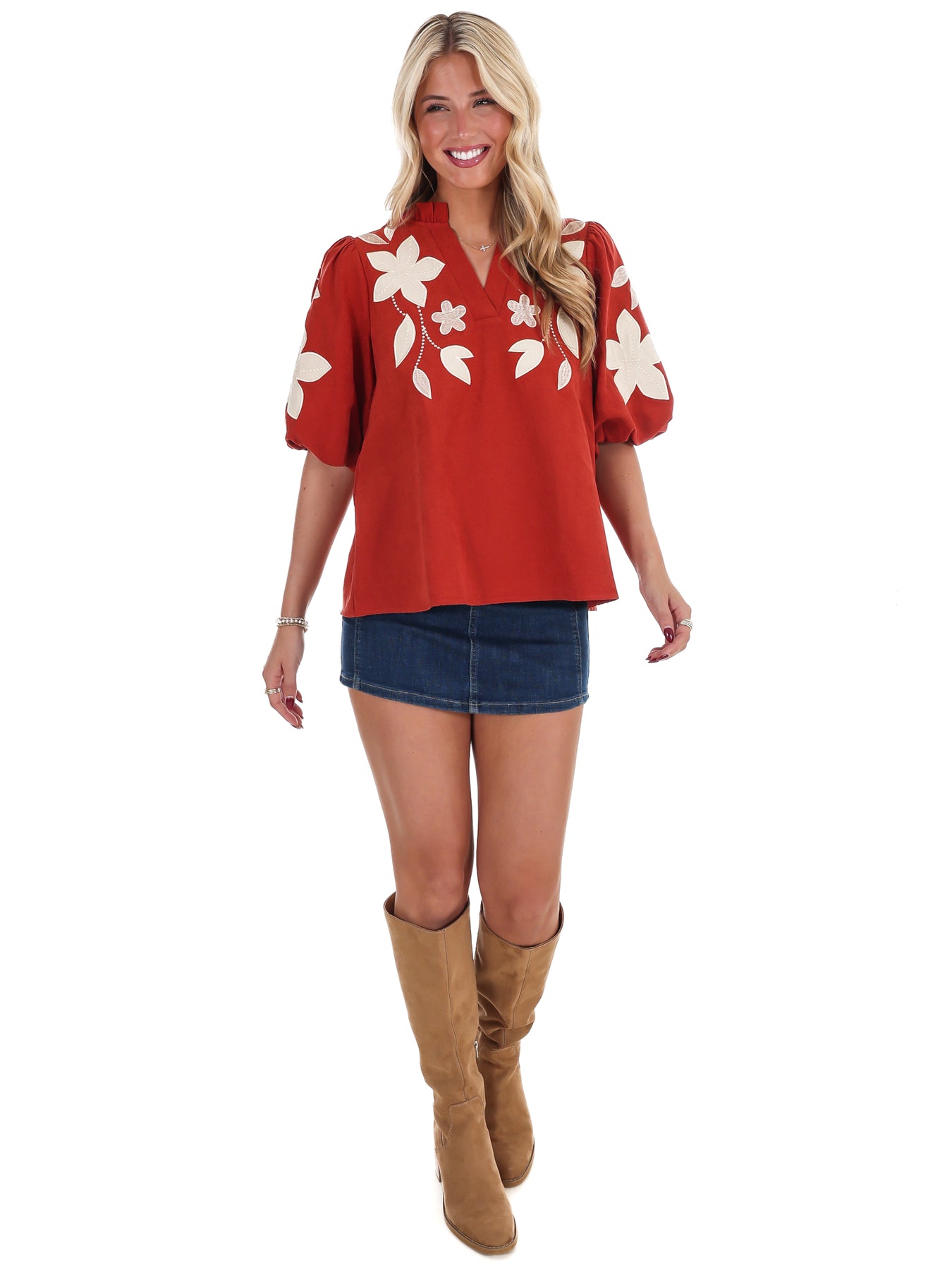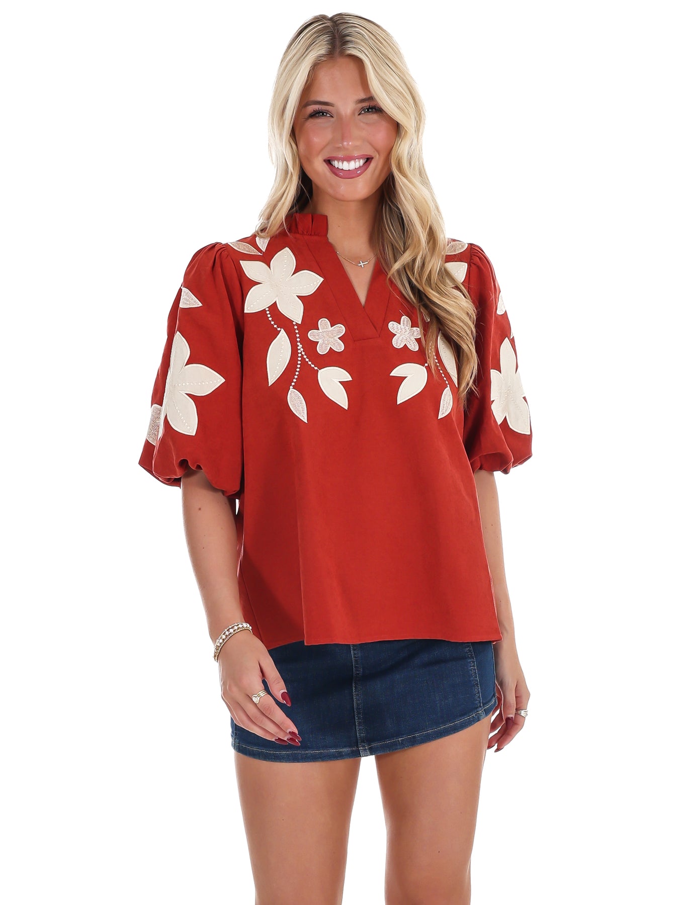 Make a lasting impression with this exquisite washed suede top that captures effortless elegance. The contrasting floral applique introduces artistic flair and visual interest, while the ruffled neckline frames your face with delicate charm. Puff half sleeves deliver a contemporary silhouette that's both comfortable and flattering. Luxuriously soft suede feels incredible to wear, offering the perfect balance of sophistication and approachability for any occasion where you want to stand out.