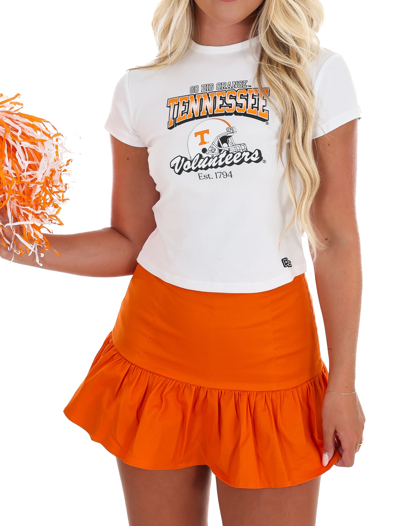 Experience comfort and style with the University of Tennessee Baby Tee. Made from ultra-soft cotton, this tee features delicate Tennessee embroidery and a flattering cropped cut that sits just above the hips. Perfect for showing your team spirit while staying effortlessly chic.