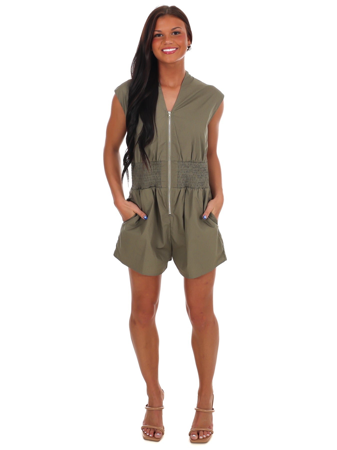 Effortlessly stylish and practical, the Zip & Go Romper is a must-have for any wardrobe. With its flattering cap sleeves, smocked waist, and handy pockets, this woven romper is perfect for any occasion. Get ready to turn heads and stay comfortable all day long with this versatile piece!
