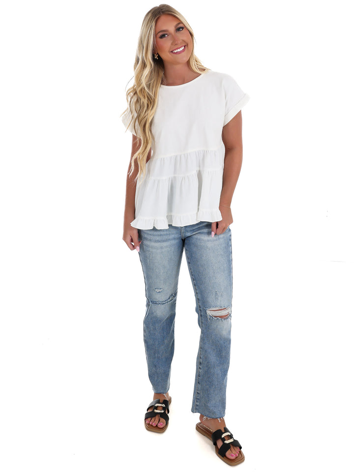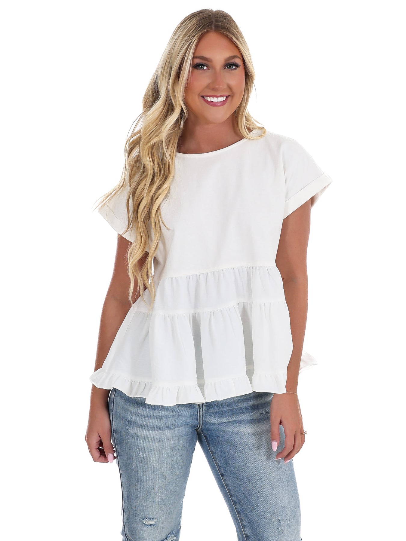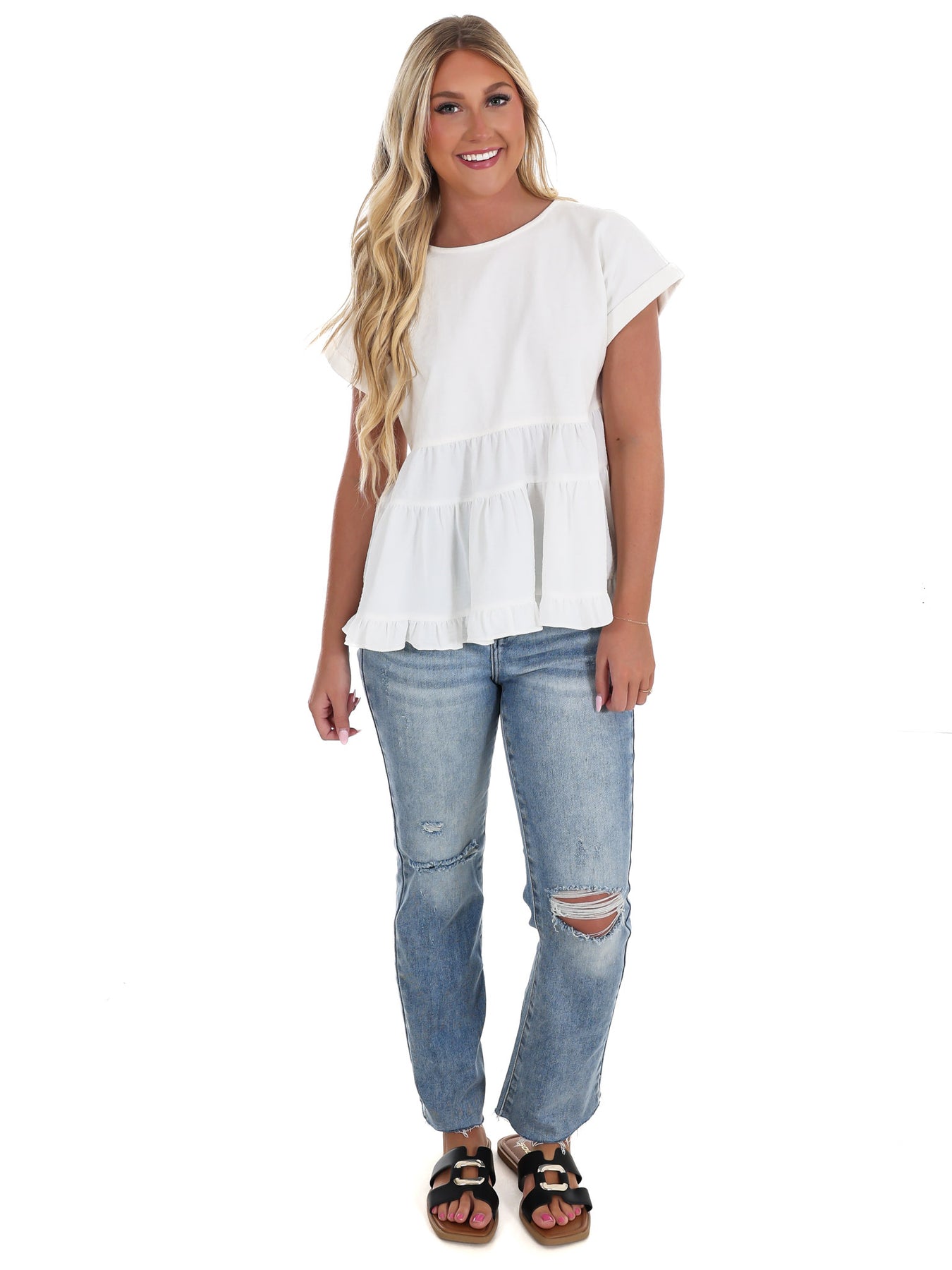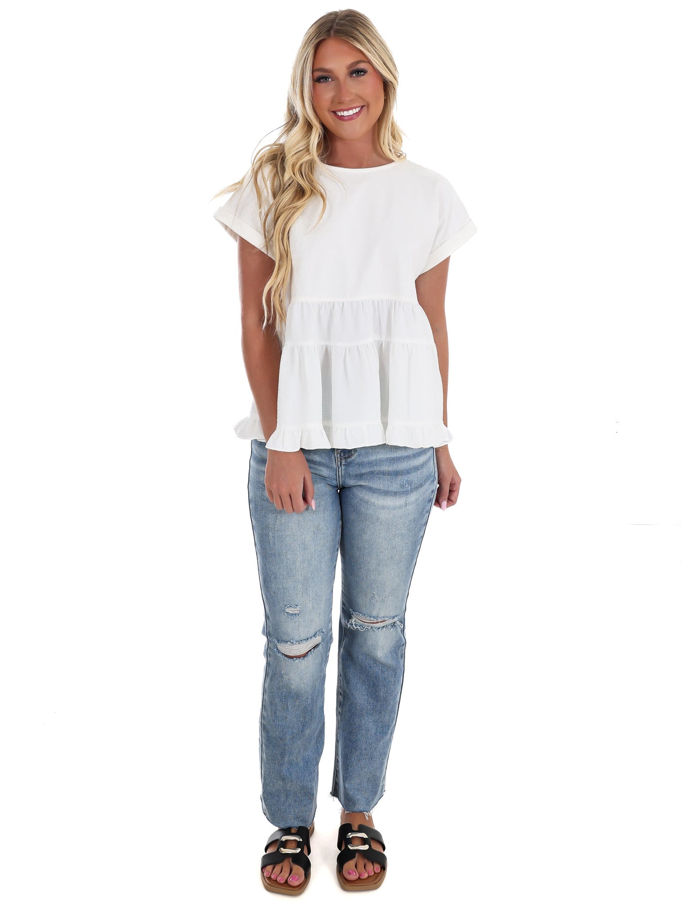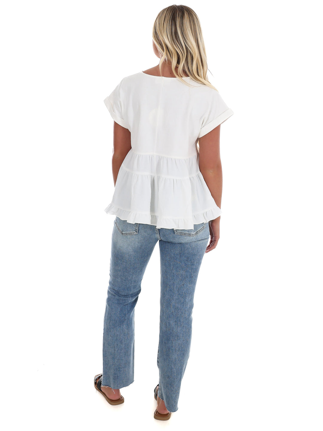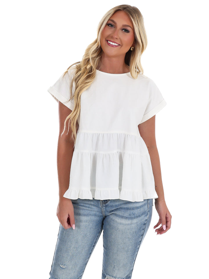 Indulge in comfort and style with our Bayside Babydoll Top! Made with soft cotton jersey fabric, this top features a round neck and rolled sleeves for a relaxed look. The airy, tiered ruffles and loose fit create a flattering babydoll silhouette, perfect for a casual yet chic blouse top.