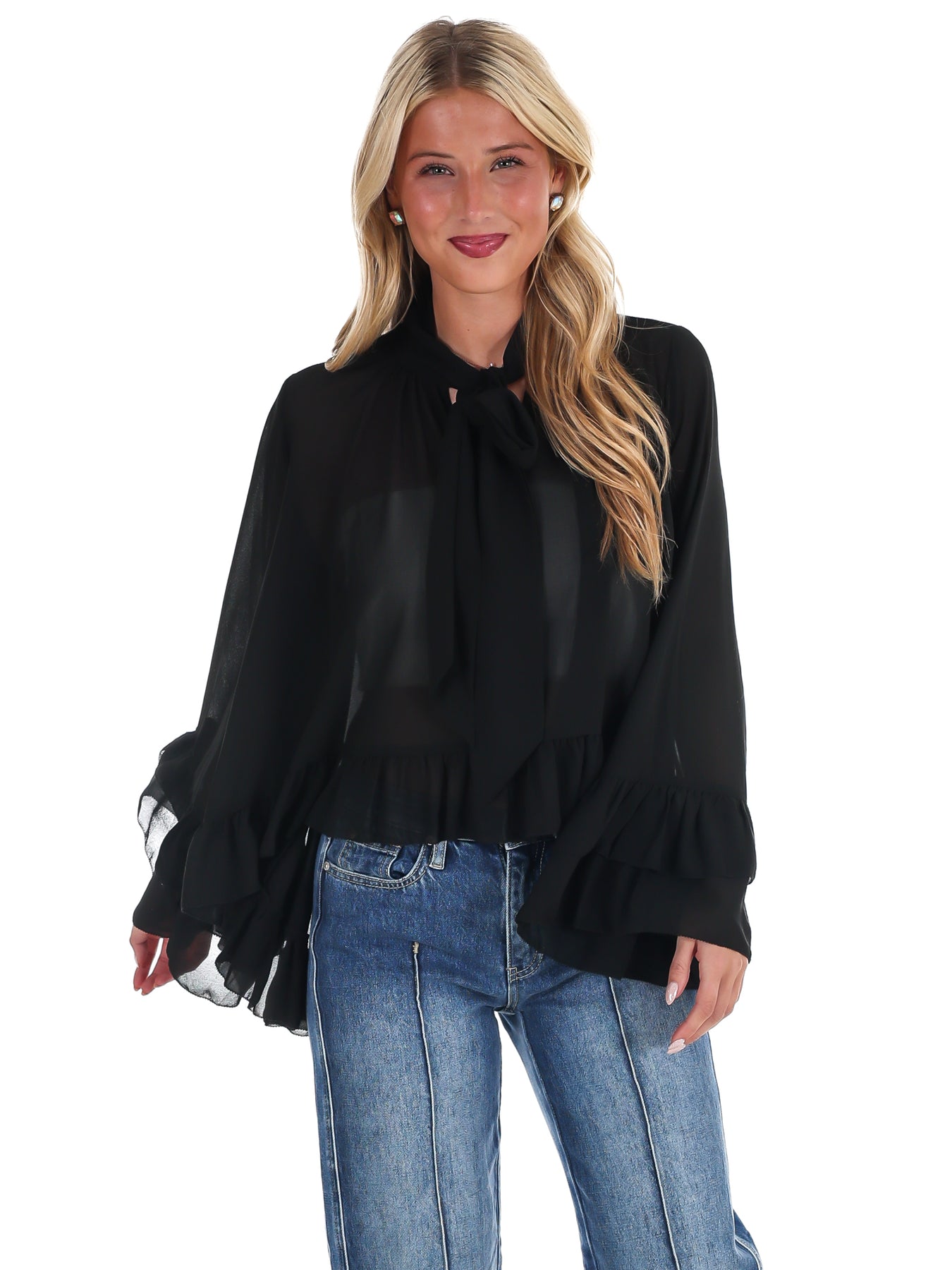 Transform your everyday look with the Coming Around Chiffon Top, where timeless femininity meets modern versatility. The luxurious ruffled chiffon fabric drapes beautifully, while layered bell sleeves create an enchanting silhouette that flatters every frame. Tie the delicate neck ribbon to your preference—loose for an understated elegance or snug for a polished finish. Whether you're heading to brunch, the office, or an evening out, this sophisticated blouse adapts to your style and occasion with effortless grace.