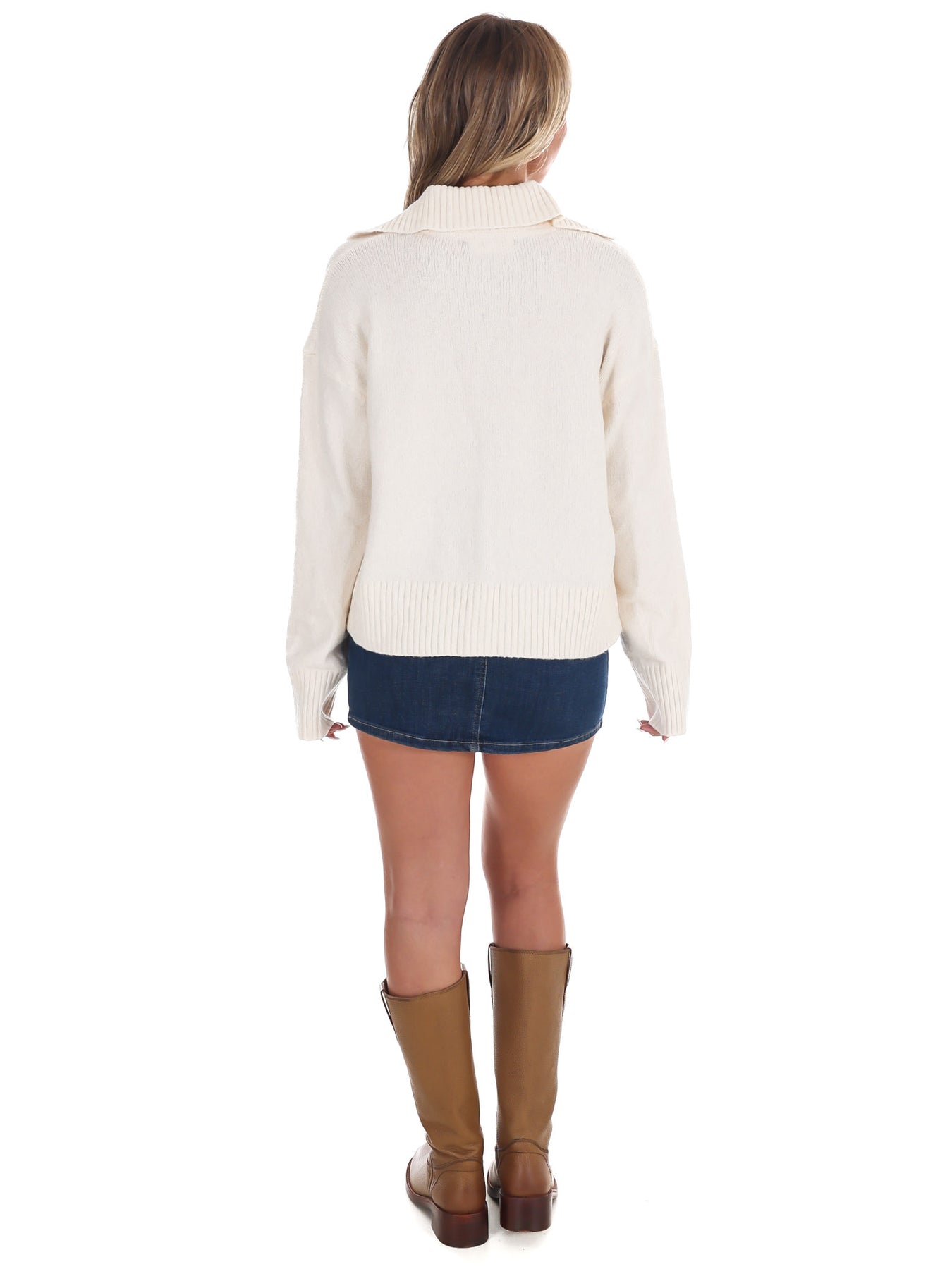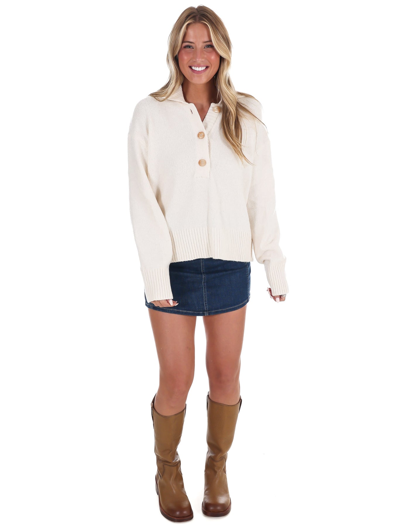 The definition of cozy, this sweater features a classic polo-inspired silhouette, a cotton-blend knit fabrication, and charming tortoise shell buttons.