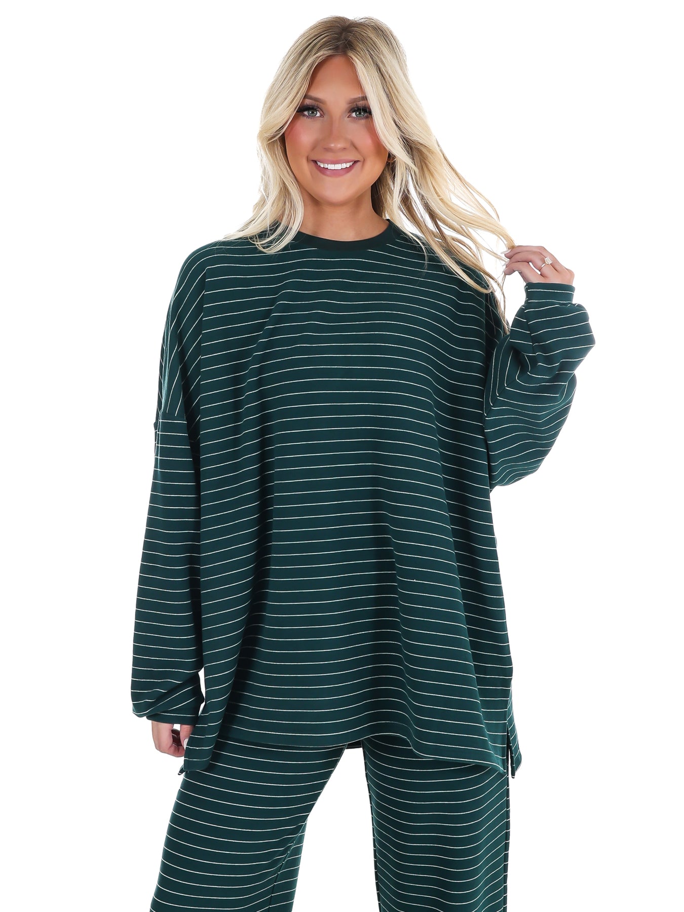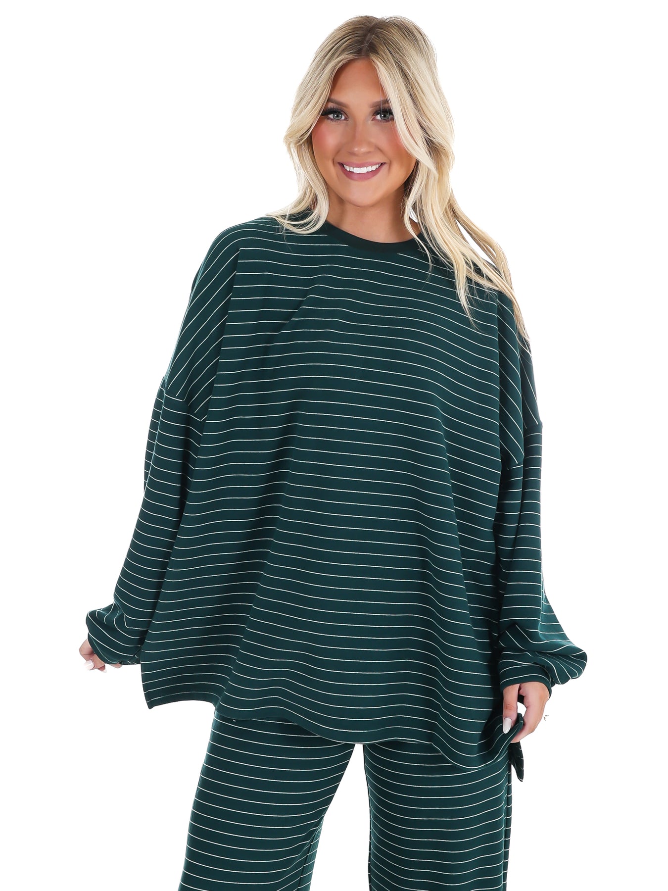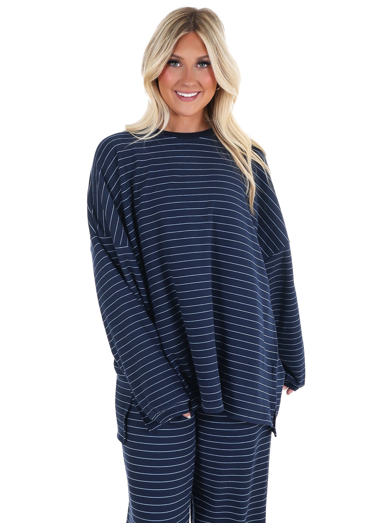 Snuggle up in this striped fleece oversized top that's basically a warm hug you can wear. Impossibly soft and ridiculously cozy, it delivers that pajama-level comfort without sacrificing style. The relaxed fit is perfect for lounging, running errands, or pretending you're still in bed. Team it with the Warm Wishes Fleece Pants to create the ultimate comfort set that has everyone asking where you got your outfit. Your new favorite piece is here.