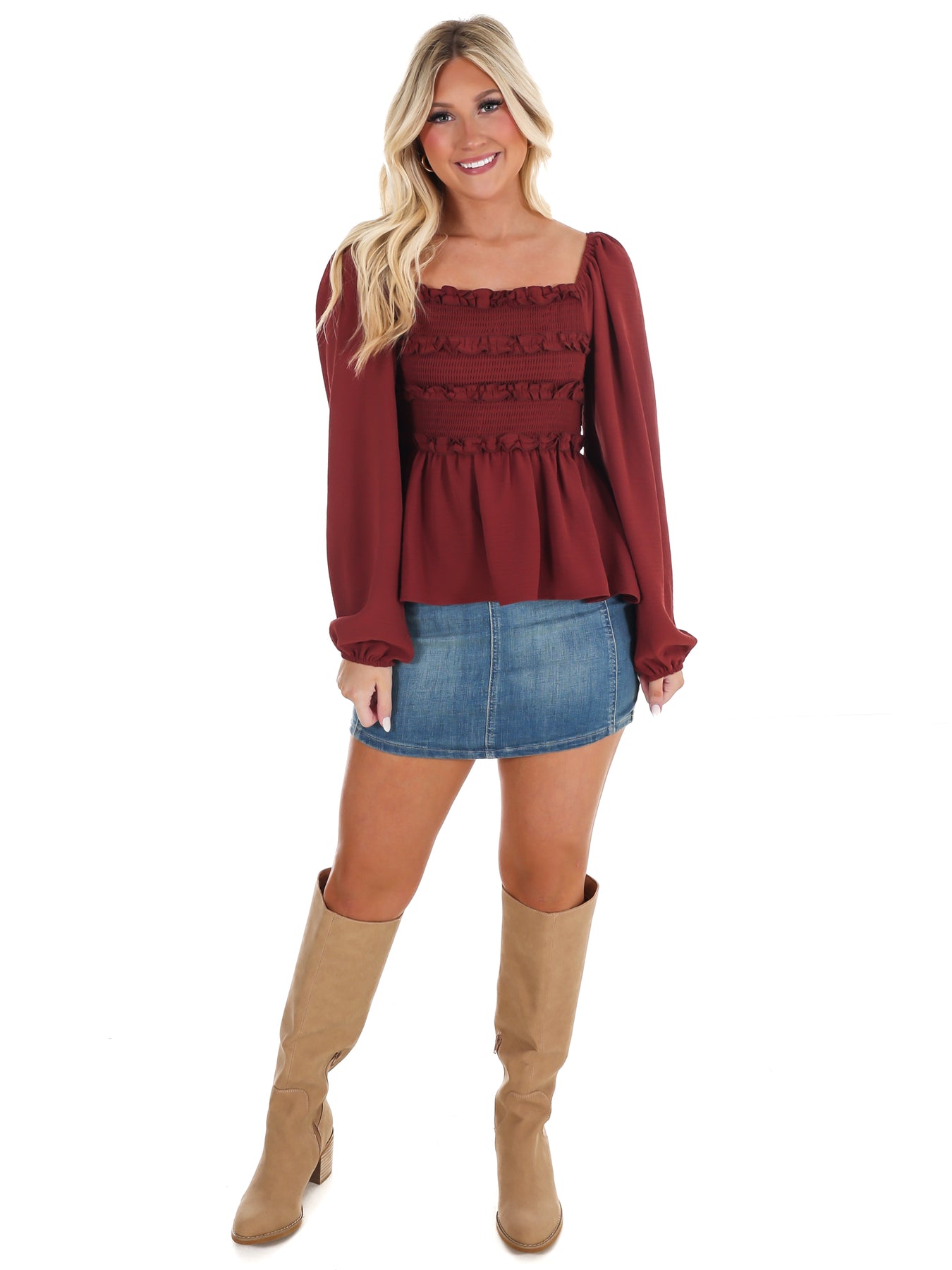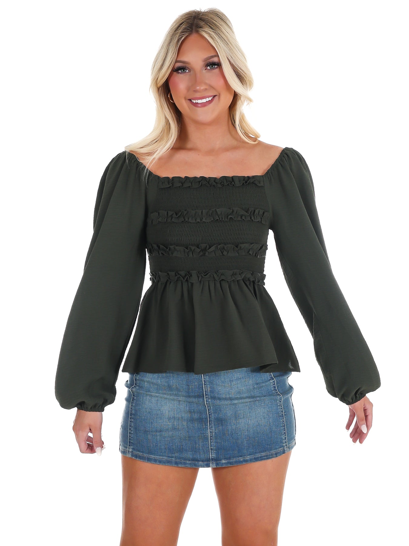 Transform your everyday wardrobe with this playful smocked babydoll top that works as hard as you do. Rock it off-the-shoulder for weekend vibes or square-neck for the office—the choice is yours. Crafted from textured crinkled woven fabric with charming mini ruffles at the bust, this top features long balloon sleeves that add just the right amount of drama. The smocked detailing creates a flattering silhouette that's equal parts chic and fun. Whether you're heading to brunch or the boardroom, this versatile piece adapts to your style.