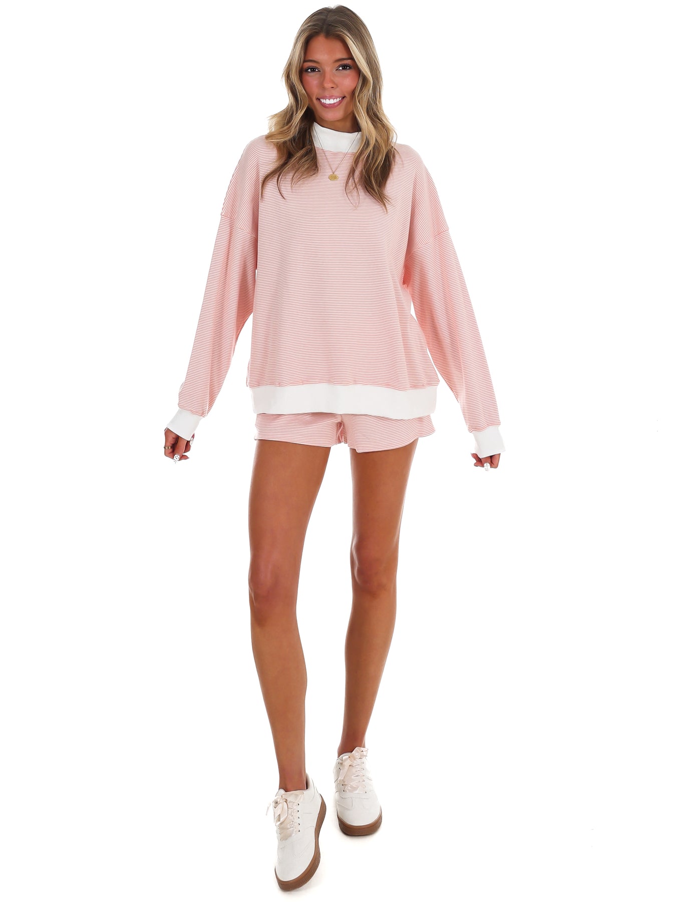 Get ready to turn heads with the Better Idea Stripe Two Piece Set—your new go-to for laid-back style with serious charm. This dynamic duo features a relaxed mock neck sweatshirt that pairs seamlessly with trendy shorts, complete with an elastic waistband and drawstrings for the perfect fit. The coordinating stripes create a cohesive look that's both effortless and Instagram-worthy. Whether you're binge-watching your favorite show or grabbing coffee with friends, this set delivers comfort and personality in one package.