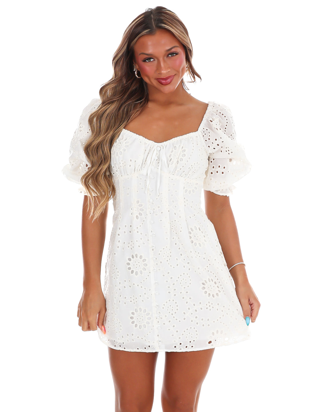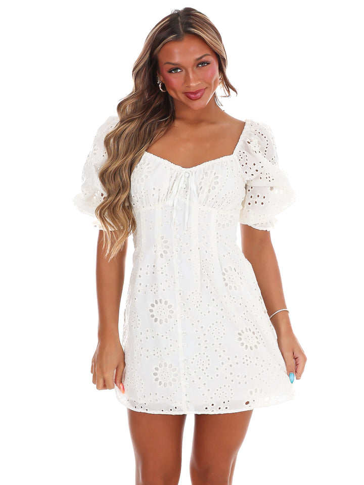 Be effortlessly chic and feminine in our Anything is Possible Floral Eyelet Mini Dress! Embrace your curves with this bodycon silhouette featuring a square neckline, puffy sleeves, and empire waist. The eye-catching floral eyelet design and bust center tie add a touch of elegance and charm. Perfect for any occasion, this dress is a must-have for your wardrobe!