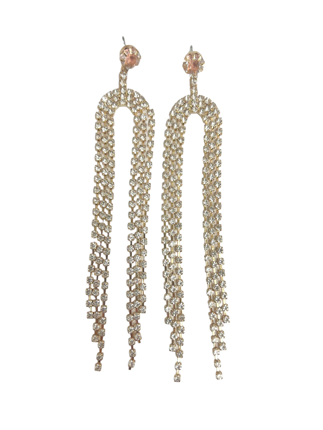 These Arched Rhinestone Drop Earrings will make any outfit sparkle! The arched fringe, combined with the shimmering rhinestones, will add a glamorous touch to any look. Make a statement in style!