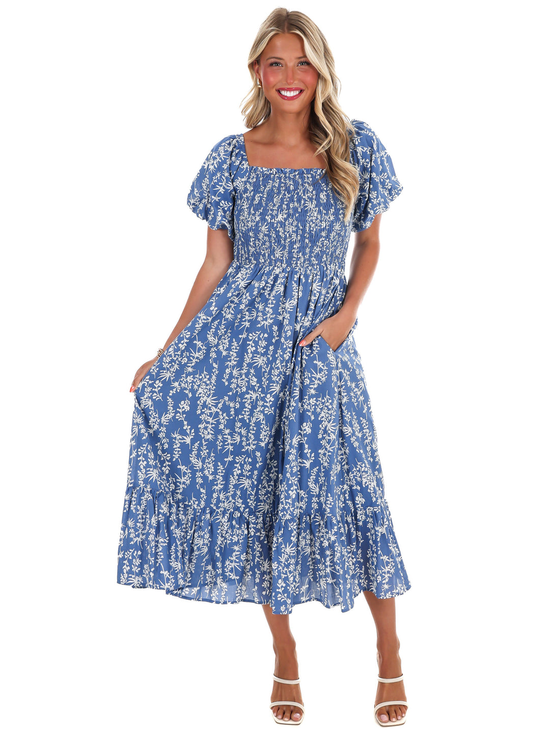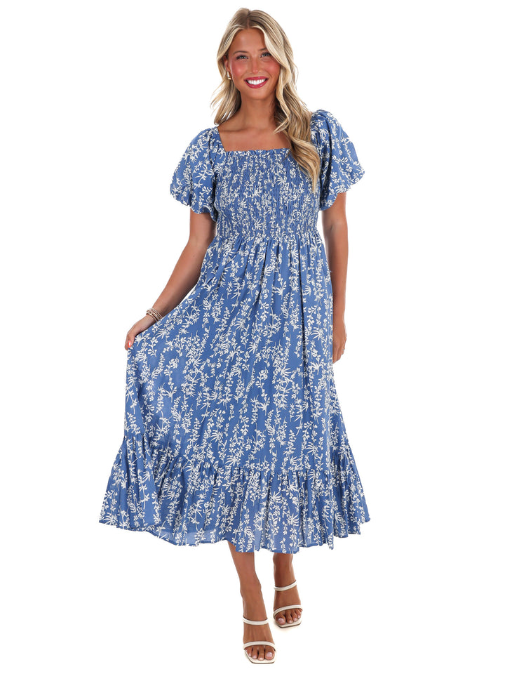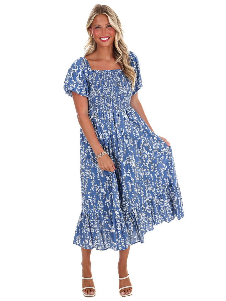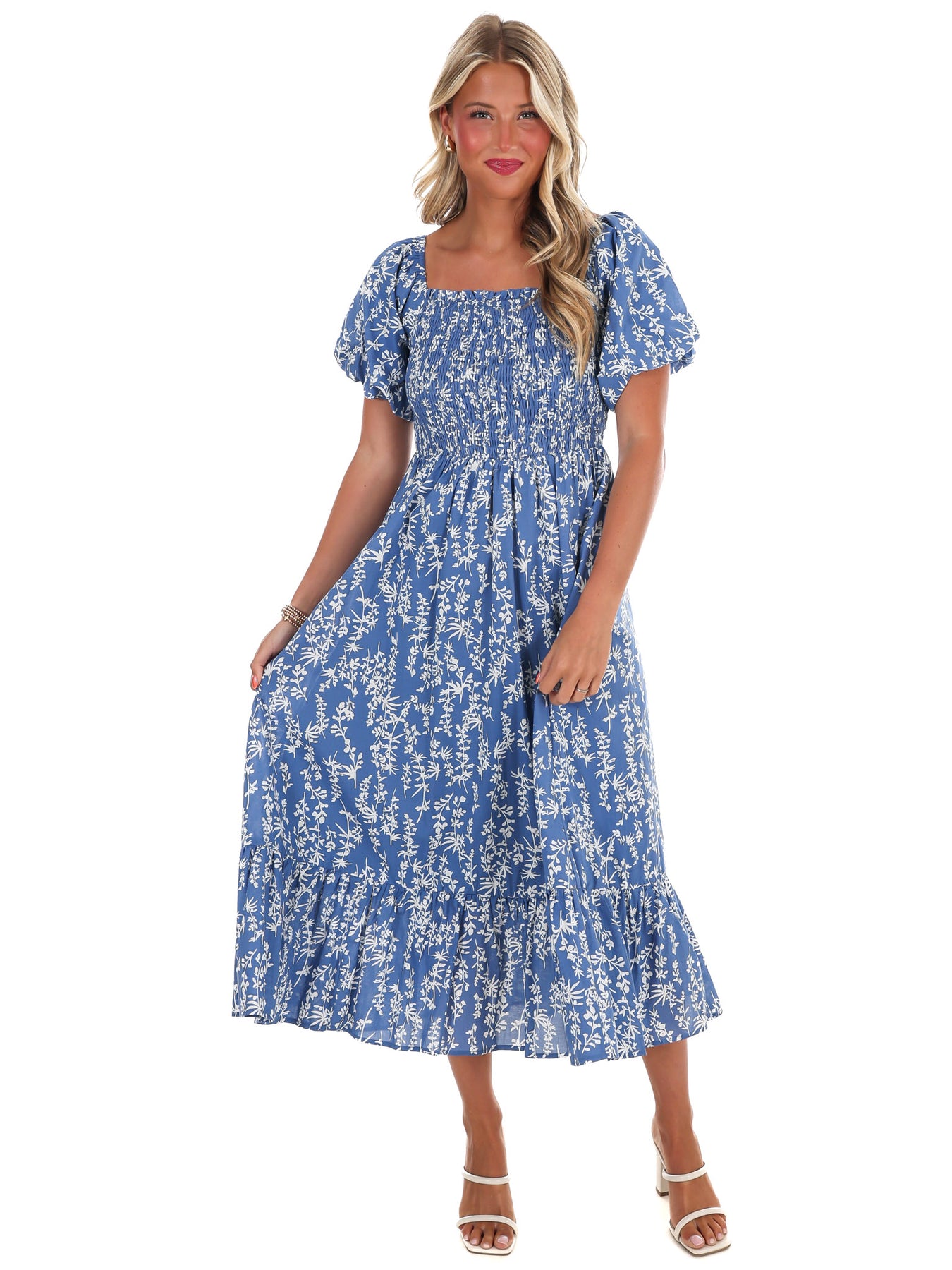 Experience the beauty of now in this romantic floral midi dress! With its square neckline and smocked design, this dress is both flattering and comfortable. The leaf print adds a touch of nature, while the lined, short bubble-sleeves give a whimsical feel. Perfect for any occasion, this midi dress will make you feel confident and beautiful.