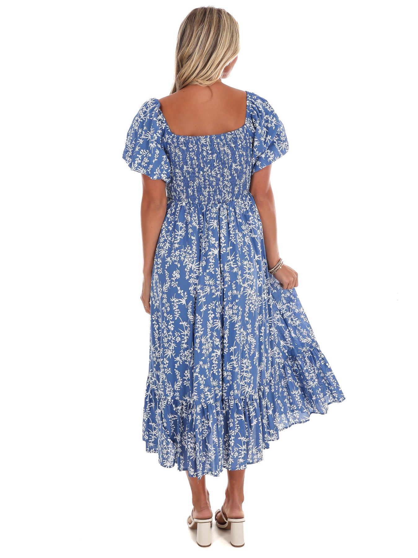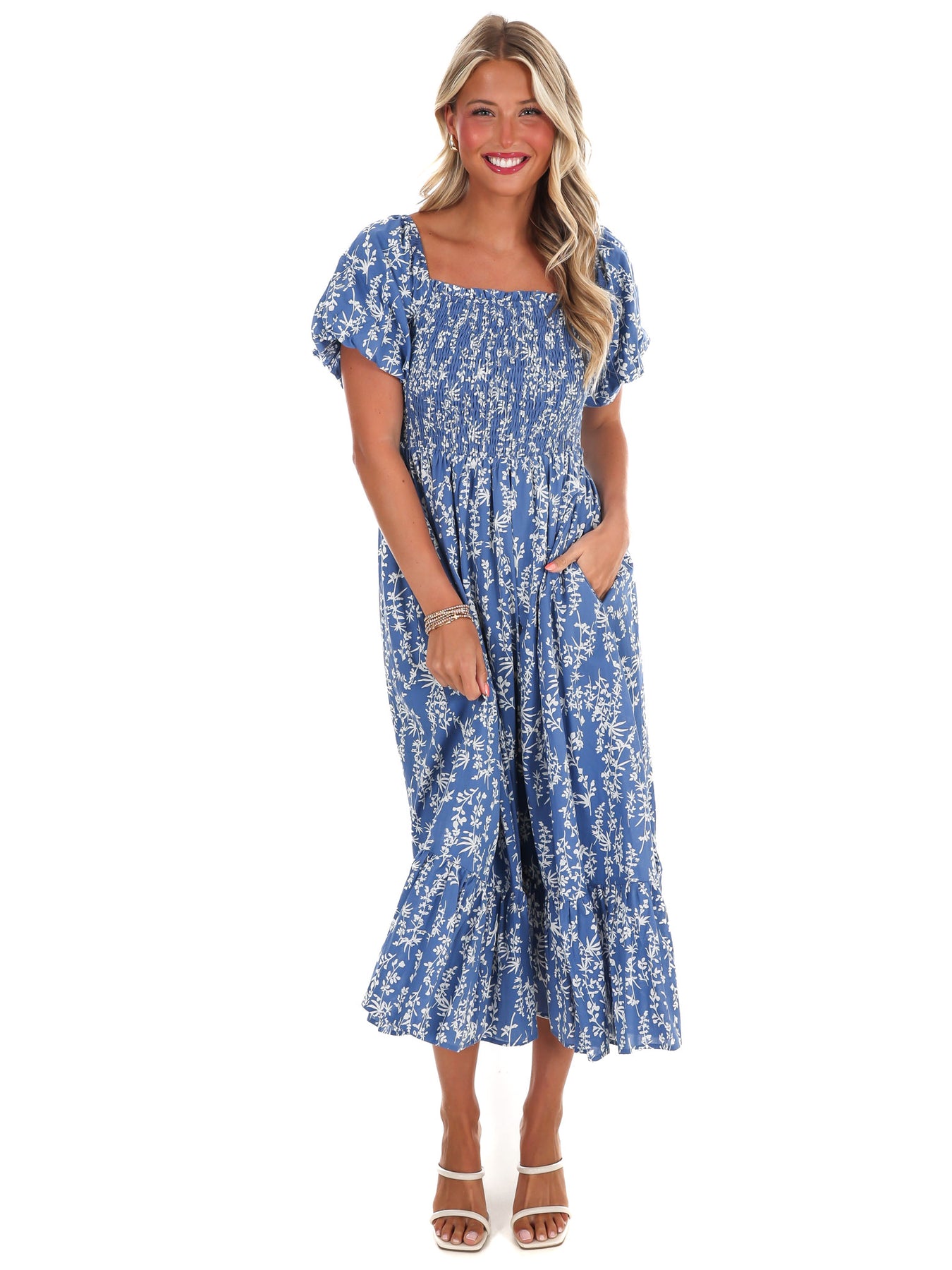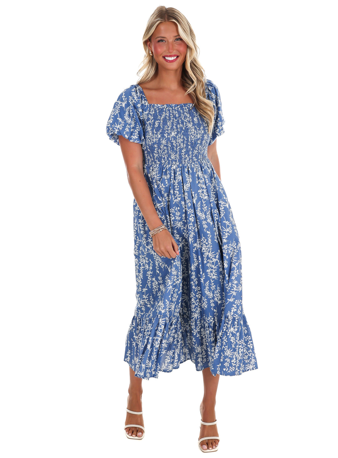 Experience the beauty of now in this romantic floral midi dress! With its square neckline and smocked design, this dress is both flattering and comfortable. The leaf print adds a touch of nature, while the lined, short bubble-sleeves give a whimsical feel. Perfect for any occasion, this midi dress will make you feel confident and beautiful.