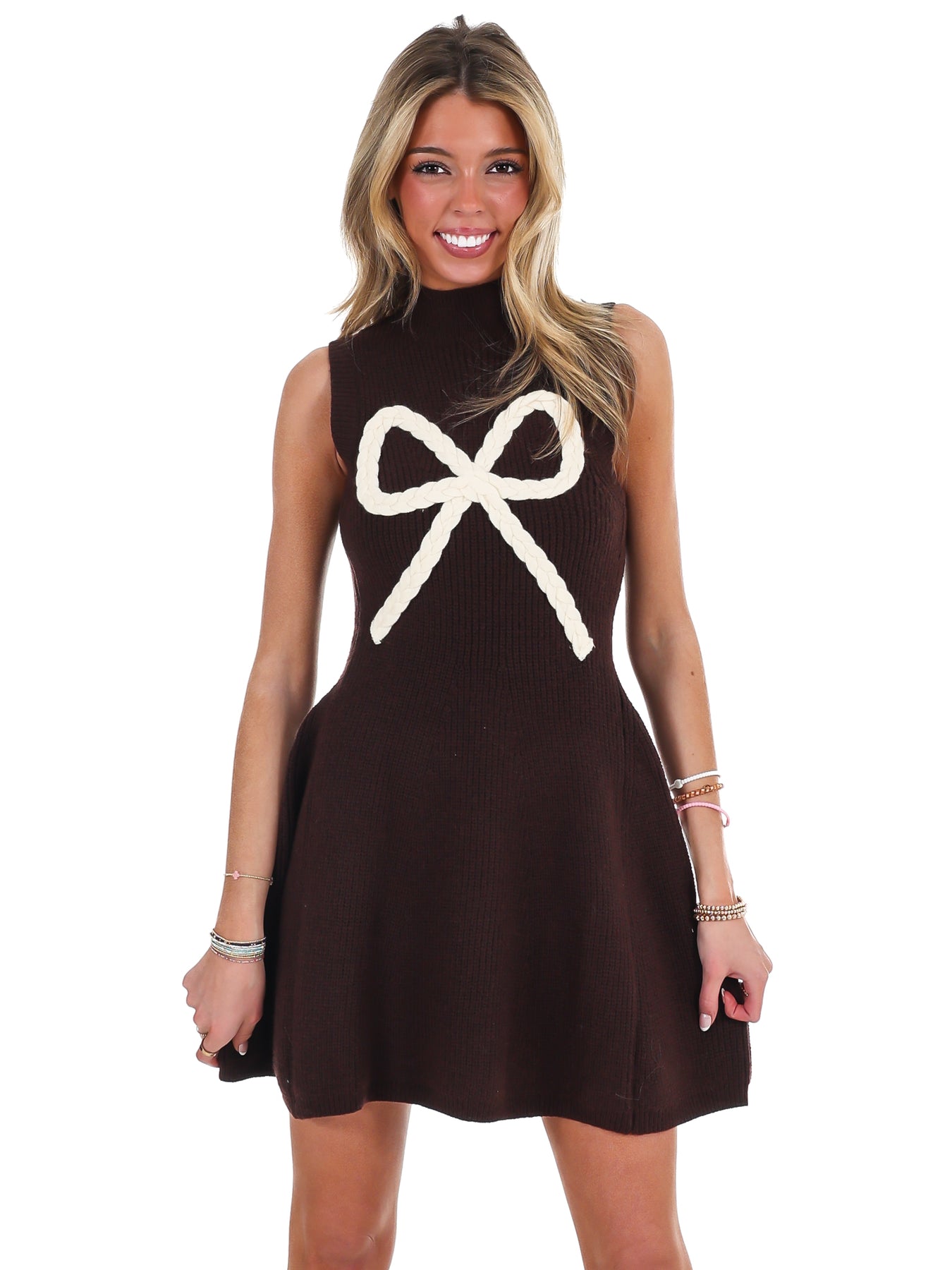 Elevate your everyday style with this charming sweater dress featuring an adorable braided bow detail. The sleeveless silhouette keeps things breezy while the fitted bodice and flared mini skirt create a flattering, feminine shape. Perfect for layering over tees or wearing solo, this knitted piece transitions seamlessly from casual outings to cozy gatherings. A playful twist on classic knitwear that's sure to turn heads.