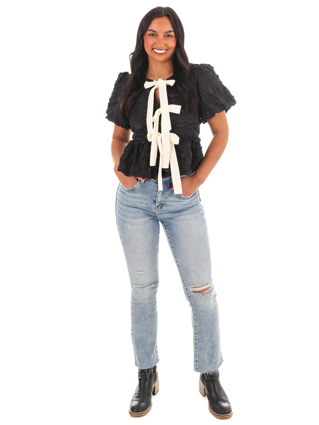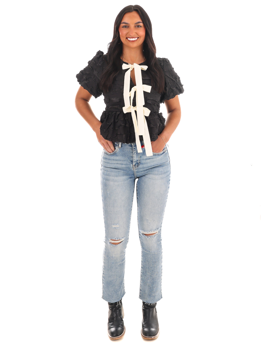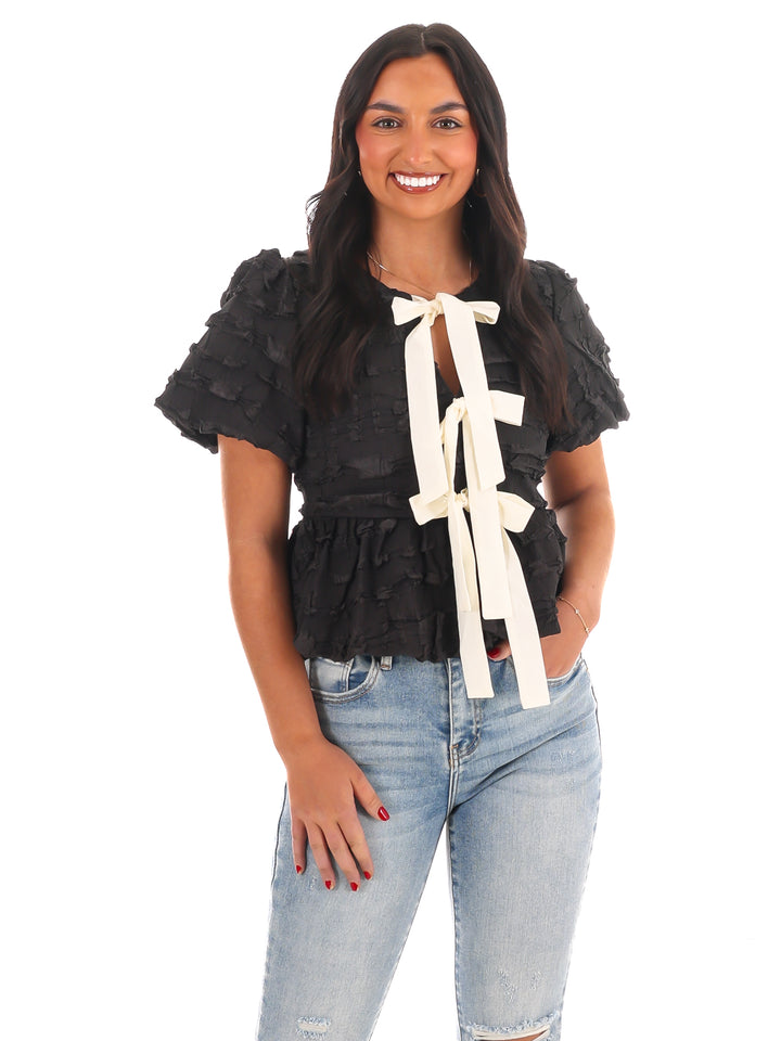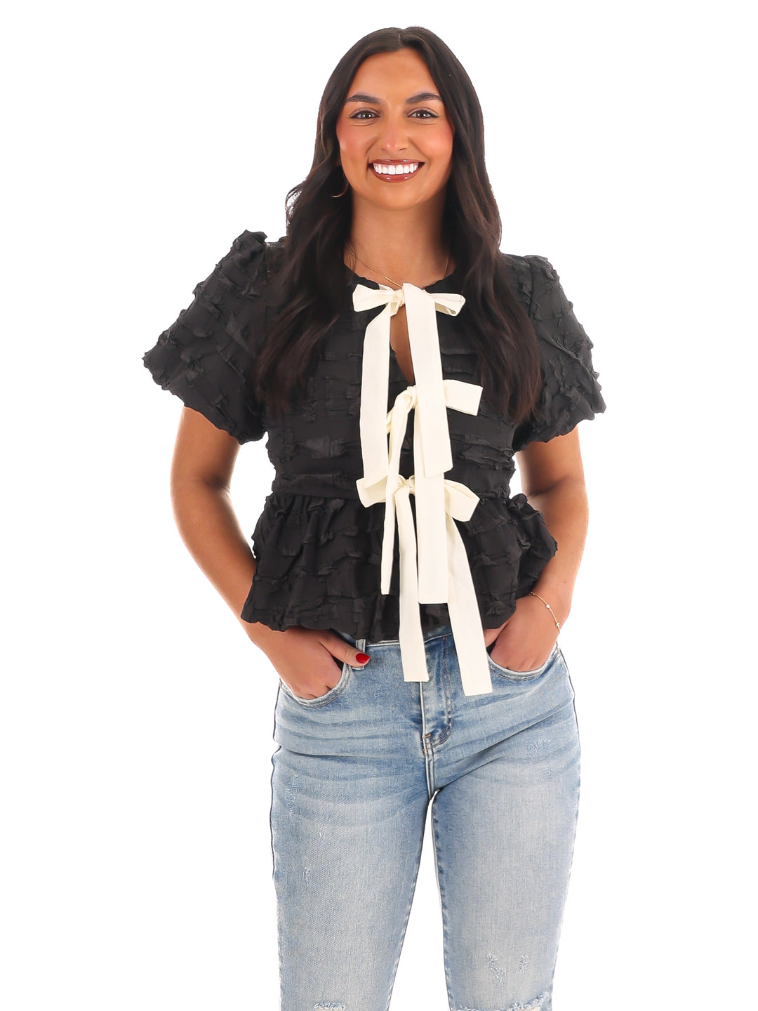 Unleash your inner romantic with the Build Me Up Bubble Tie Top. This effortlessly stylish blouse features a soft textured fabric and a cute babydoll silhouette. The puffy bubble sleeves and tie-front detailing add a touch of whimsy to your look. Perfect for a timeless and playful outfit.