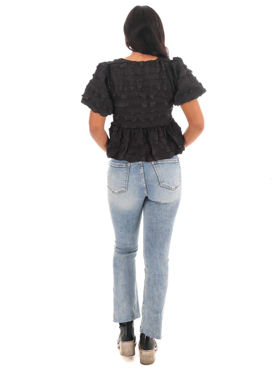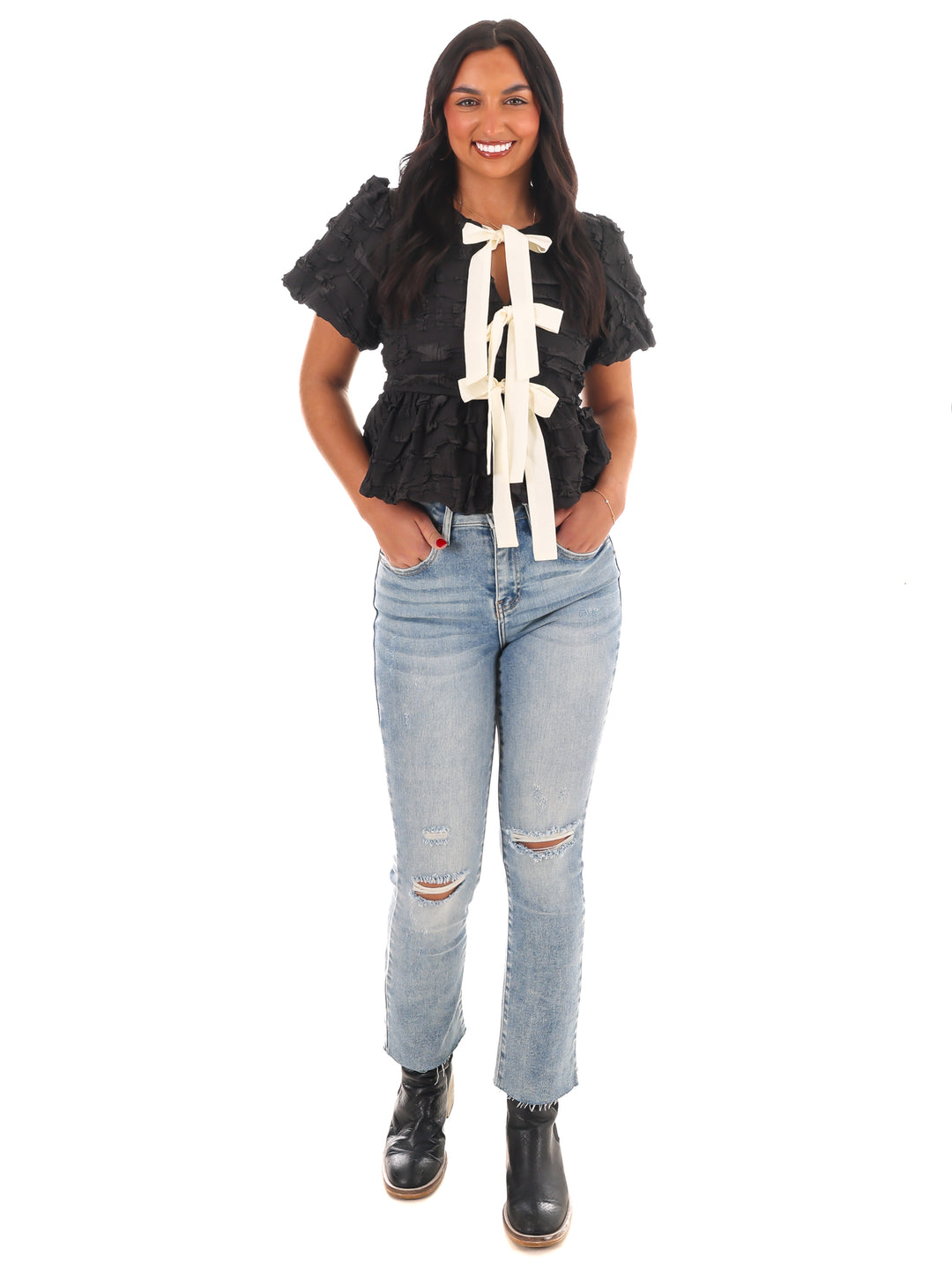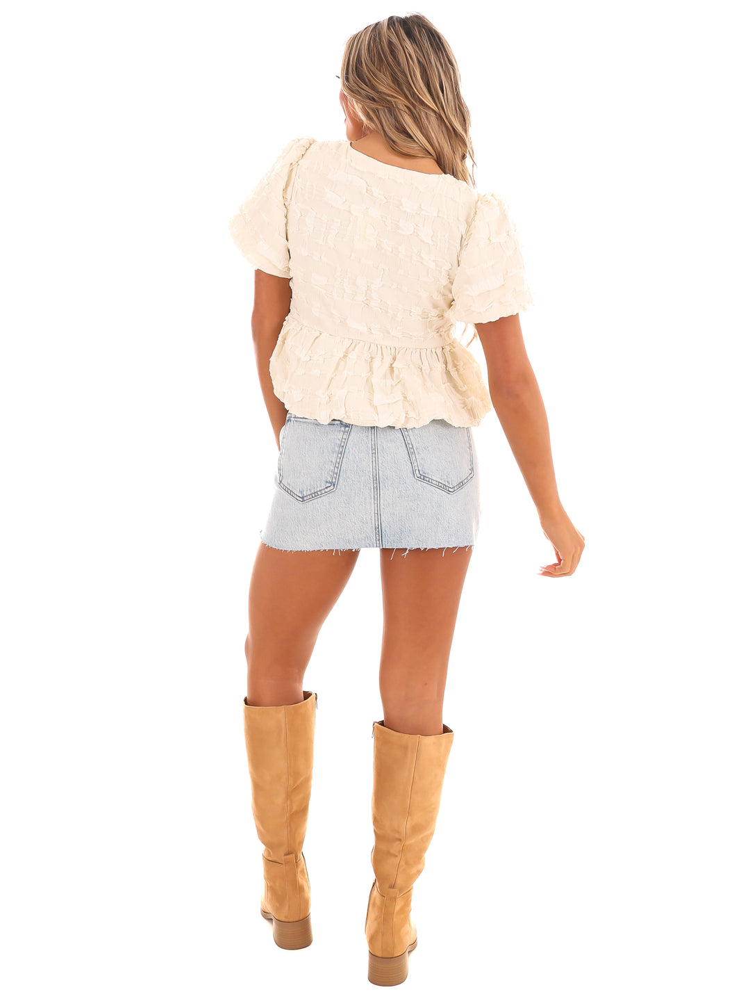 Unleash your inner romantic with the Build Me Up Bubble Tie Top. This effortlessly stylish blouse features a soft textured fabric and a cute babydoll silhouette. The puffy bubble sleeves and tie-front detailing add a touch of whimsy to your look. Perfect for a timeless and playful outfit.