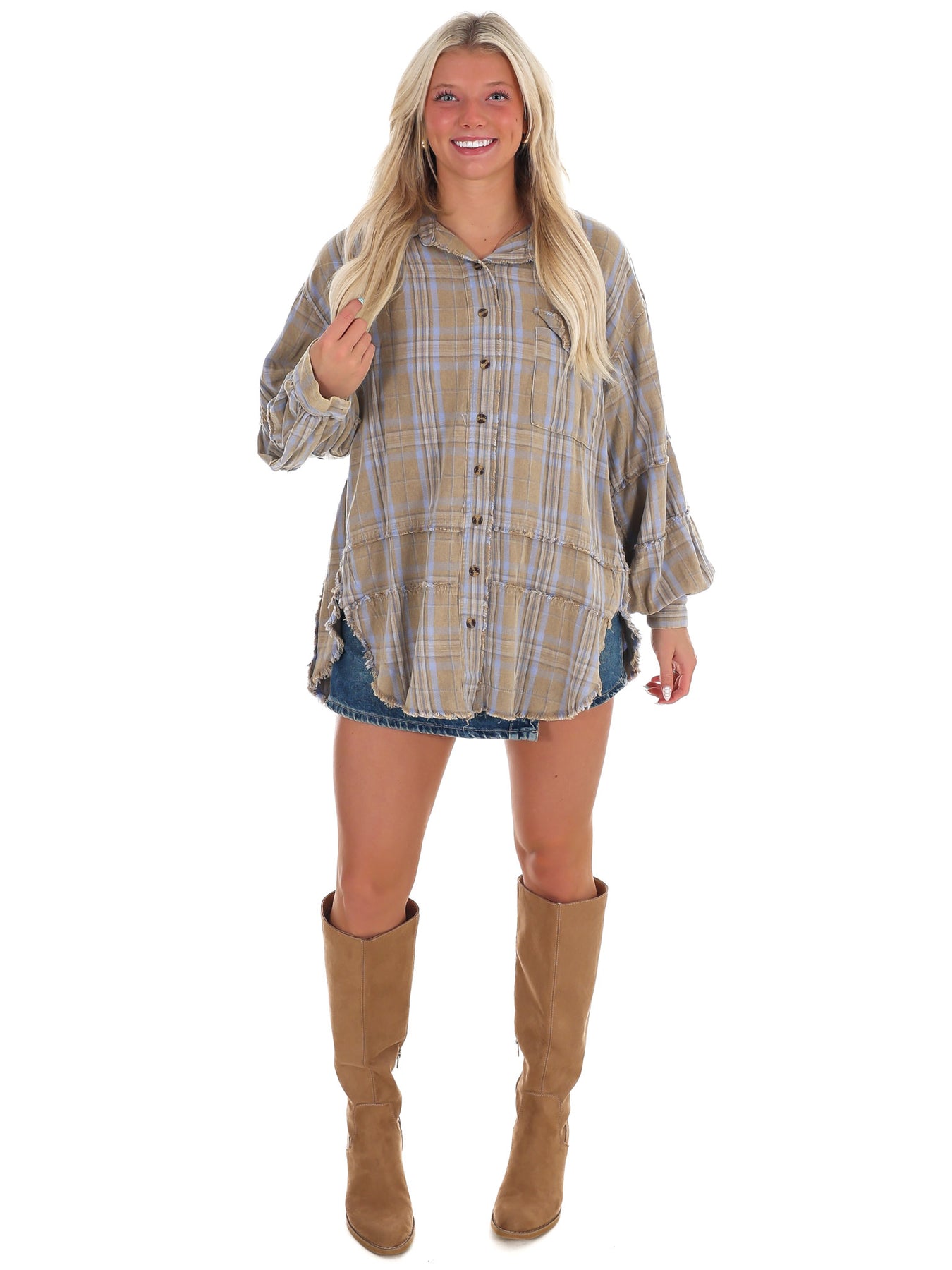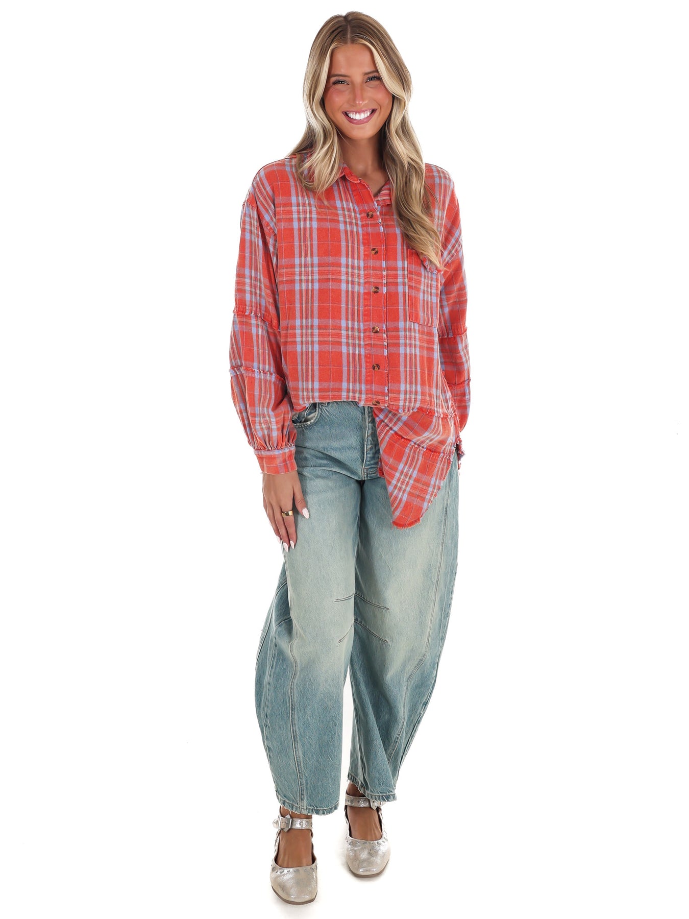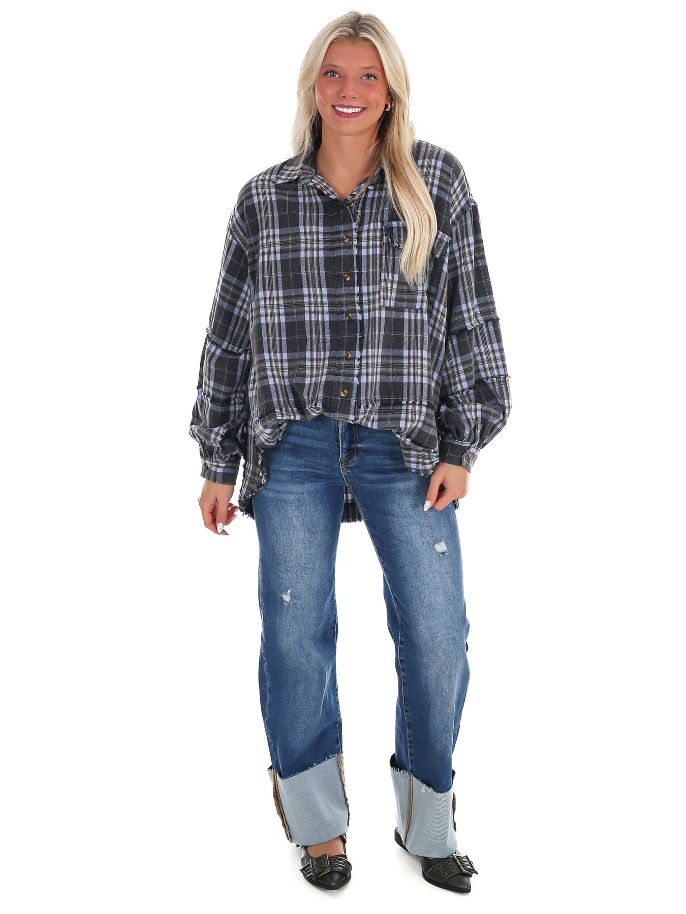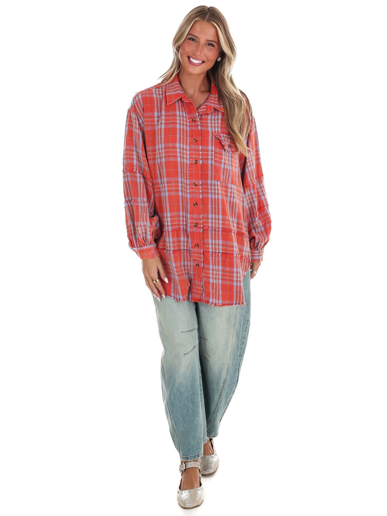 The Campfire Plaid Button Up Top combines cozy flannel fabric with a mineral-washed finish for a soft, broken-in feel. This oversized plaid shacket features a button-down front, chest patch pocket, and long sleeves with buttoned cuffs, making it easy to layer and style. Its curved hem adds a relaxed touch, perfect for everyday comfort and warmth.