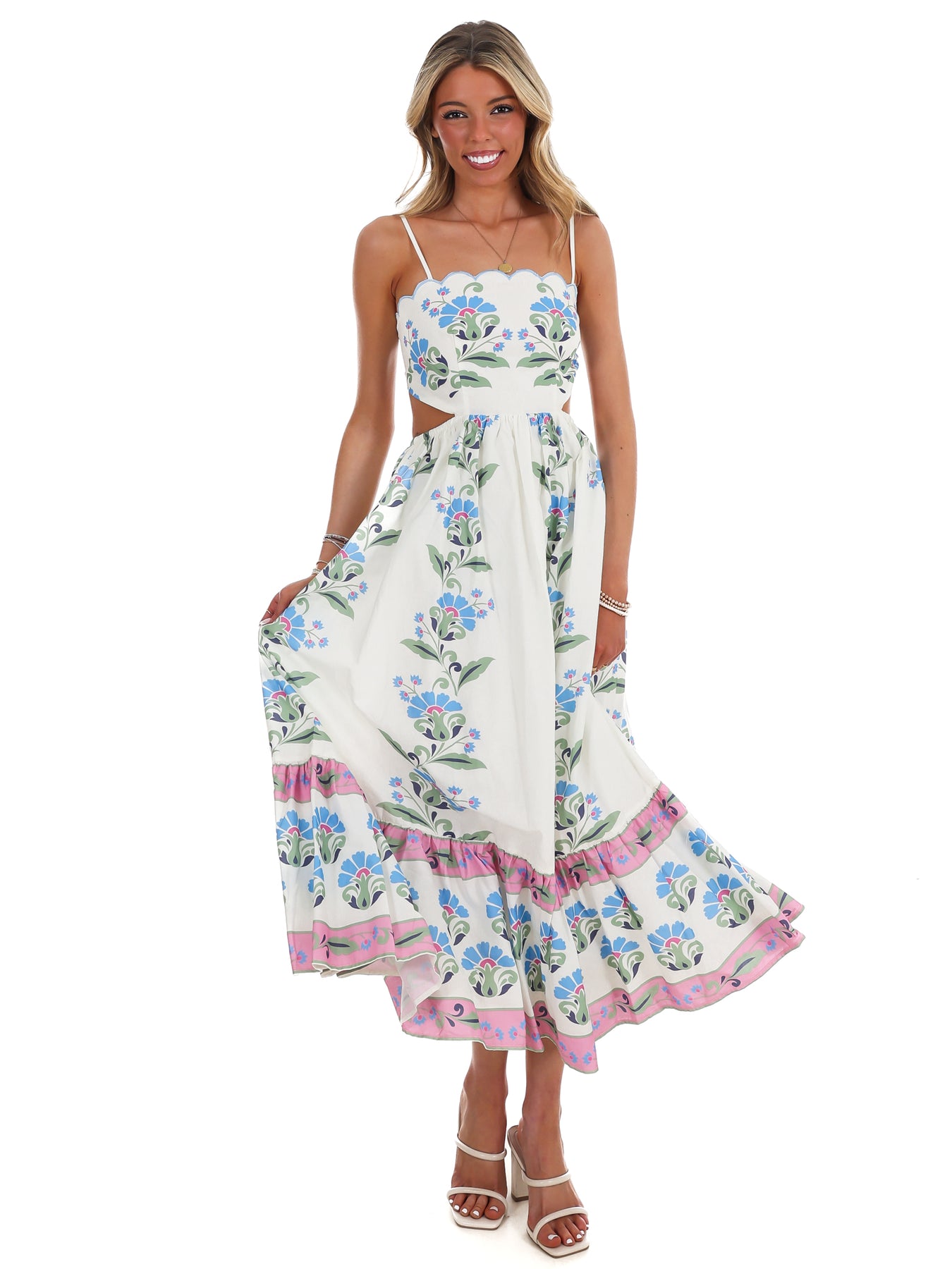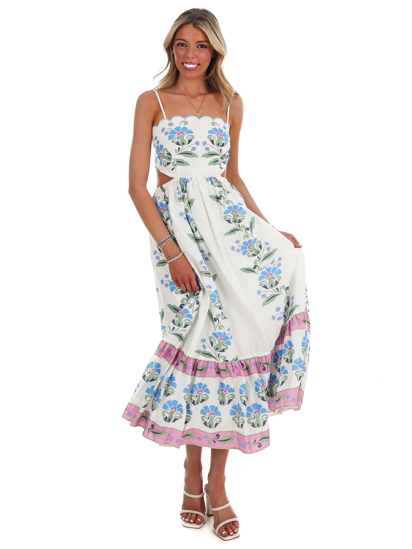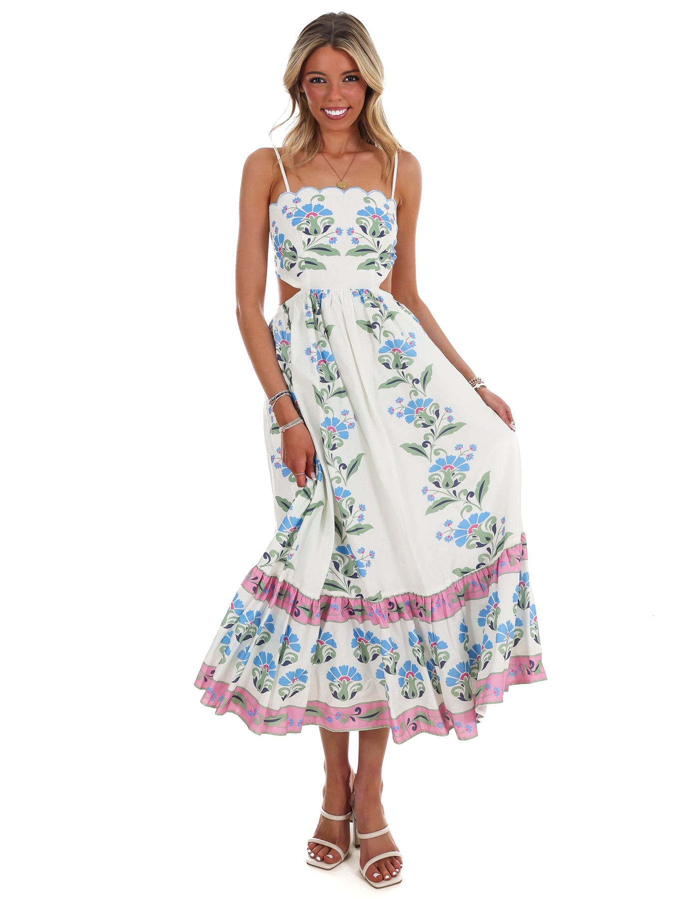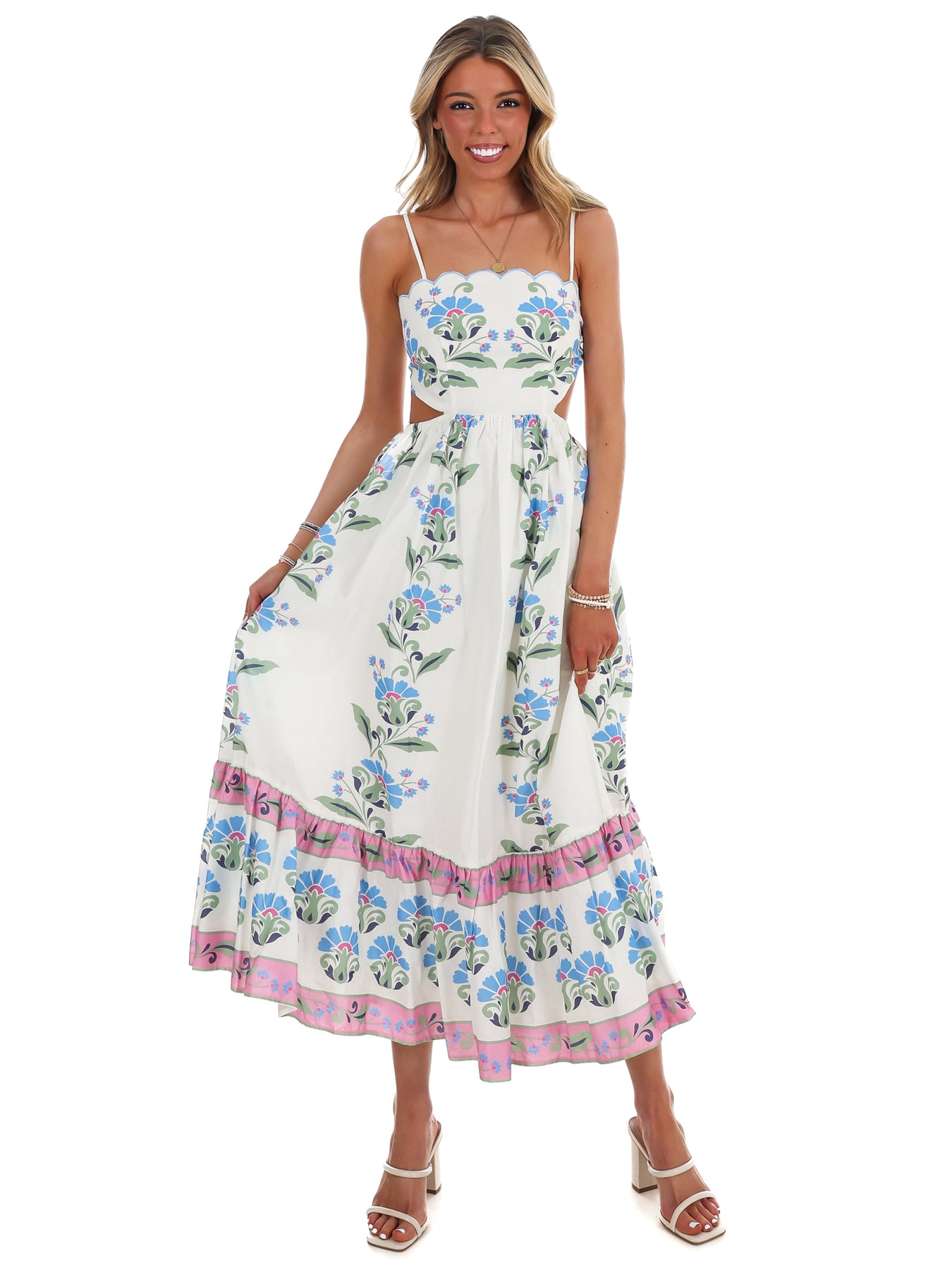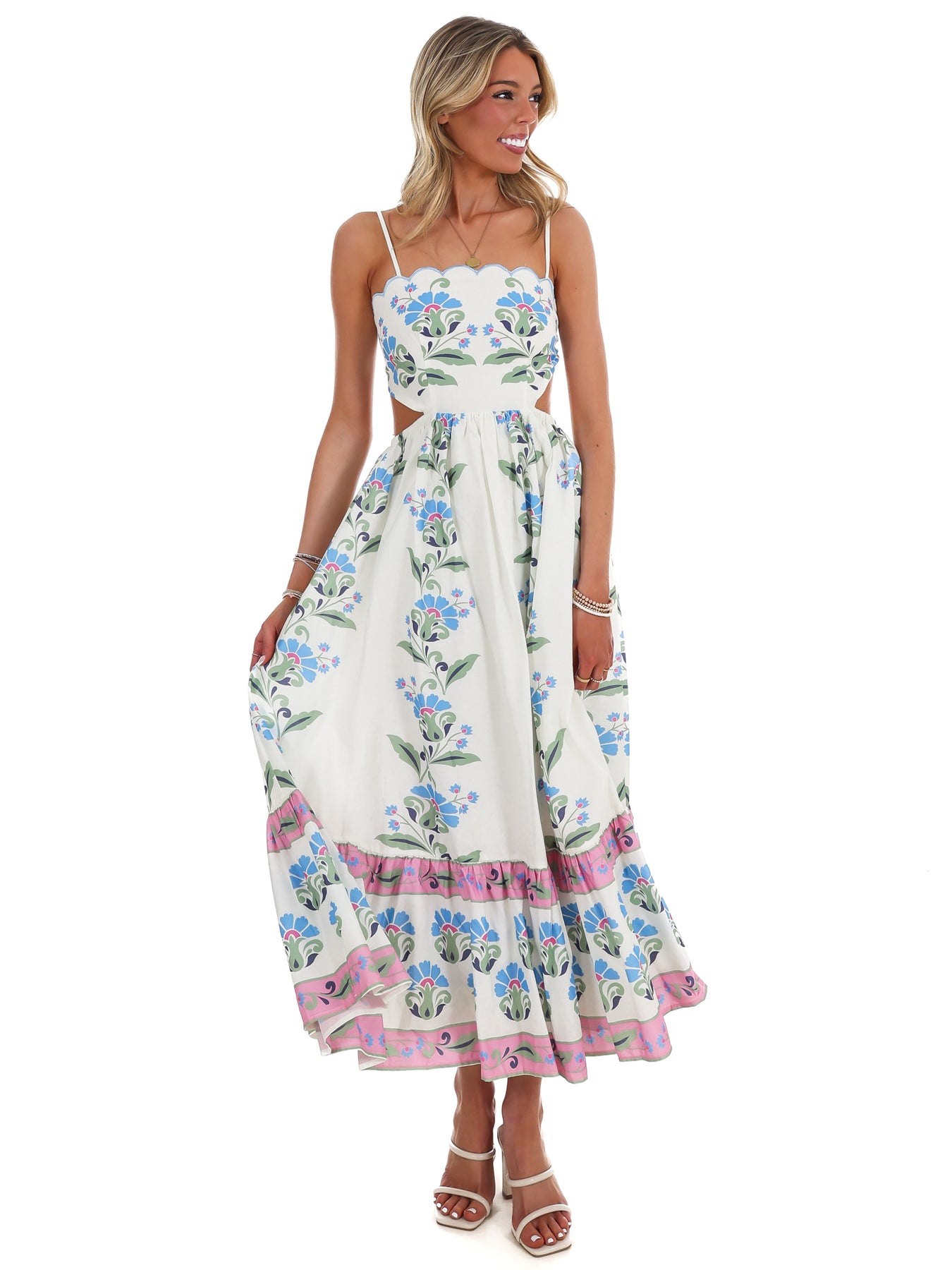 Brighten your wardrobe with this charming floral midi dress! Featuring a delicate scalloped neckline and playful cutout details along the sides and back, it's designed to turn heads. Adjustable spaghetti straps let you customize the fit, while the back elastic band and hook-and-eye closure ensure a secure, comfortable wear. Lined for coverage and confidence. Perfect for garden parties, brunch dates, or any occasion calling for effortless elegance with a touch of whimsy.