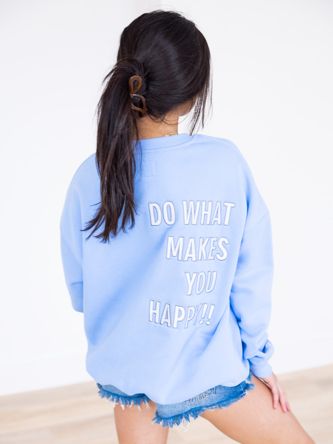 Find comfort and joy in our "Do What Makes You Happy" sweatshirt. With stylish embroidery details and a cozy crew neckline, this sweatshirt reminds you to prioritize your happiness. Choose to do what makes you happy with this playful and quirky sweatshirt.