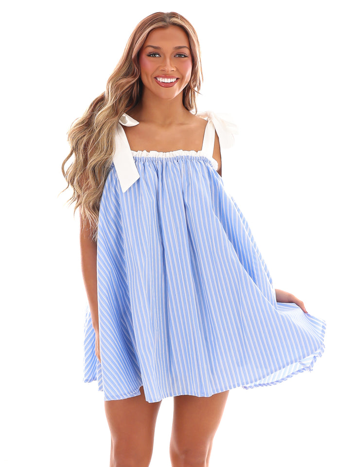 Experience effortless style with our Faithfully Pin Stripe Mini Dress. With self tie shoulder straps, this strapless mini dress provides a flattering fit for any body type. Stay comfortable and stylish with the added lining.