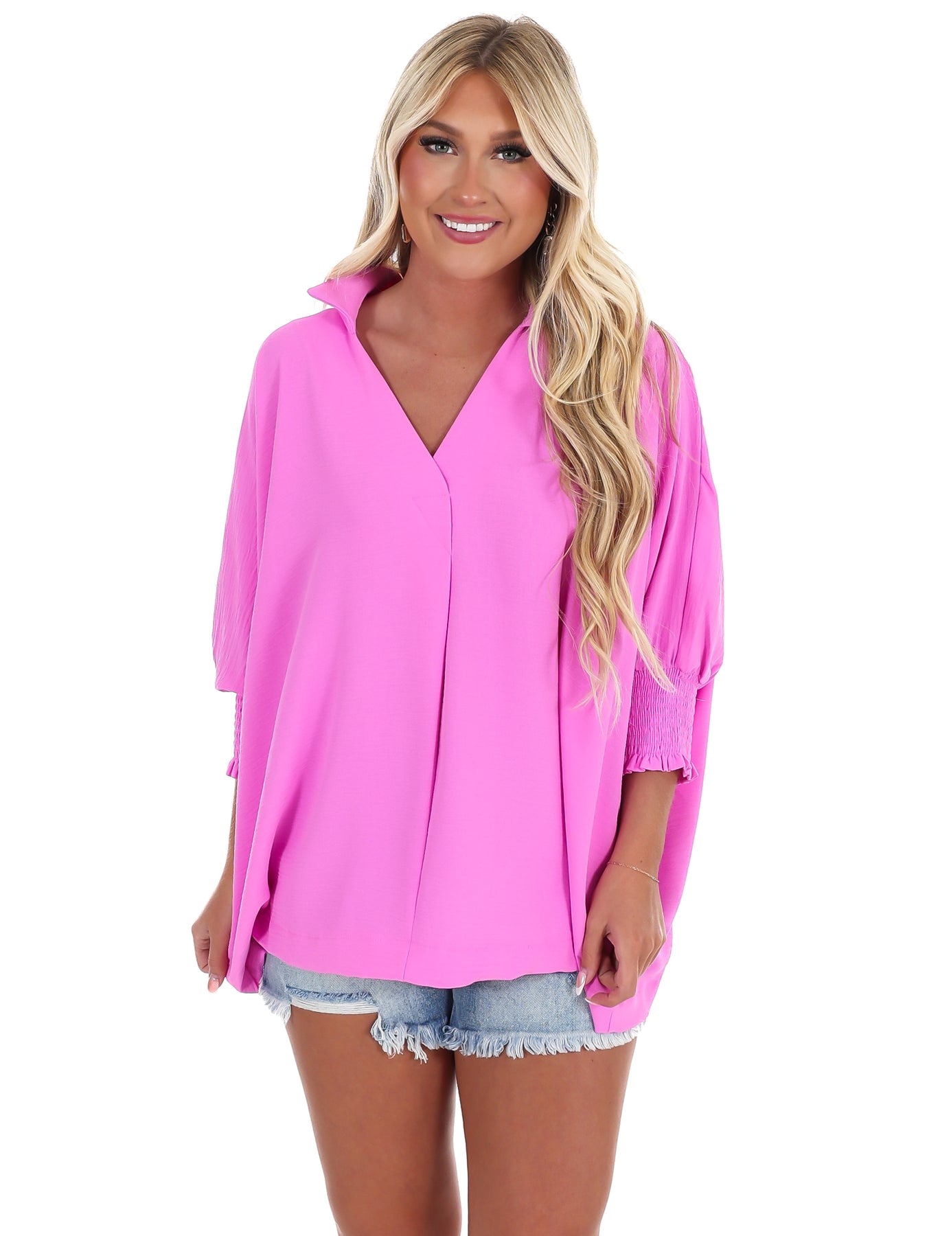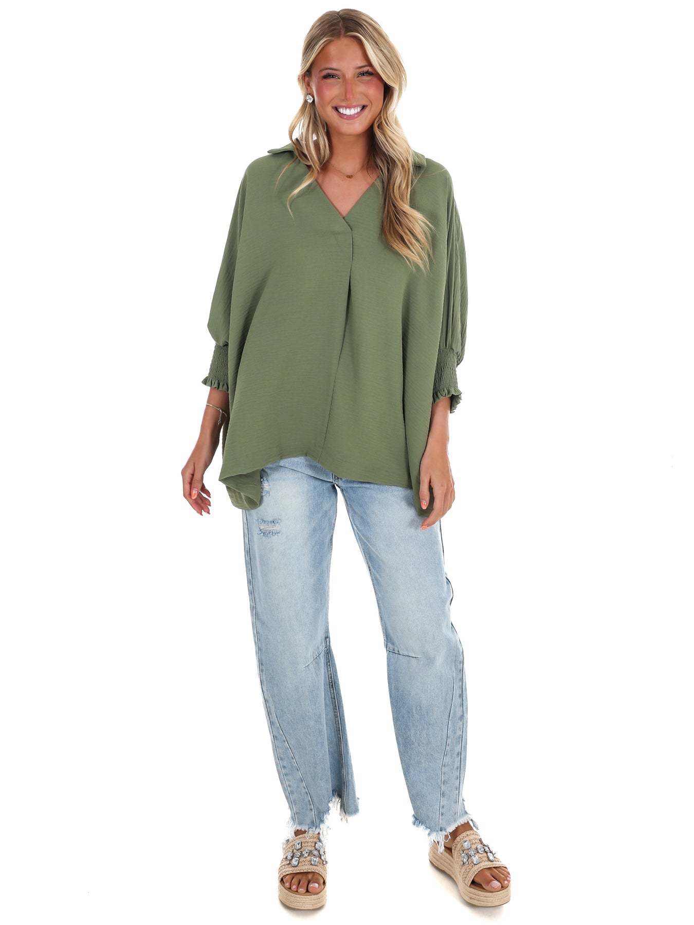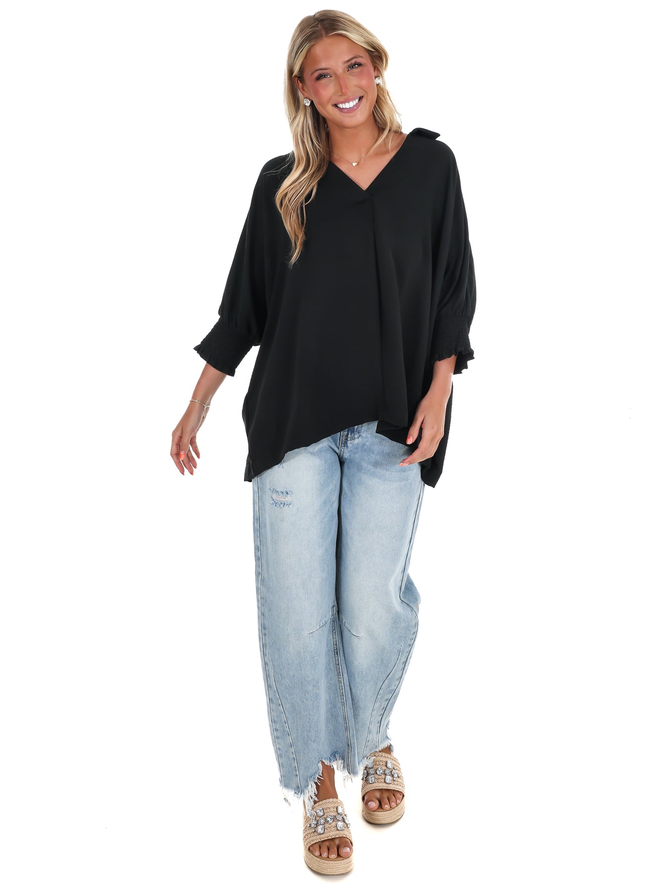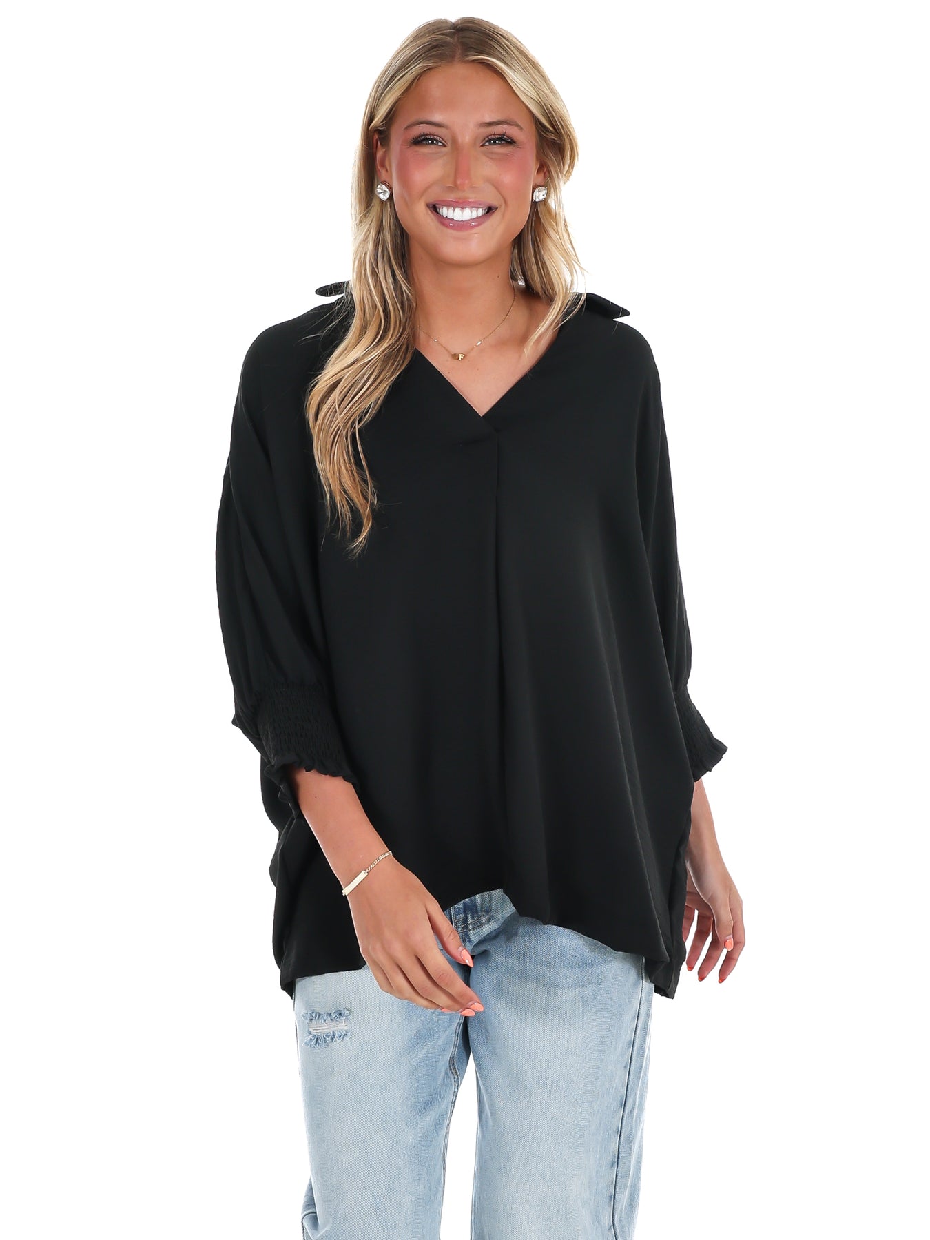 Experience the ultimate comfort and style with our First Light V-Neck Top. Featuring an airflow collar and smocked sleeve bands, this top is perfect for all-day wear. The collared V-neckline adds a touch of elegance to any outfit. Elevate your wardrobe with this versatile and trendy top!
