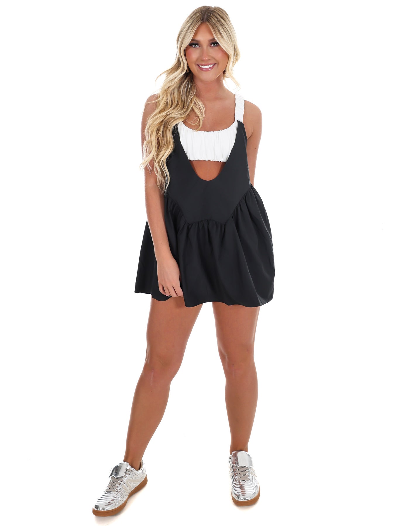 Stay cool on the court in this feminine set featuring a billowy dress in a lightweight fabrication with ruched bra piecing and matching performance shorts in a bold color block style.