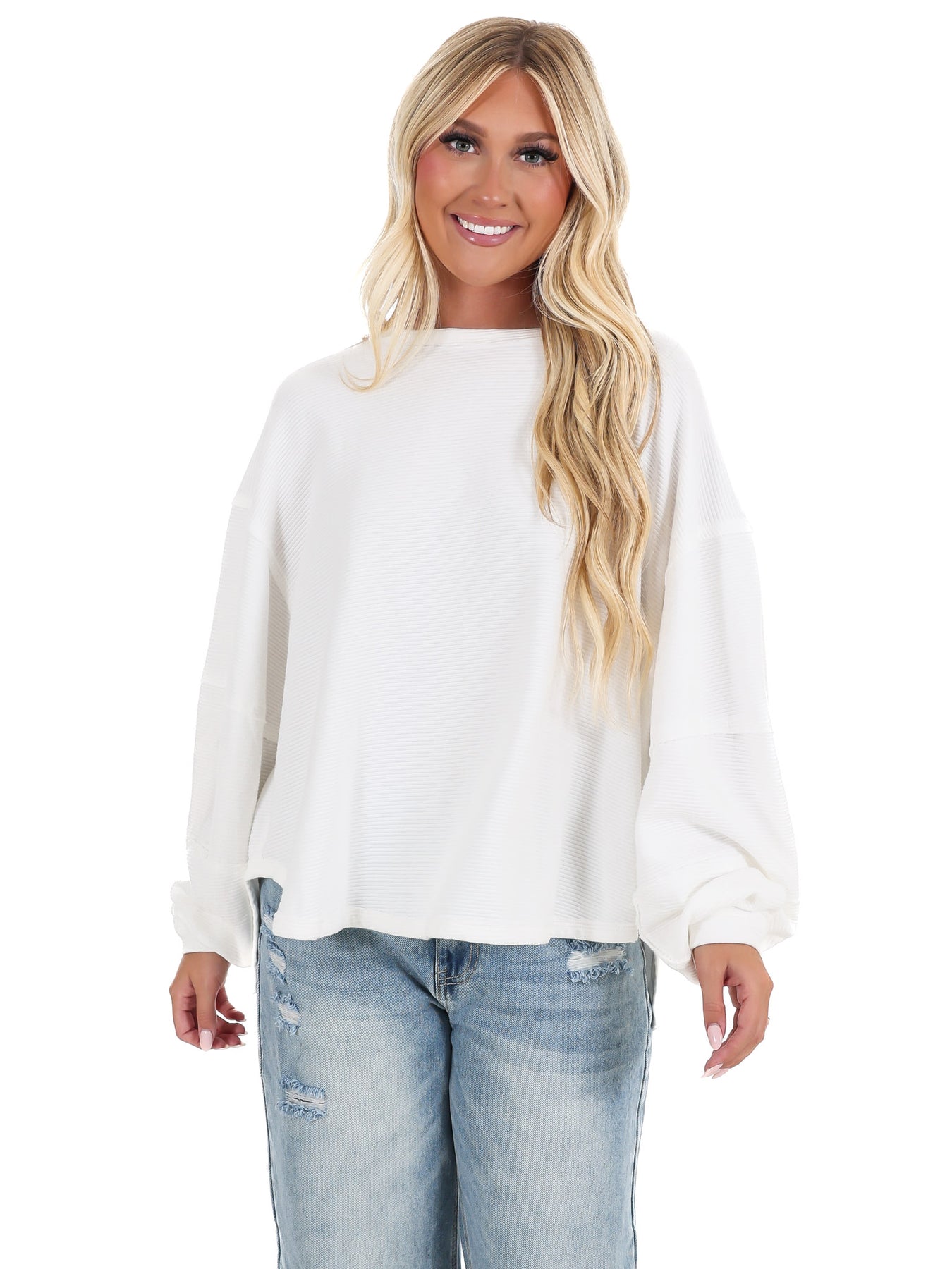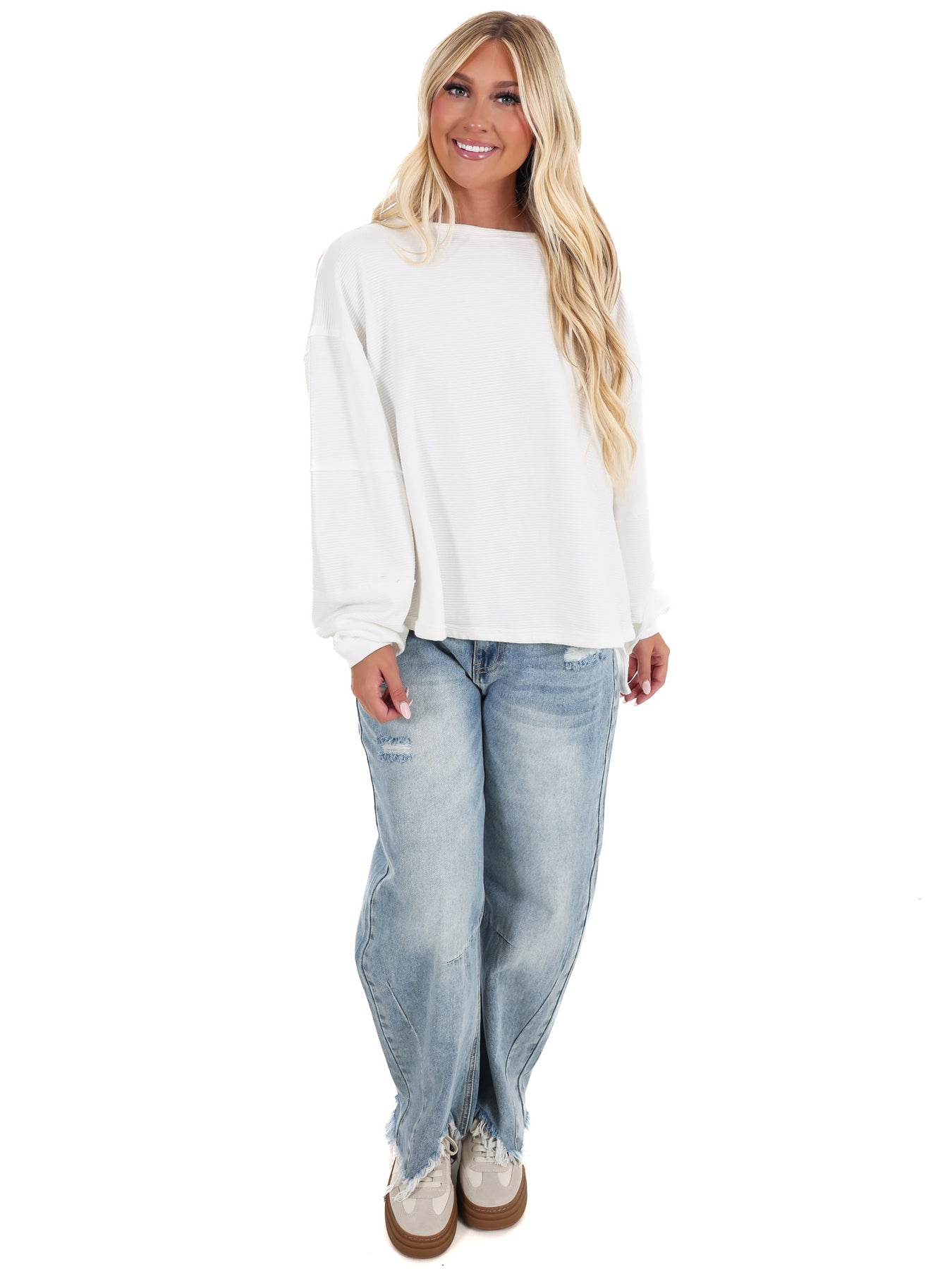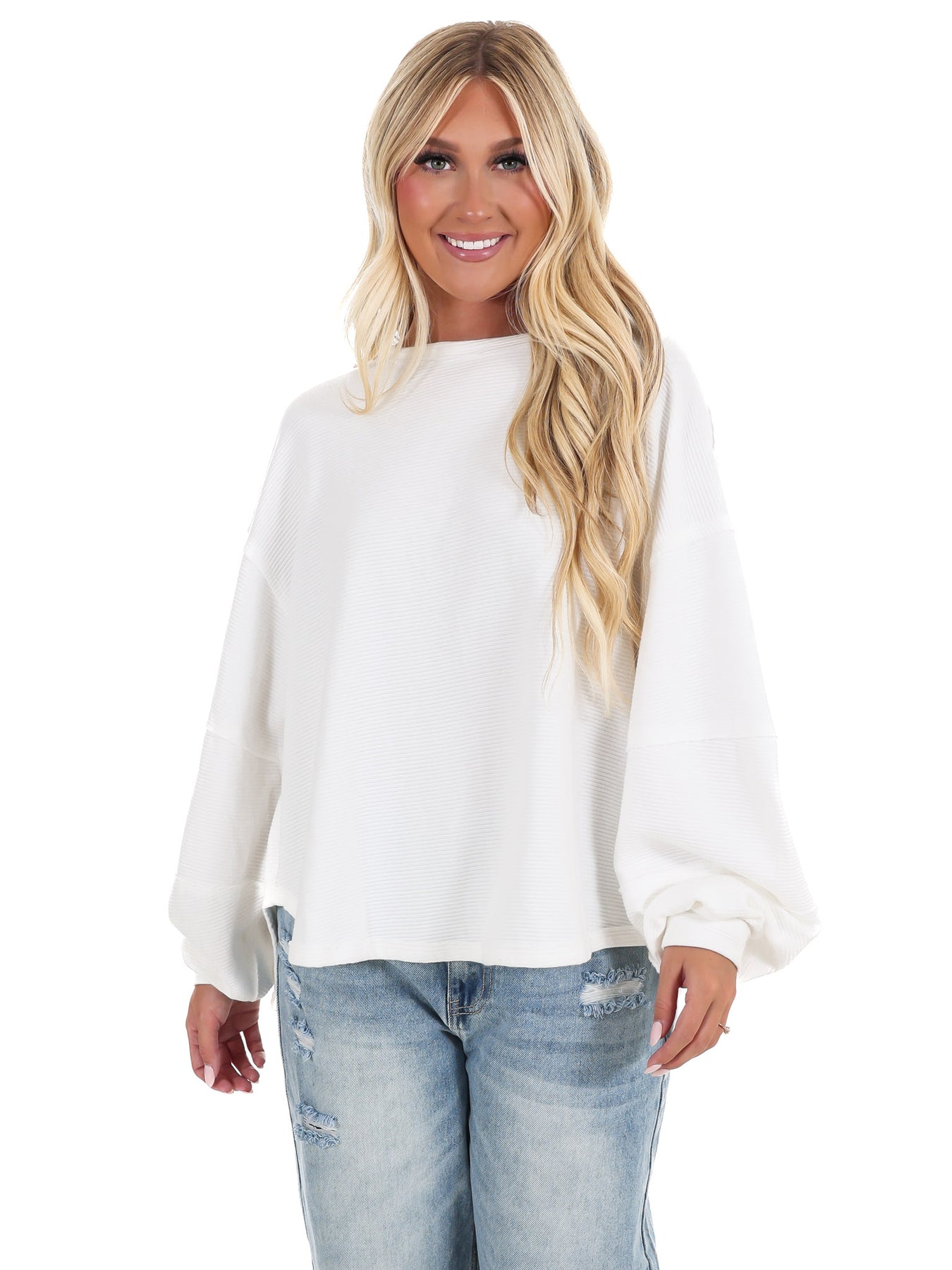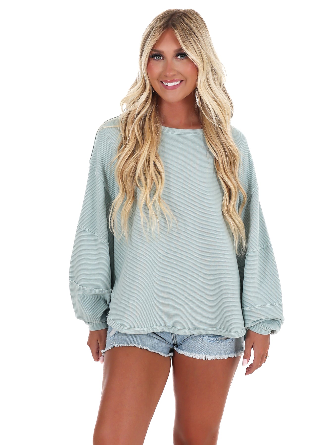 Features: Soft ribbed knit fabrication, slight scoop neckline, dropped dolman sleeves with cuffed hems, raw trim throughout