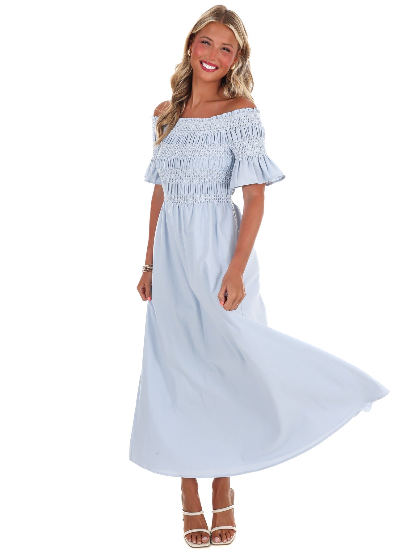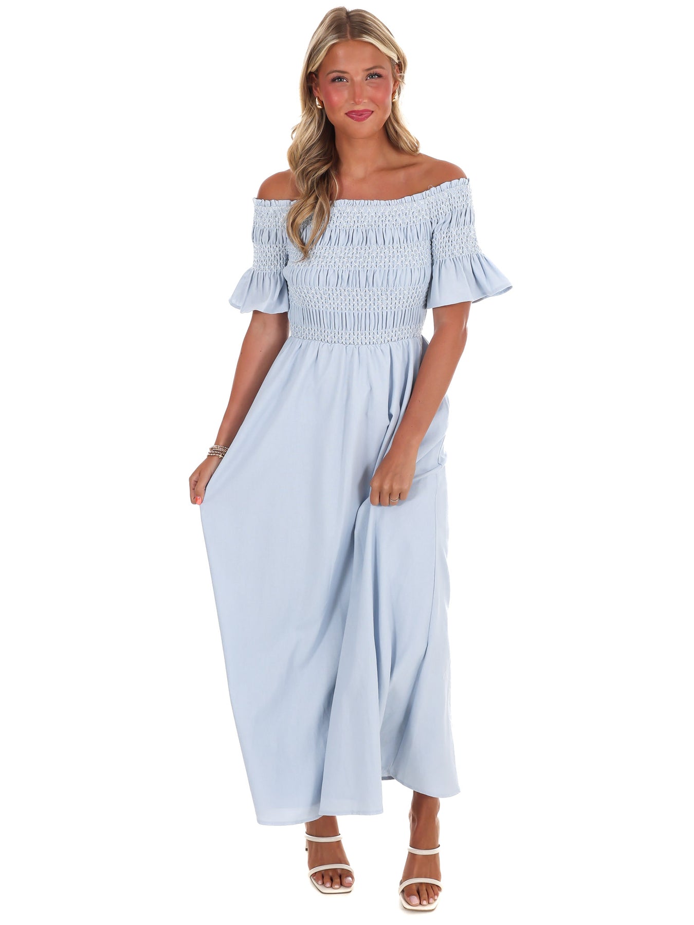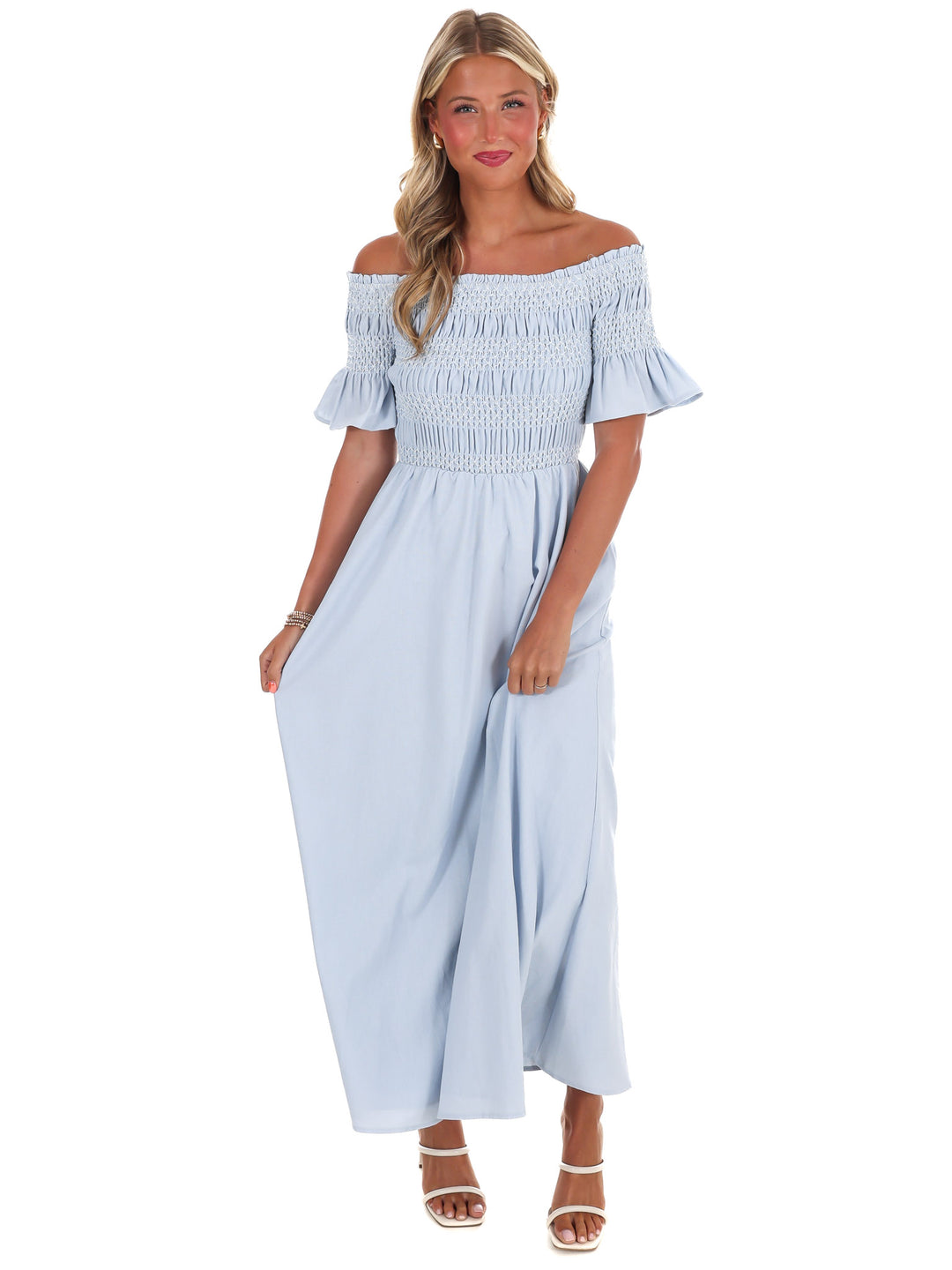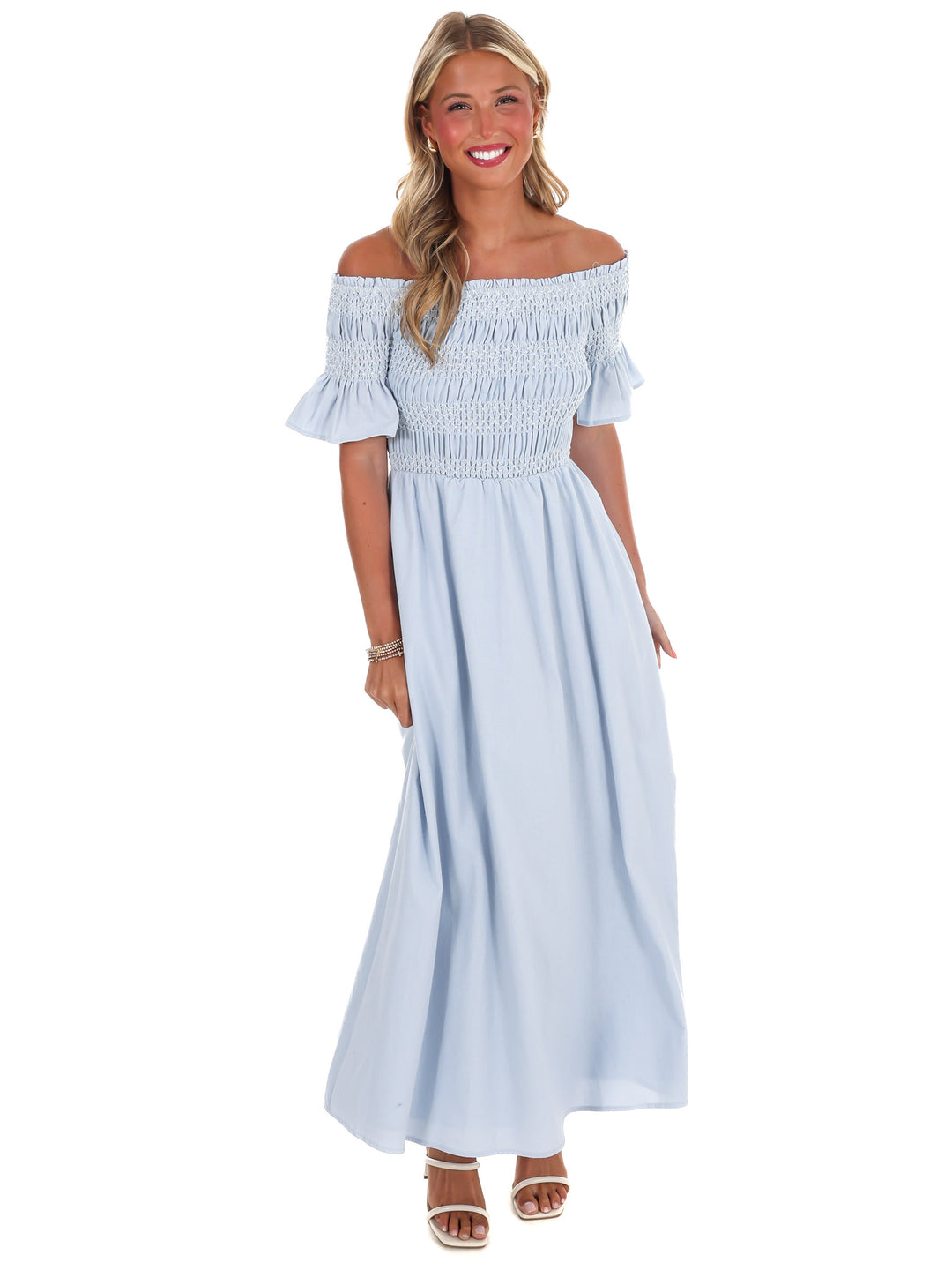 Indulge in moments of peace and tranquility with our In the Quiet Moments Maxi Dress. Made from luxurious linen fabric, this off shoulder dress features a special smocked bust detail and is fully lined for added comfort. Plus, with convenient pockets, you can easily carry your essentials without sacrificing style.