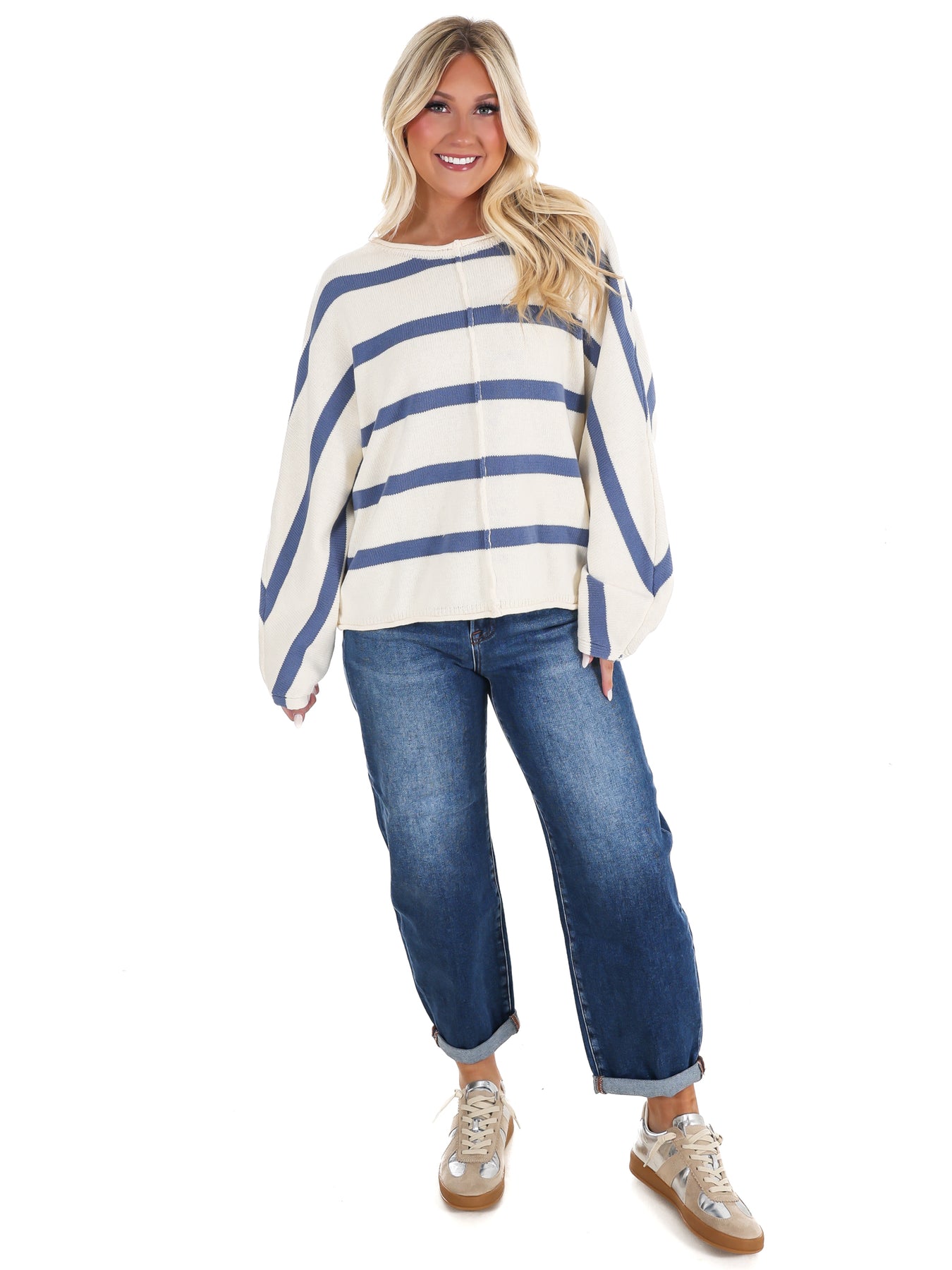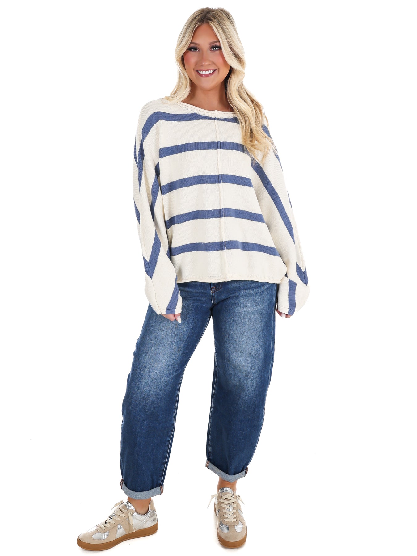 Effortlessly cool meets comfort in this striped sweater top. The oversized silhouette and flowy dolman sleeves create a relaxed vibe that works whether you're heading to the office or grabbing coffee with friends. Exposed seam detailing adds an unexpected design twist that keeps things interesting. Throw it on with your favorite jeans, dress it up with tailored trousers, or layer it over a tee—this versatile piece does it all without trying too hard.
