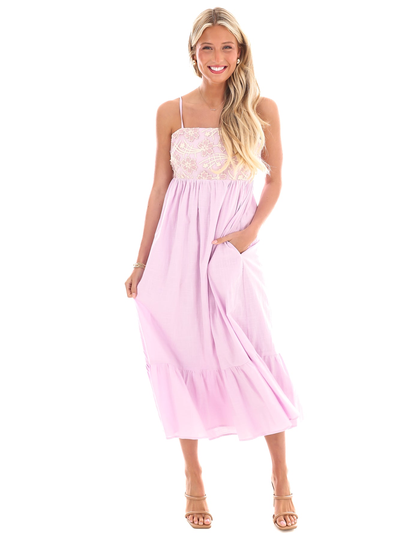 Elevate your summer wardrobe with our Lakeside Breeze Embroidered Midi Dress! Featuring gorgeous floral embroidery patchwork and a back ribbon detail, this square neck, sleeveless dress is perfect for any occasion. The ruffled hem and side pockets add a touch of playful charm. Add this beautiful cami dress to your collection today!