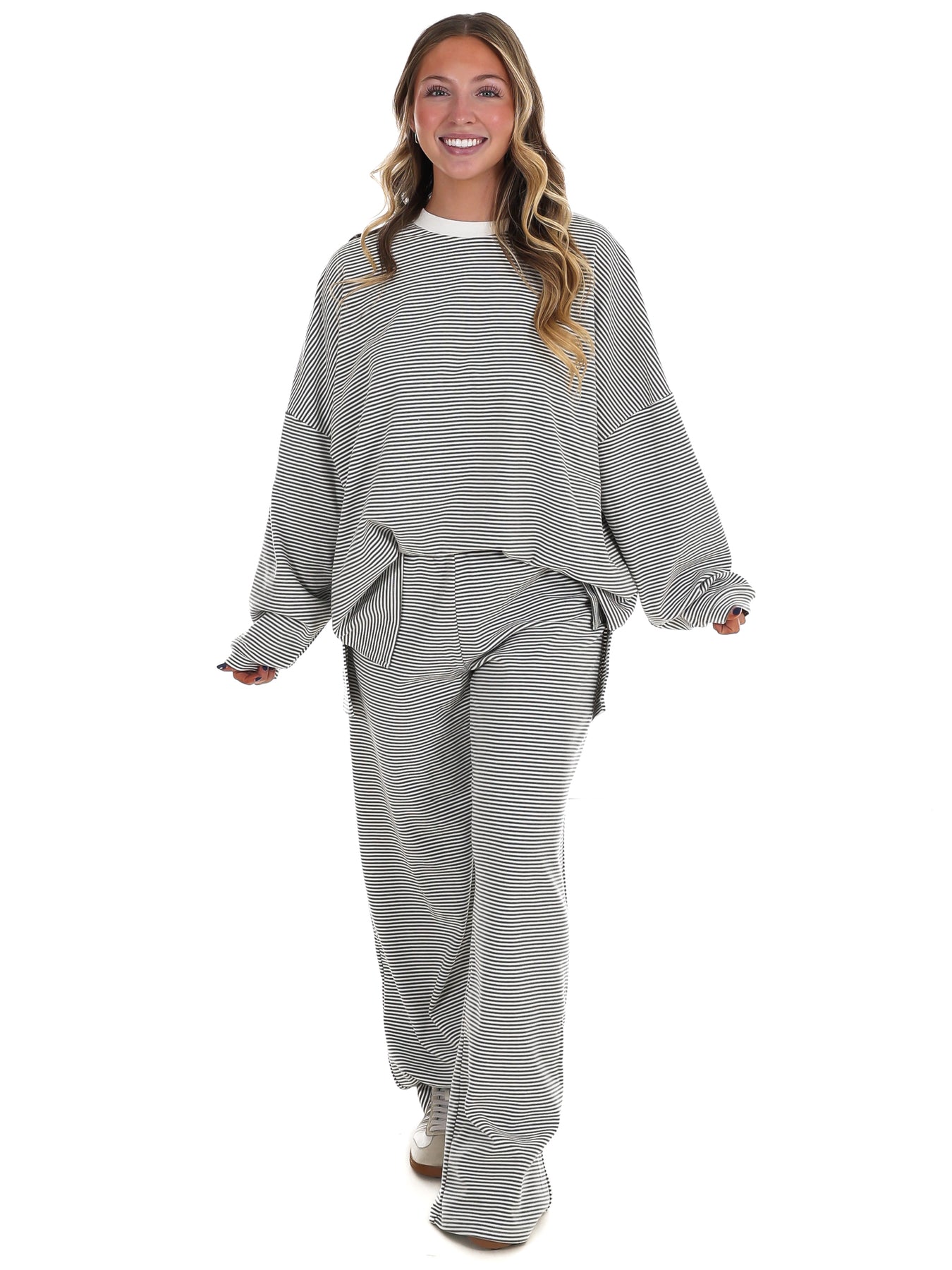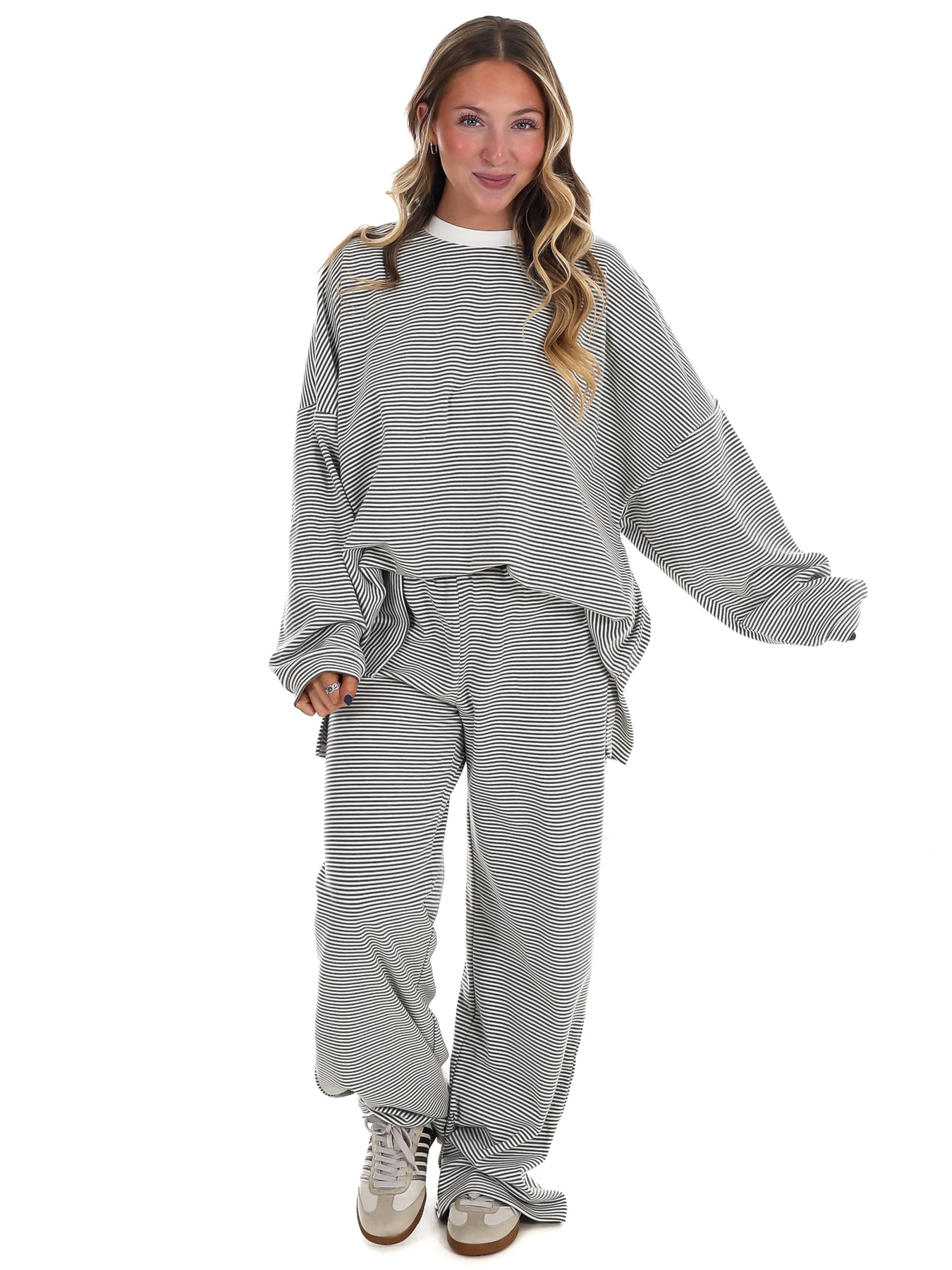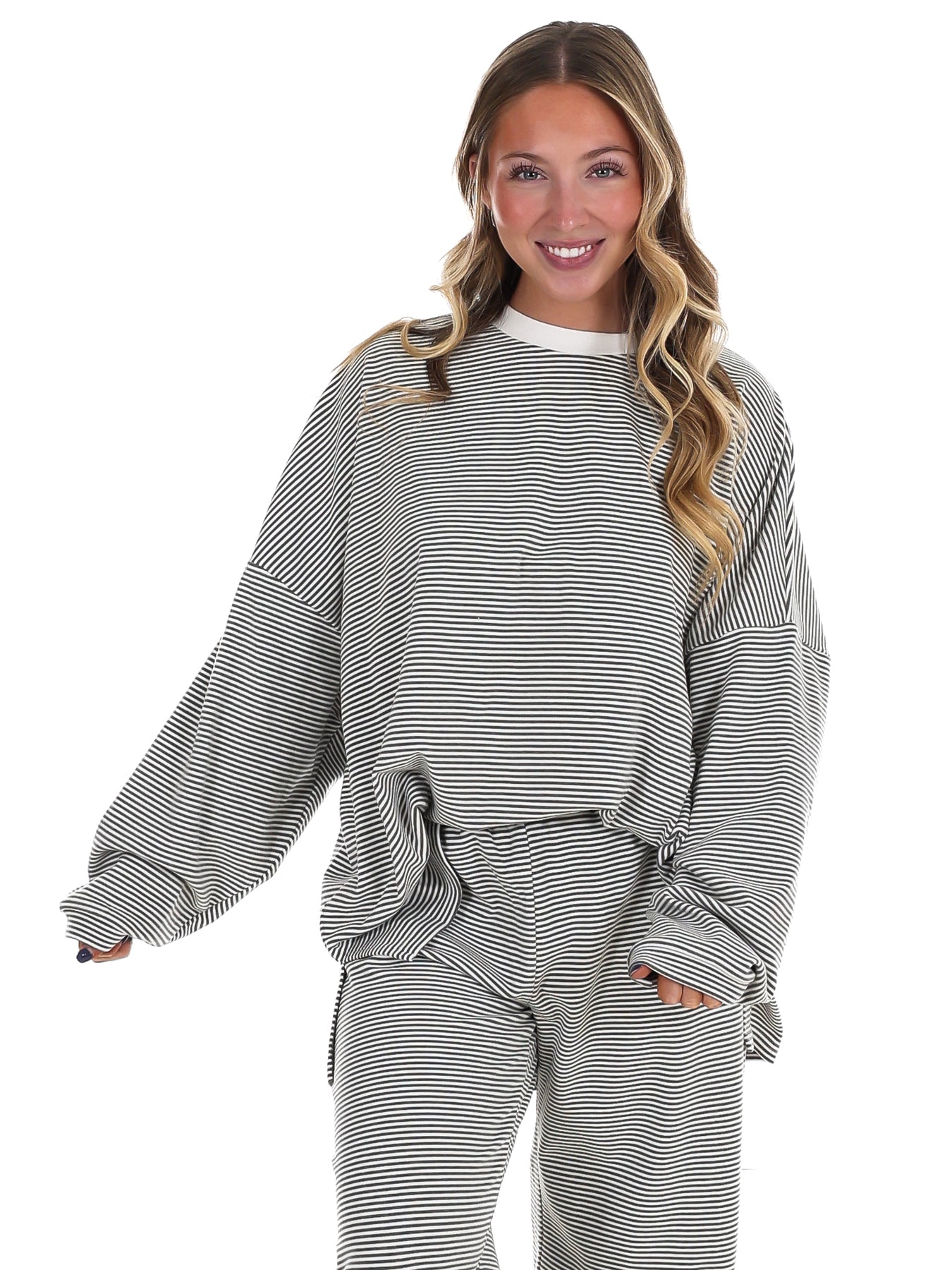 Throw on this striped oversized top and feel like you're wearing a cloud. The ultra-soft fabric hugs you in all the right ways—loose enough to move freely, cozy enough to live in. Perfect for lazy days, coffee runs, or whenever you want to look effortlessly put-together without trying too hard. Stripes never go out of style, and neither does comfort.