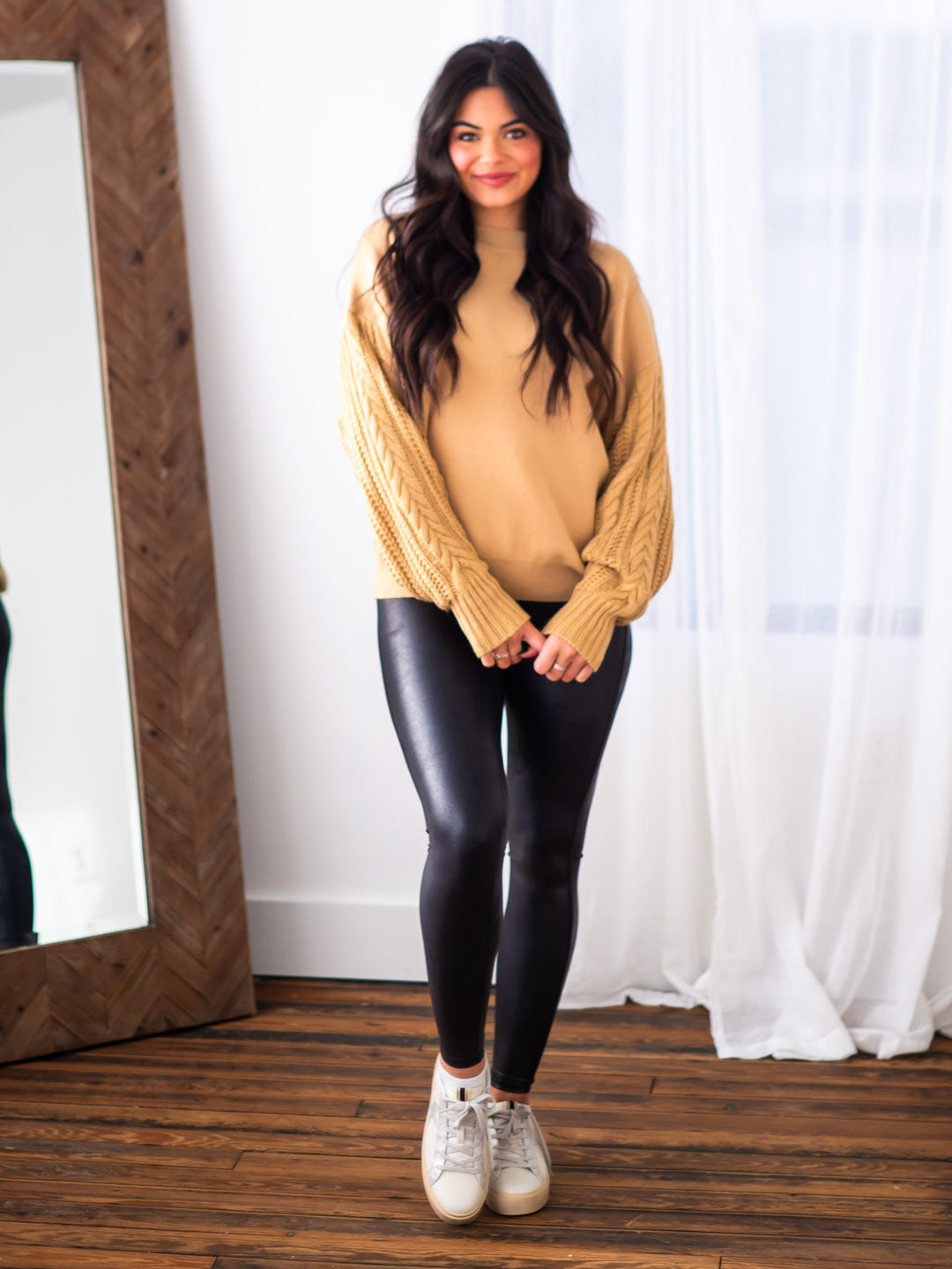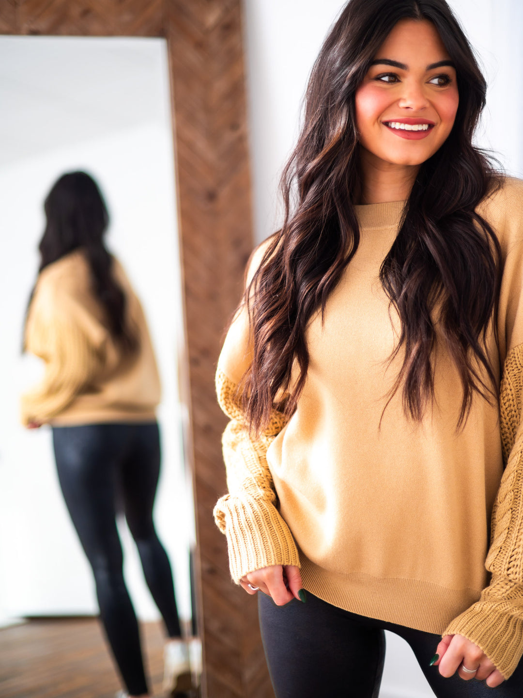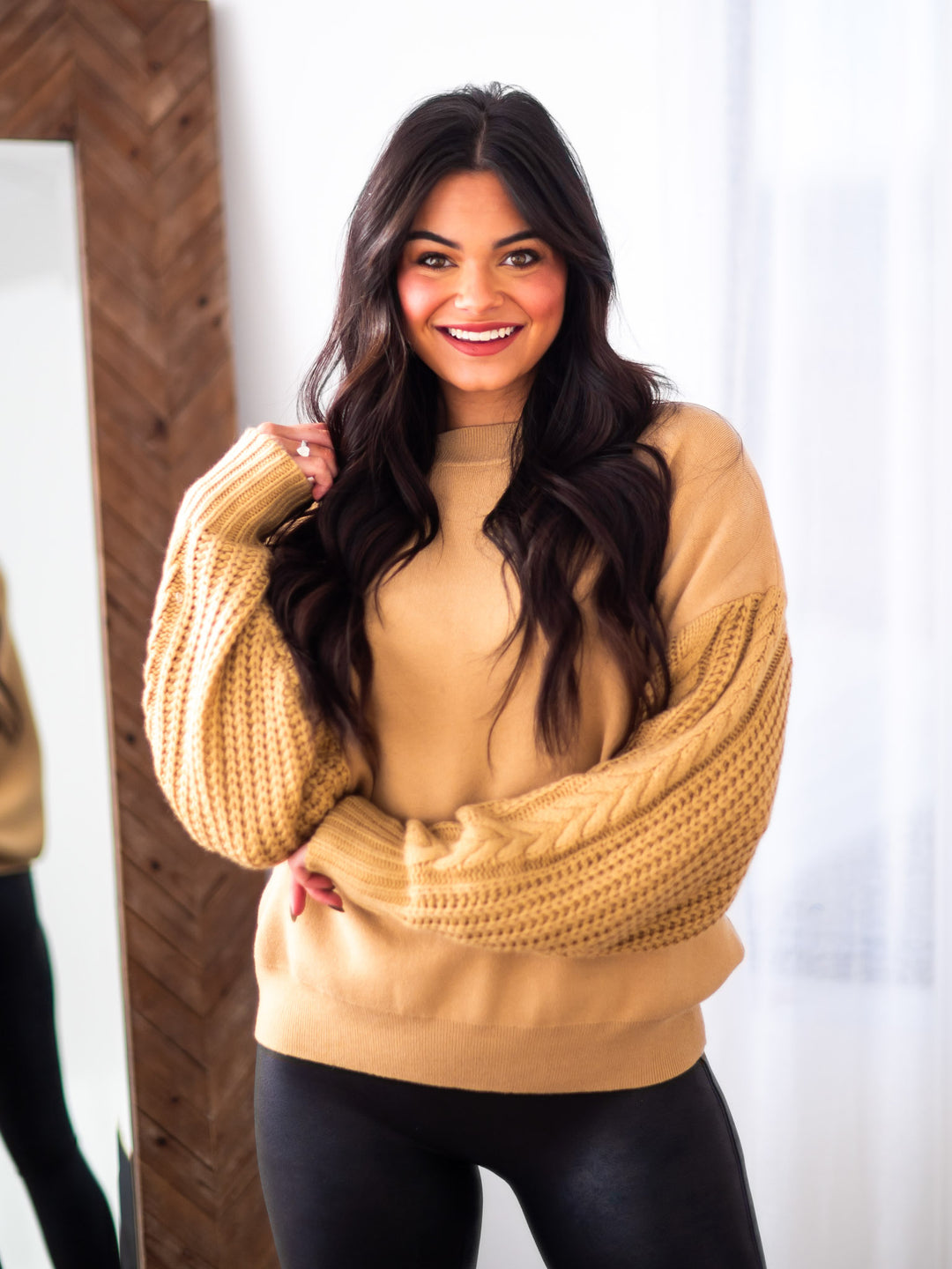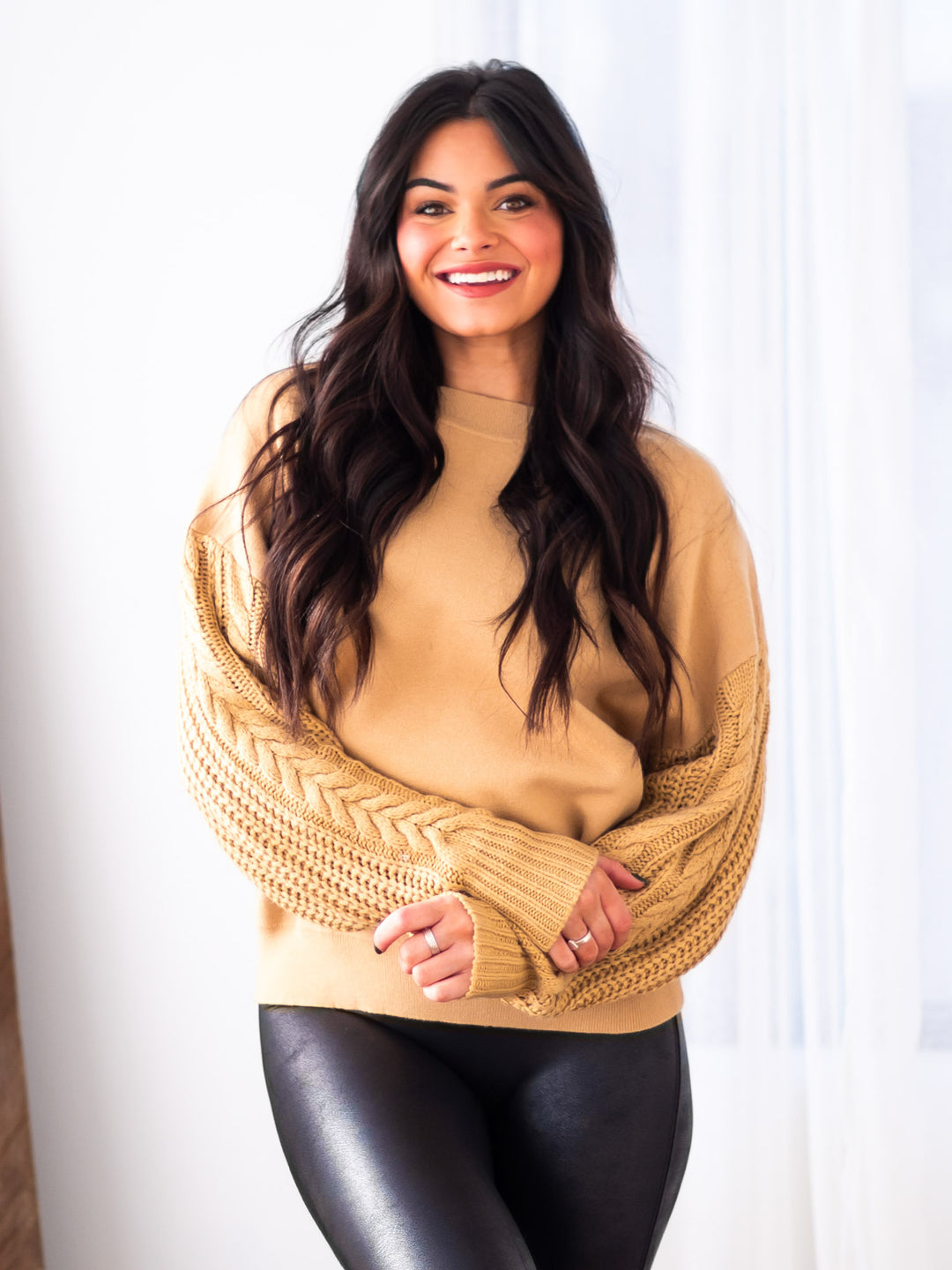 Bring some drama-free comfort to your wardrobe with our No Drama Cable Sleeve Sweatshirt! With a round neckline, drop shoulders, and relaxed fit, it's like a warm hug you can wear anywhere. Treat yourself and throw some chill vibes into the mix. No muss, no fuss.