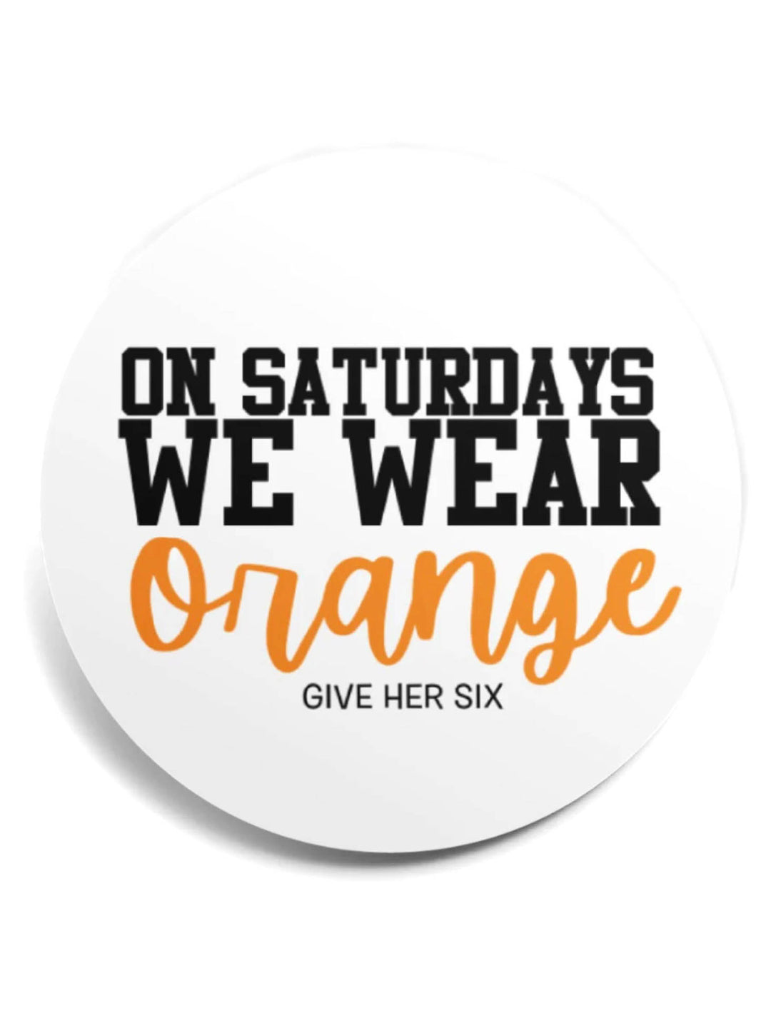 Get a little school spirit with this On Saturday’s We Wear Orange button! The Tennessee Volunteers will look (and sound) great with this pin, featuring a unique design that will have you screaming "Go Vols!" in no time. Perfect for any proud fan!