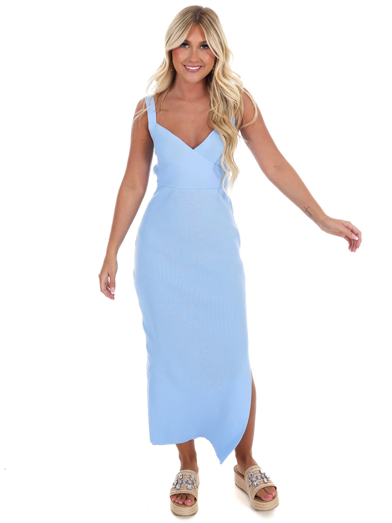 Elevate your style with our Open Invitation Ribbed Midi Dress! Featuring a solid ribbed front with a flattering overlap v-neckline, this dress also has an open back and side slit detail for a touch of allure. Made from cozy sweater knit, it's perfect for any occasion.