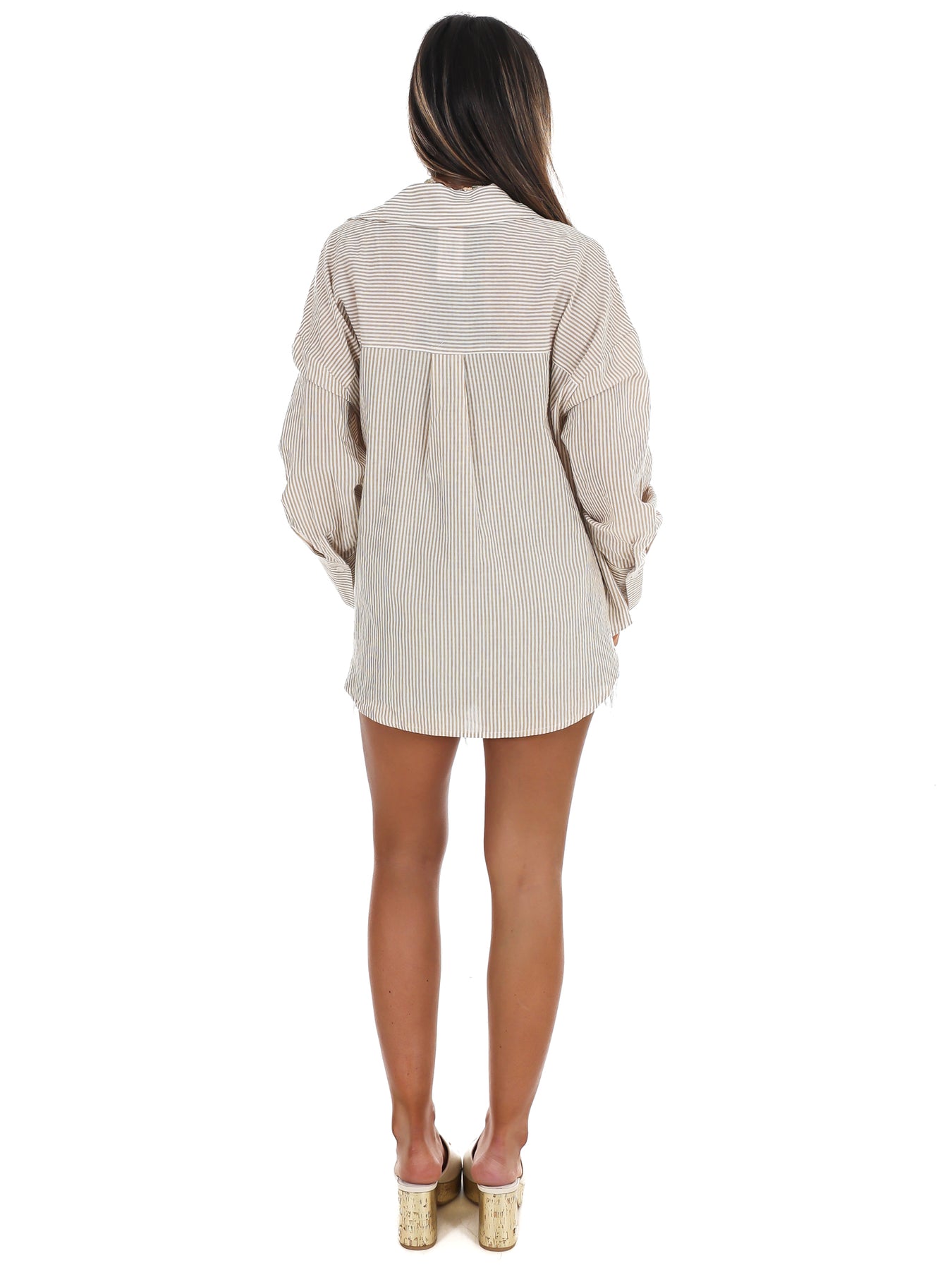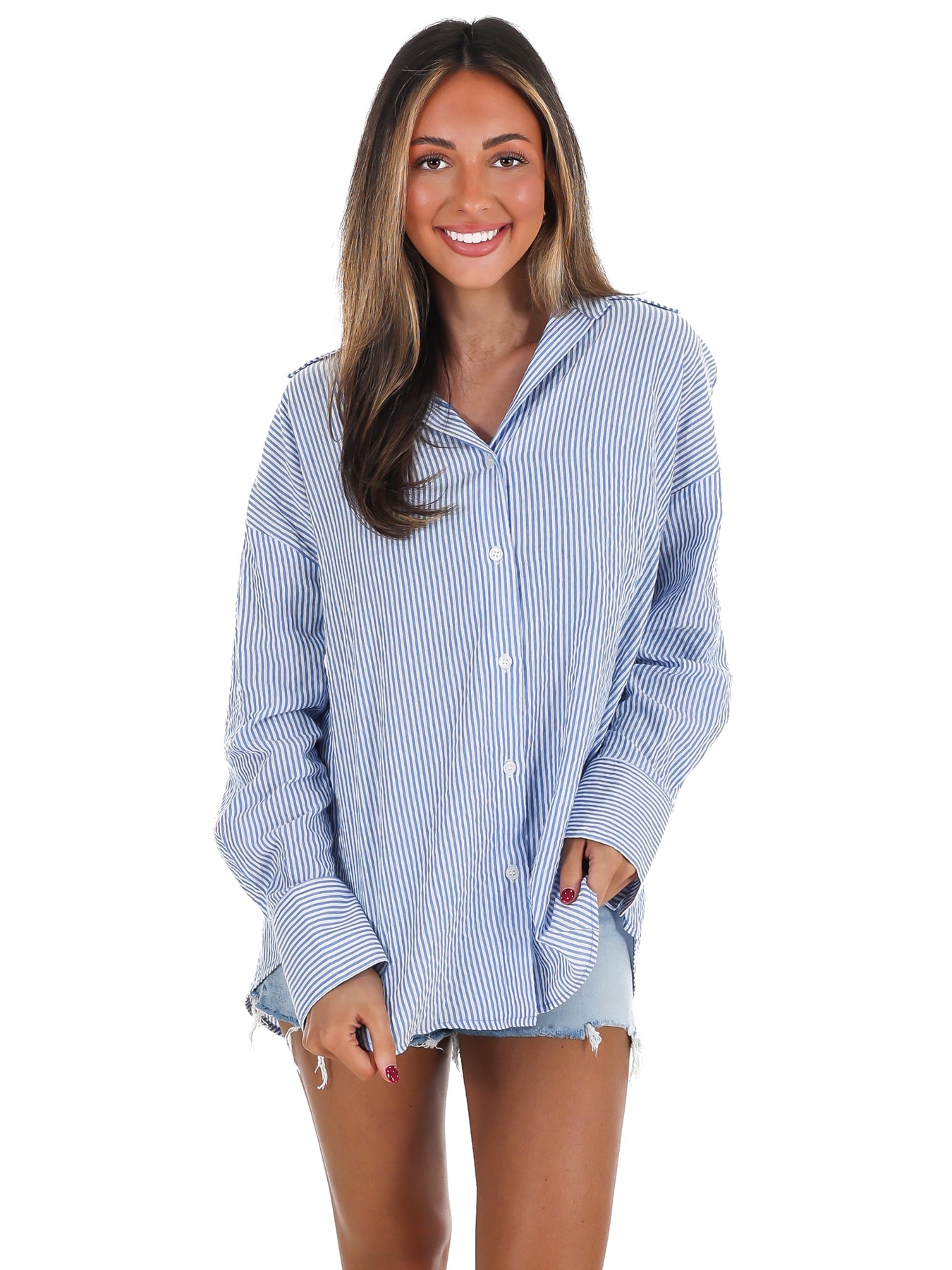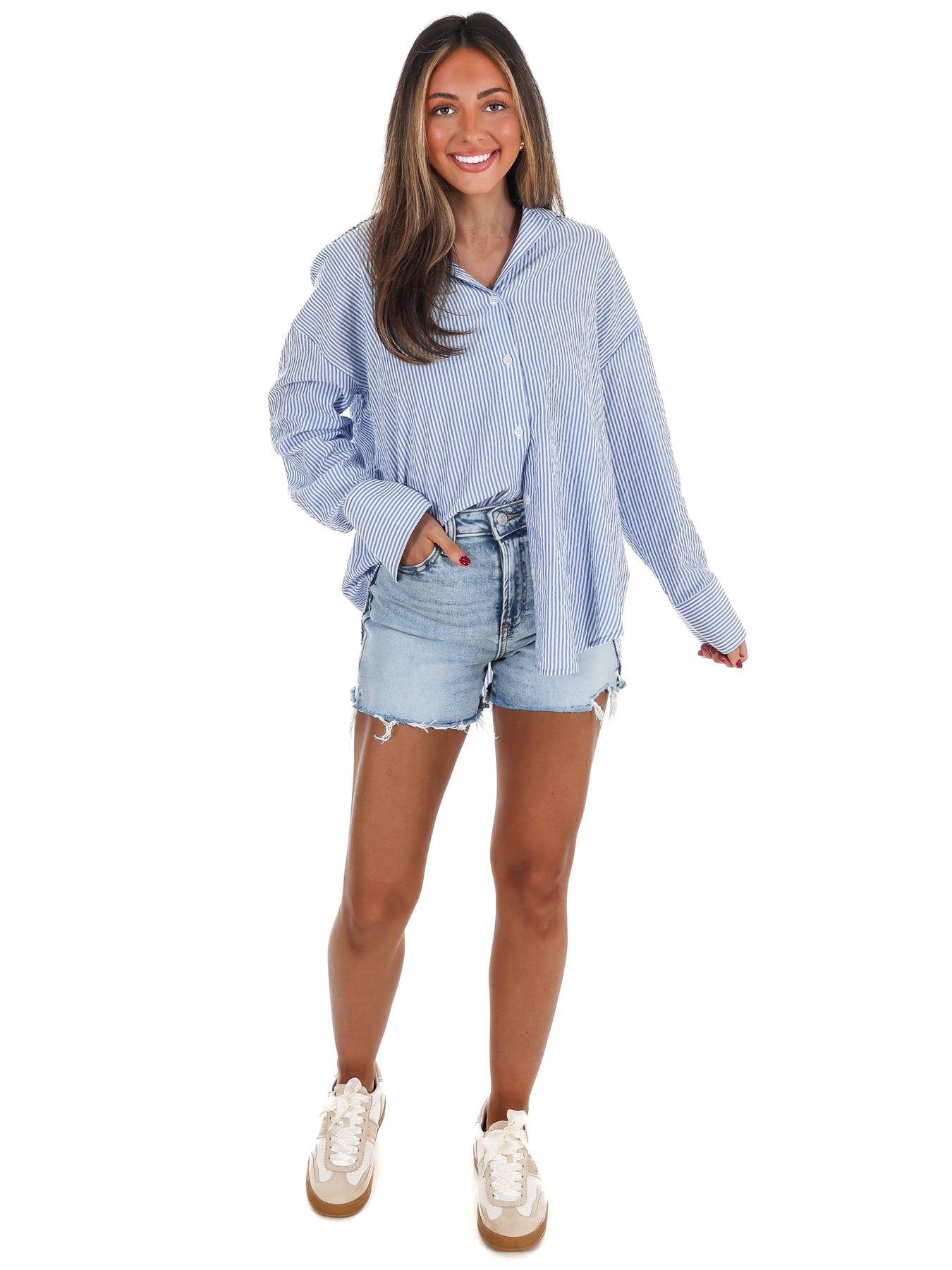 Meet your new go-to shirt—the one that makes getting dressed actually fun. This striped button-up combines a breezy, oversized fit with thoughtful details like a sharp spread collar and horizontal stripes that flatter your frame. The soft, lightweight fabric feels like a dream, while generous long sleeves and extended cuffs keep things interesting. Throw it on with tailored shorts and loafers for a vibe that's effortlessly put-together without trying too hard.