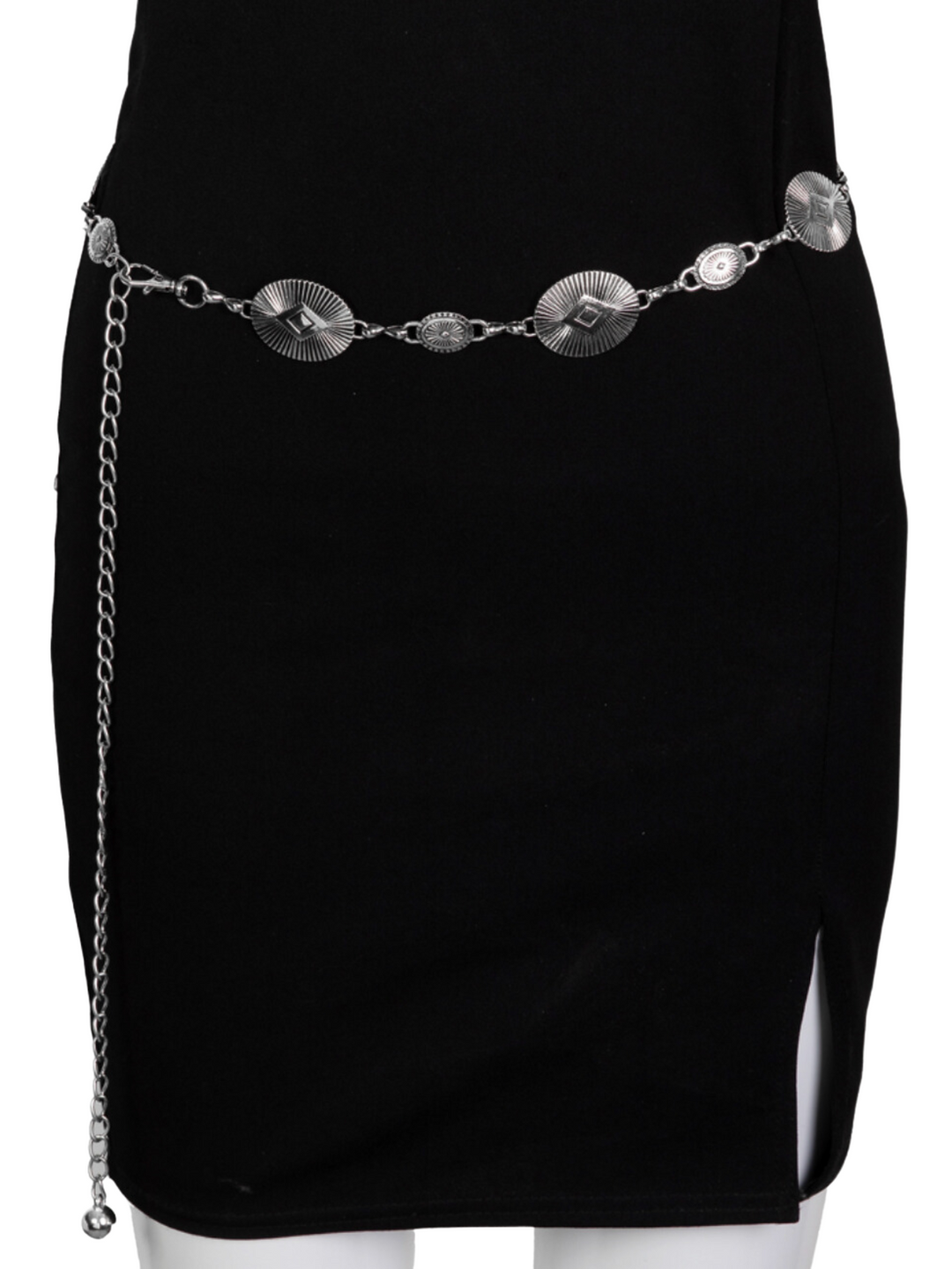 Add a bold statement to your outfit with the Oval Disc Chain Belt. This unique belt features an oval disc chain design that will bring a touch of playful charm to any look. Made from durable materials, it's perfect for both casual and dressy occasions. Upgrade your accessories game today!