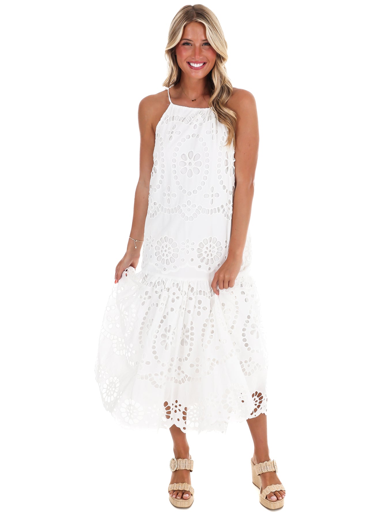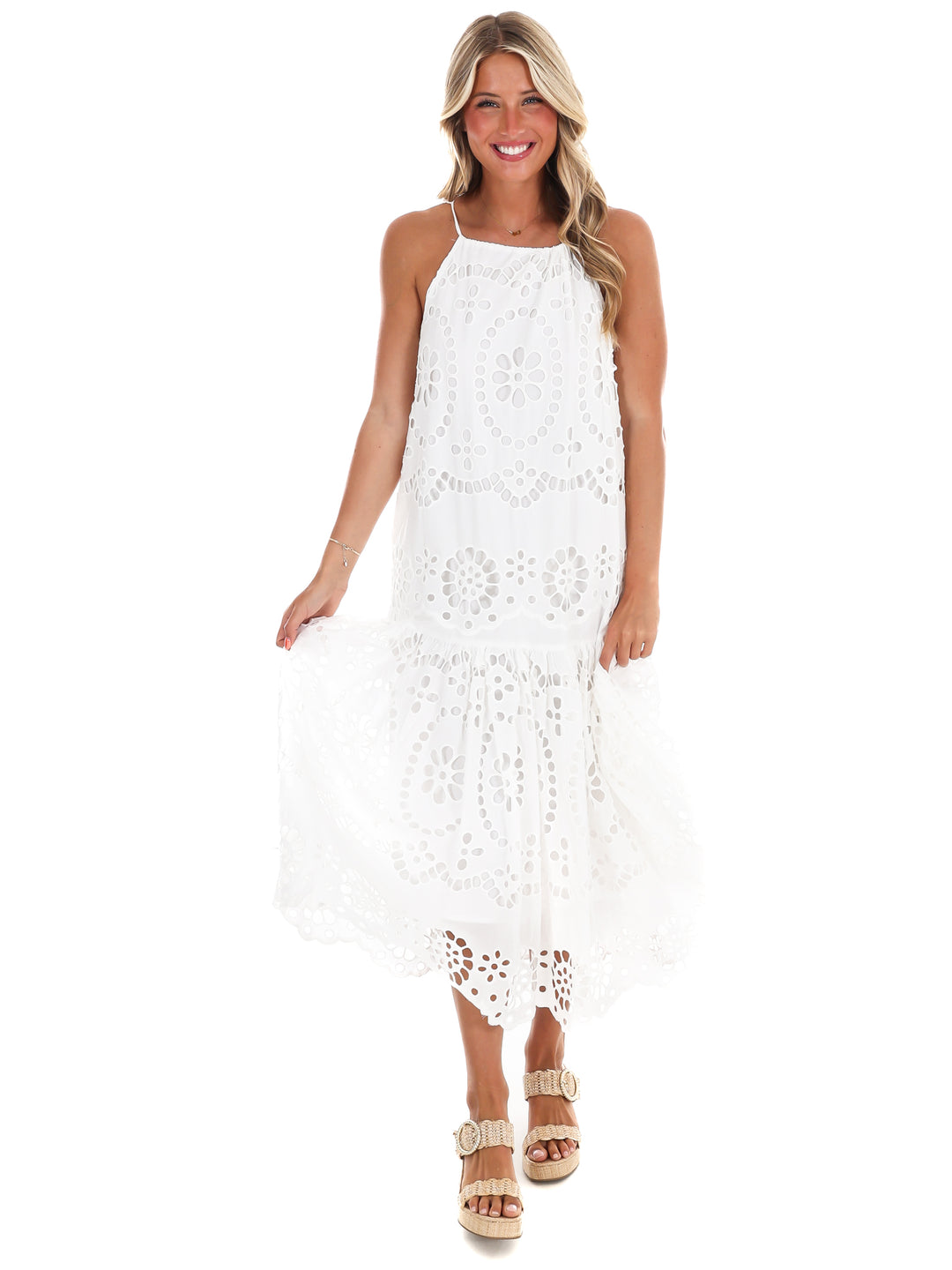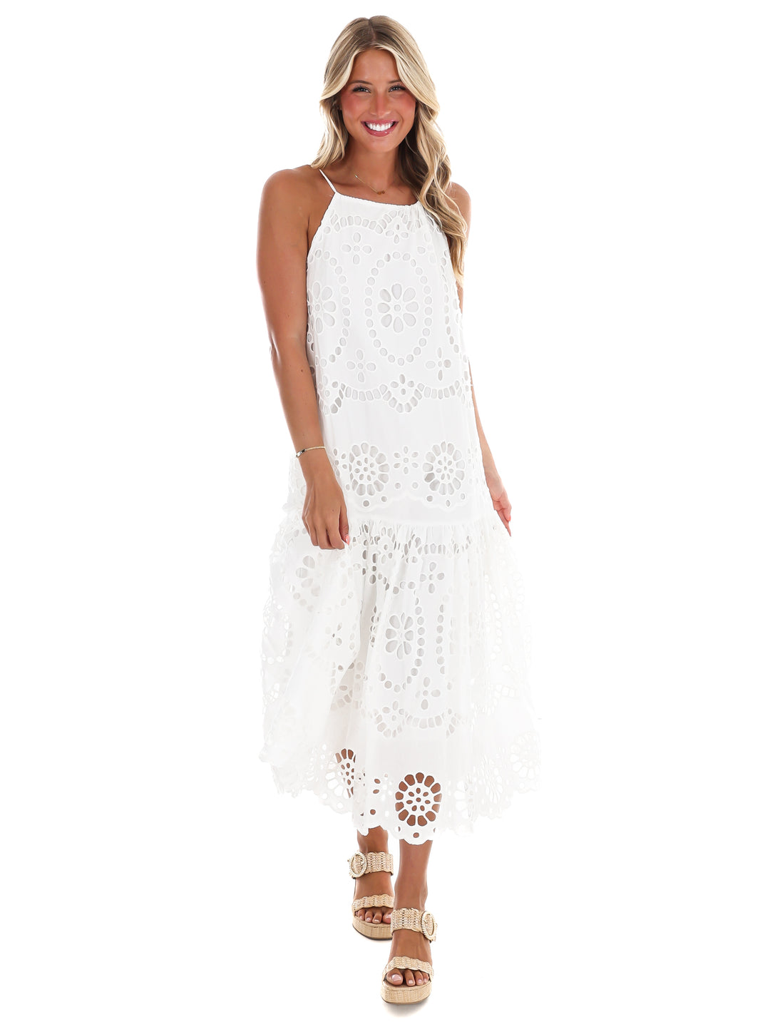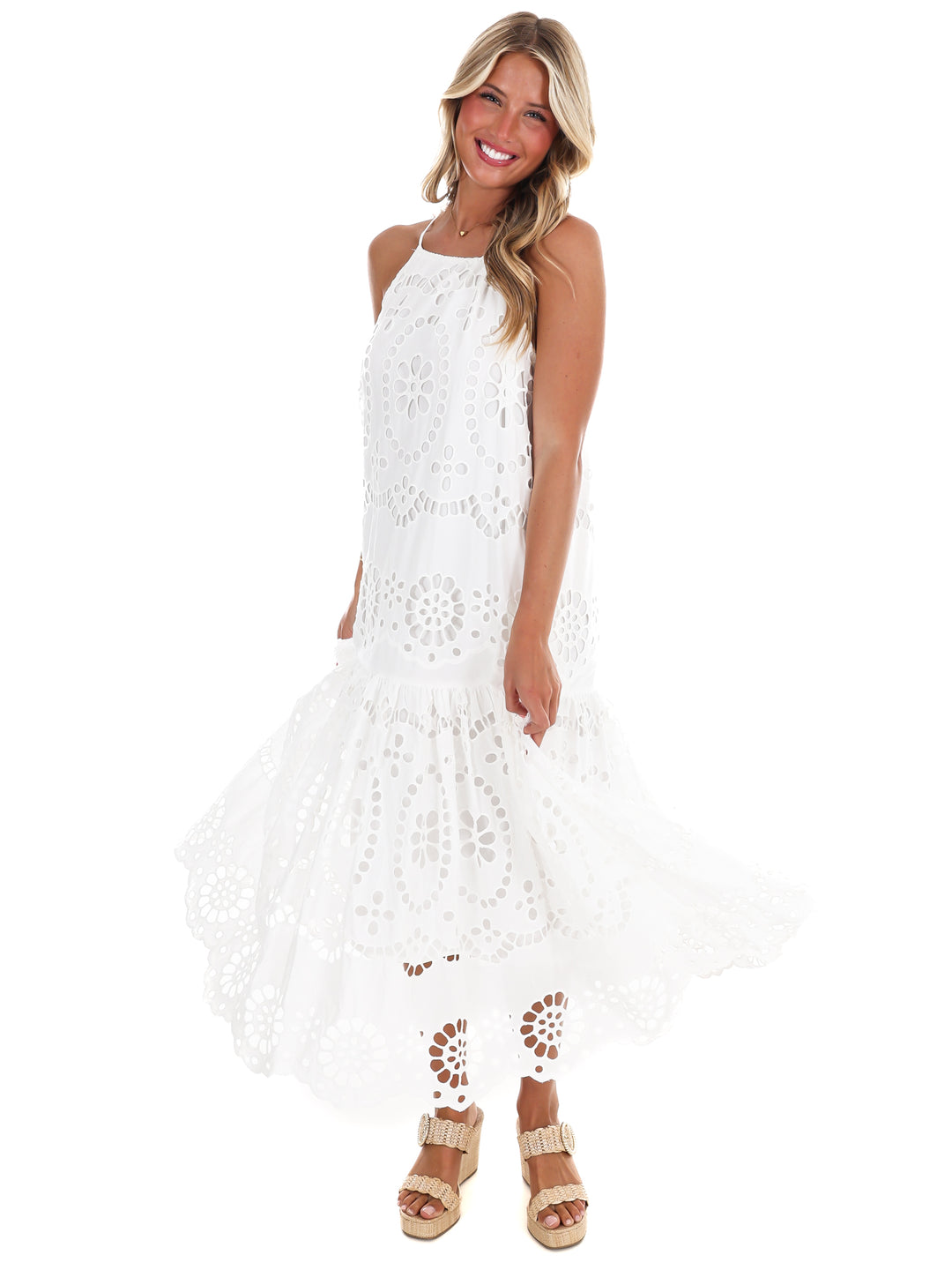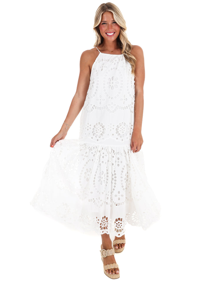 This timeless eyelet maxi dress is perfect for any occasion. The delicate tiered detailing and intricate eyelet patterns add texture and visual interest, while the high-neck silhouette exudes sophistication and comfort. Whether for casual outings or semi-formal gatherings, this dress is a versatile and elegant choice.