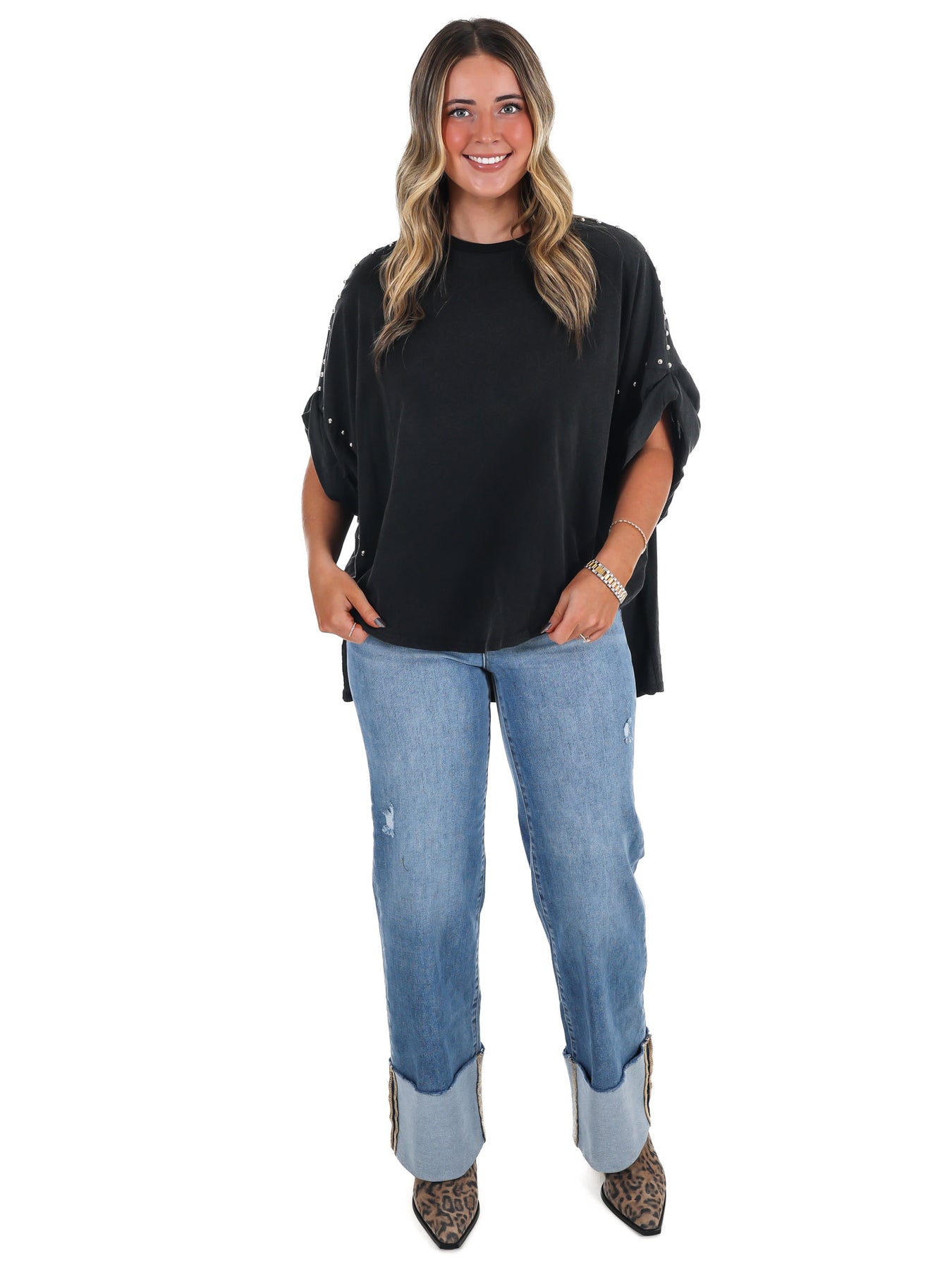 Stud your style with the Right Now Studded Top. This oversized top features rolled sleeves and a high low hem, all in a garment washed finish for ultimate comfort. No need to wait, this top is for the here and now (and it looks fabulous)!